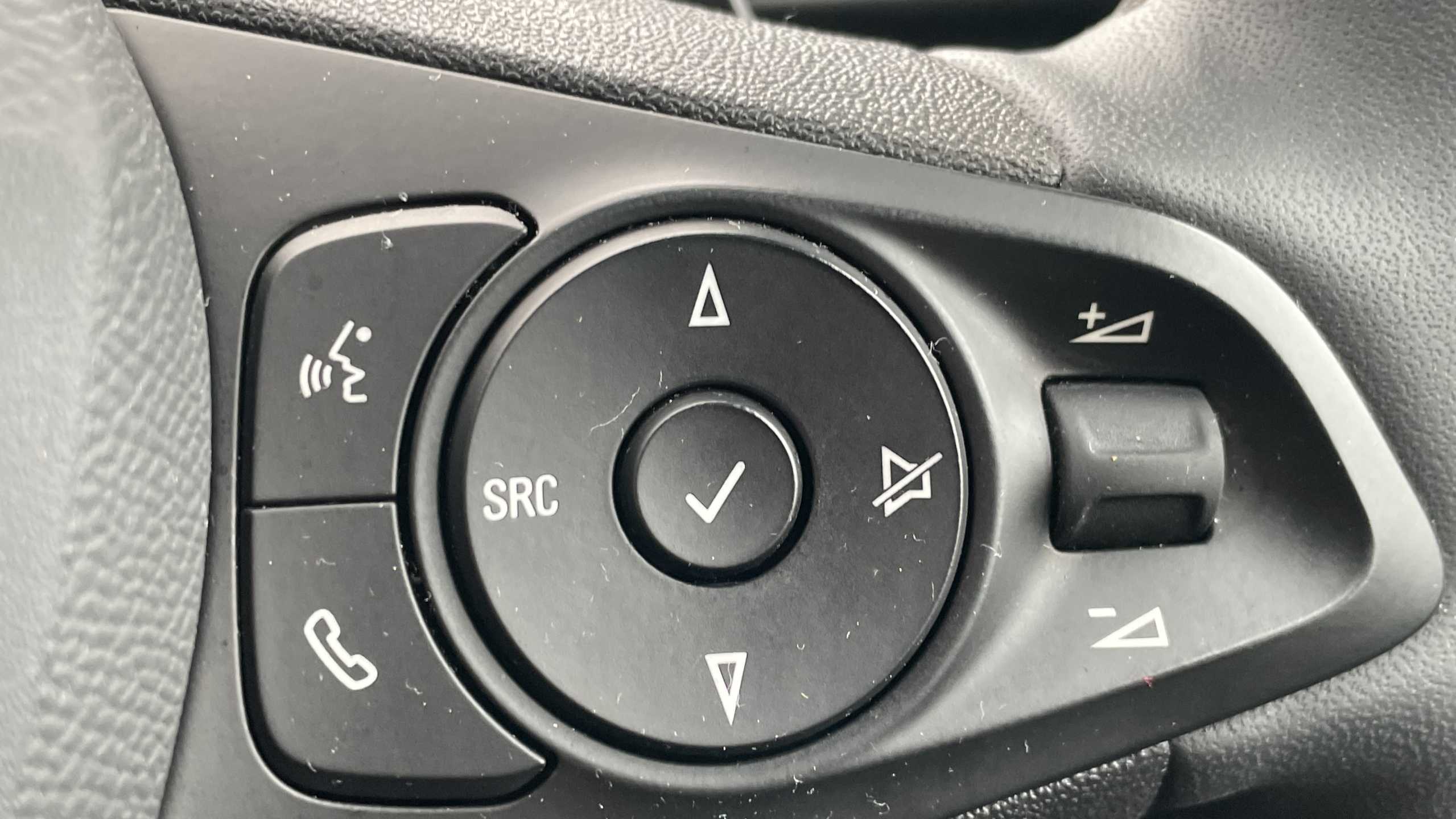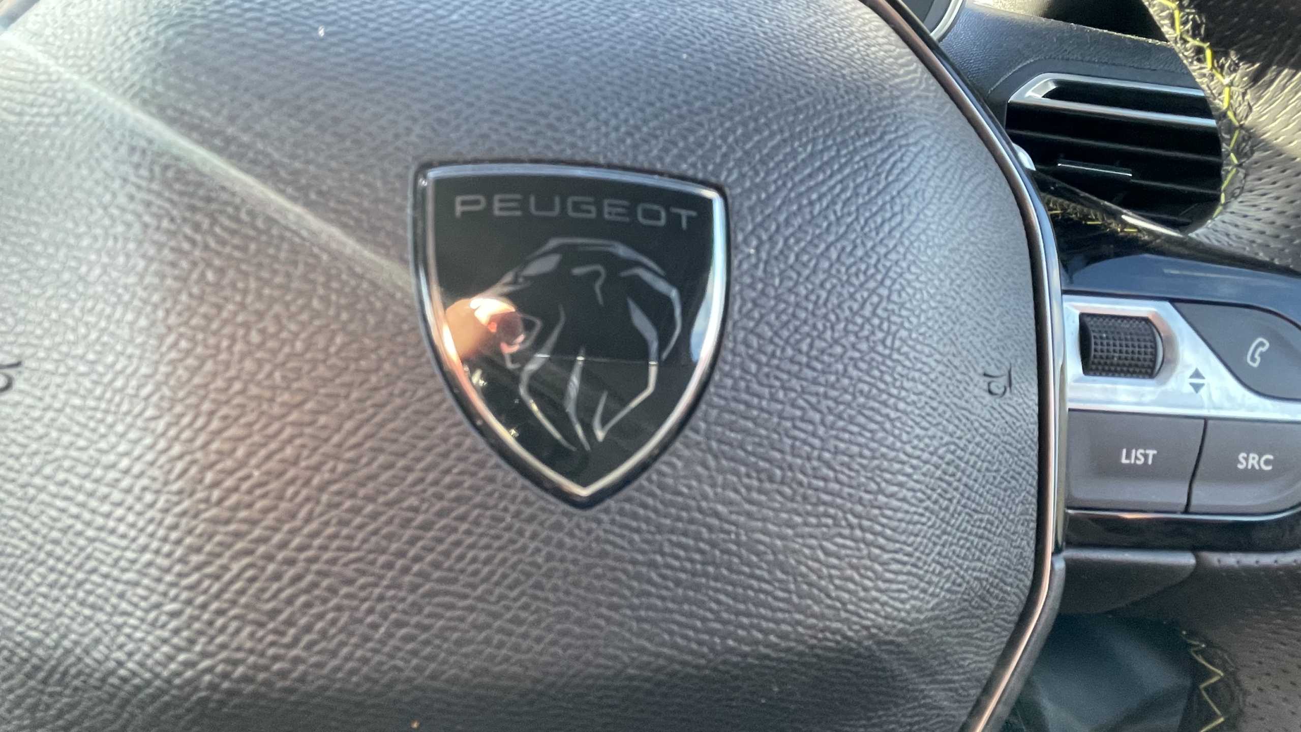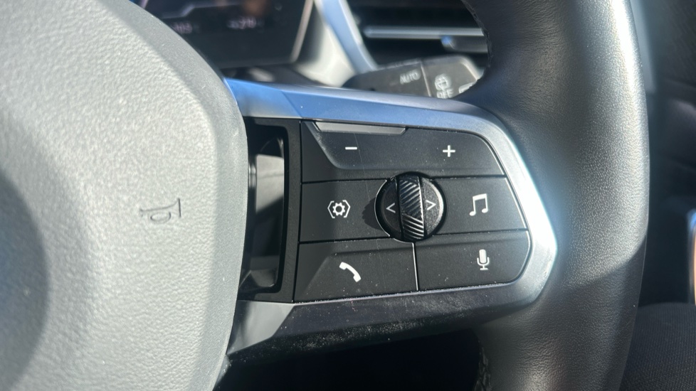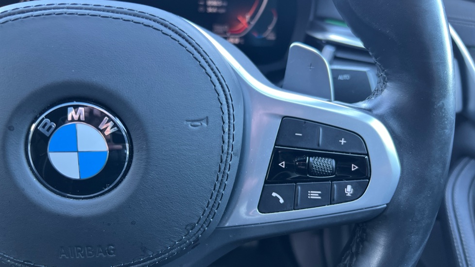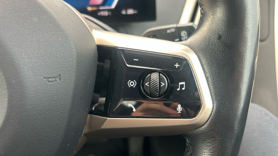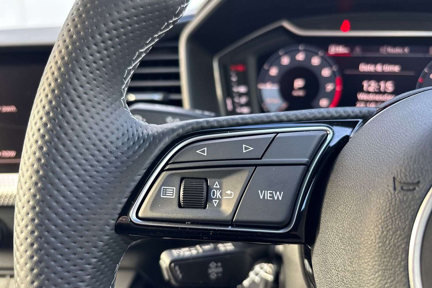 "Leather steering wheel with gloss black + satin chrome elements and audio/telephone controls",