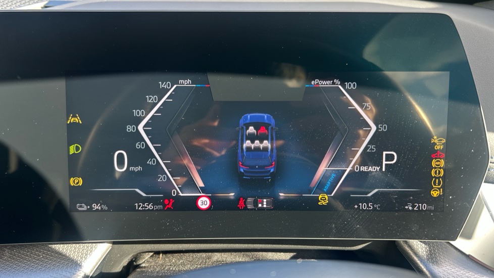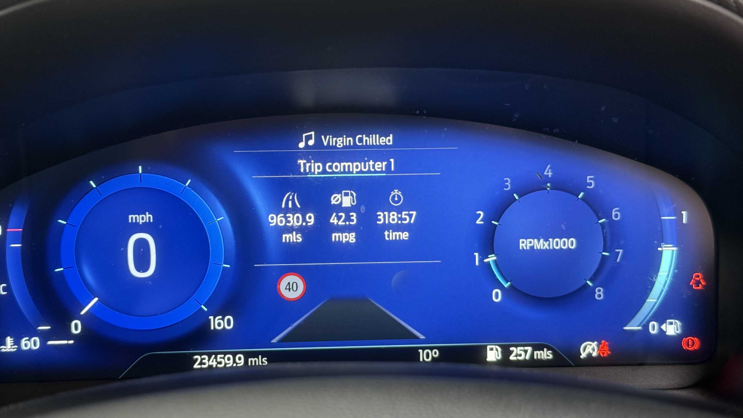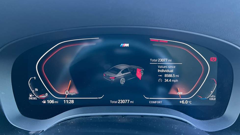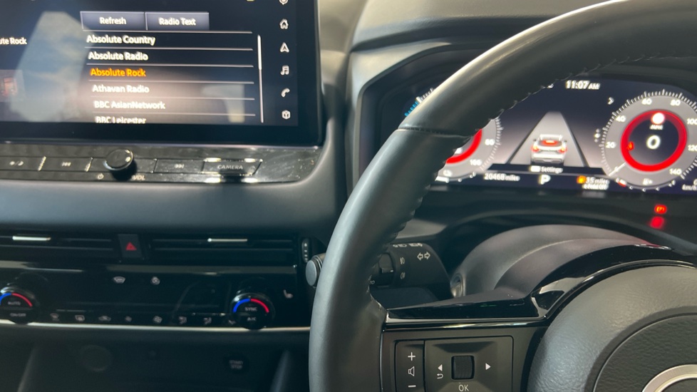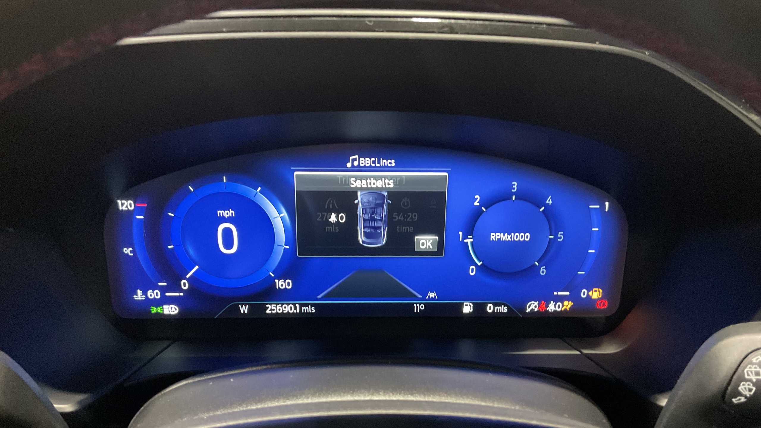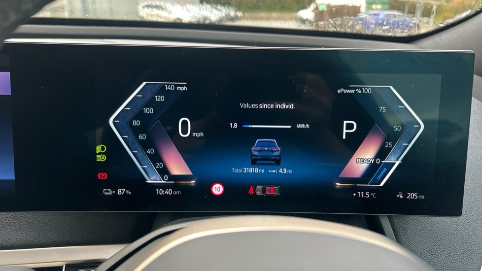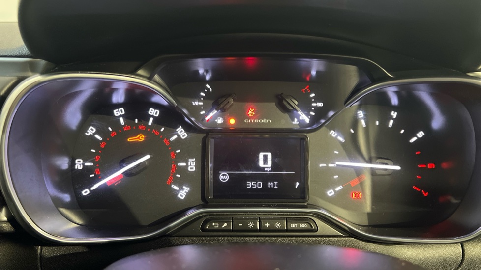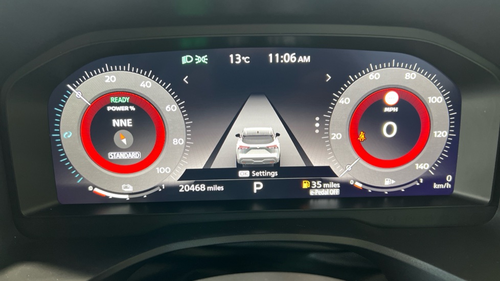 "Satin chrome surround instrument cluster with white LCD and analogue gauges",