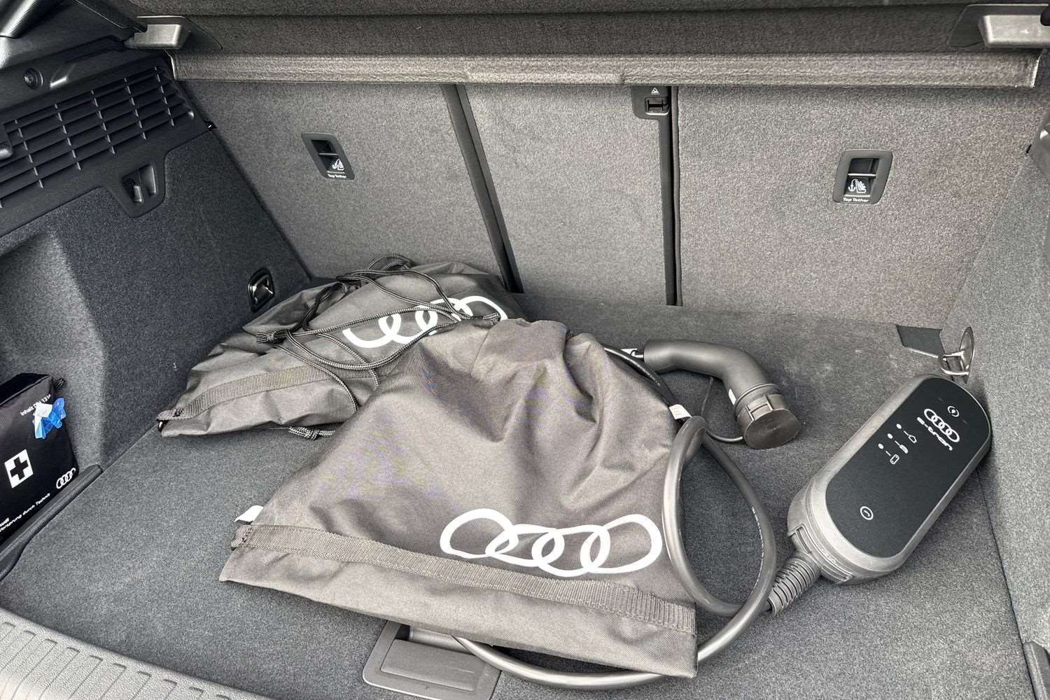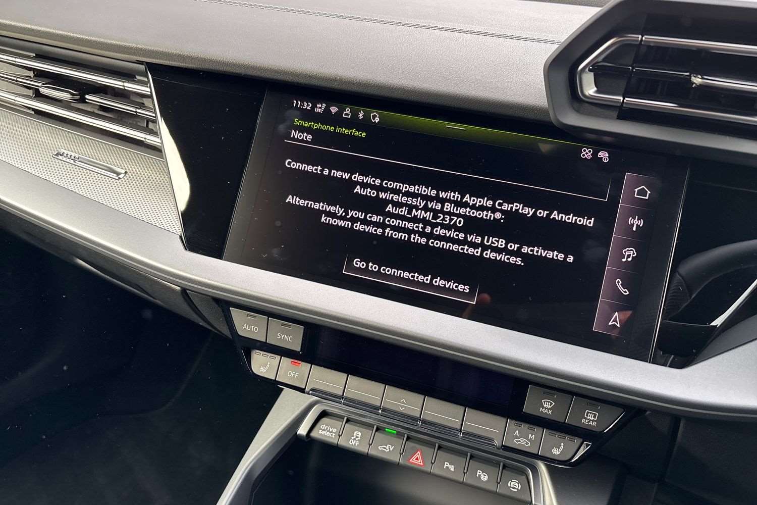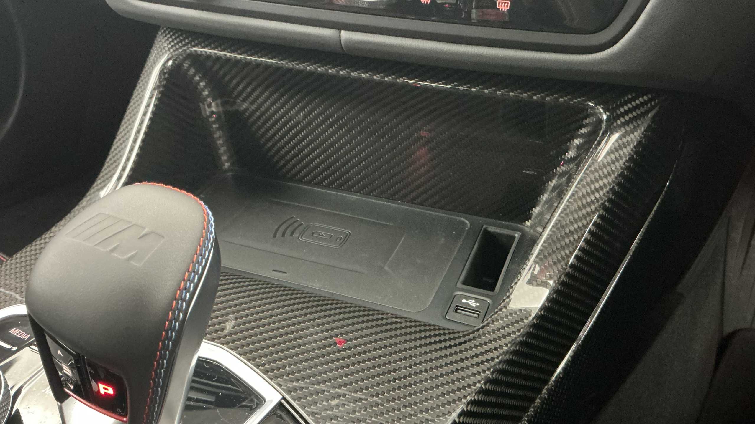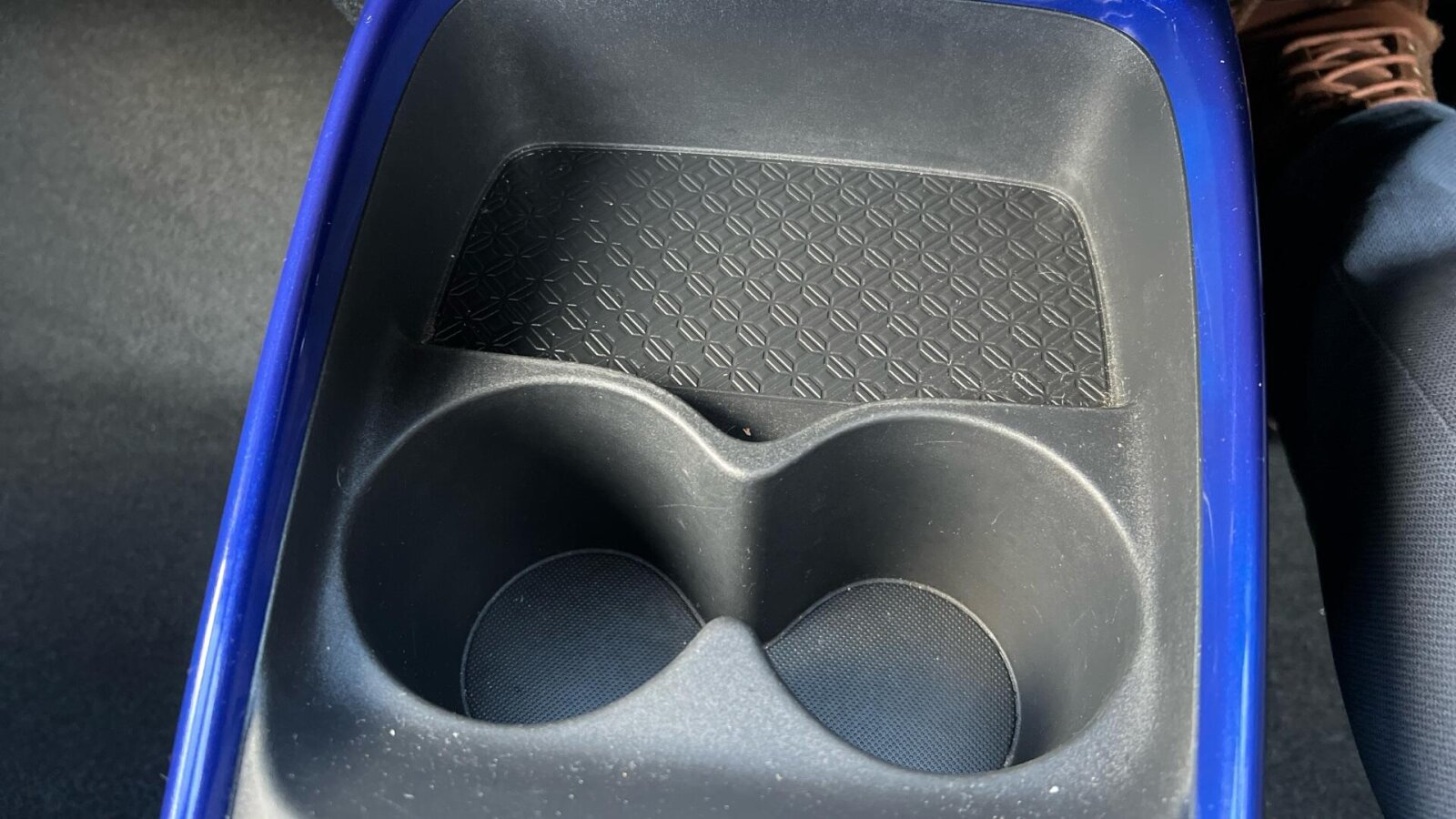"Storage space under touchscreen with rubber mat",