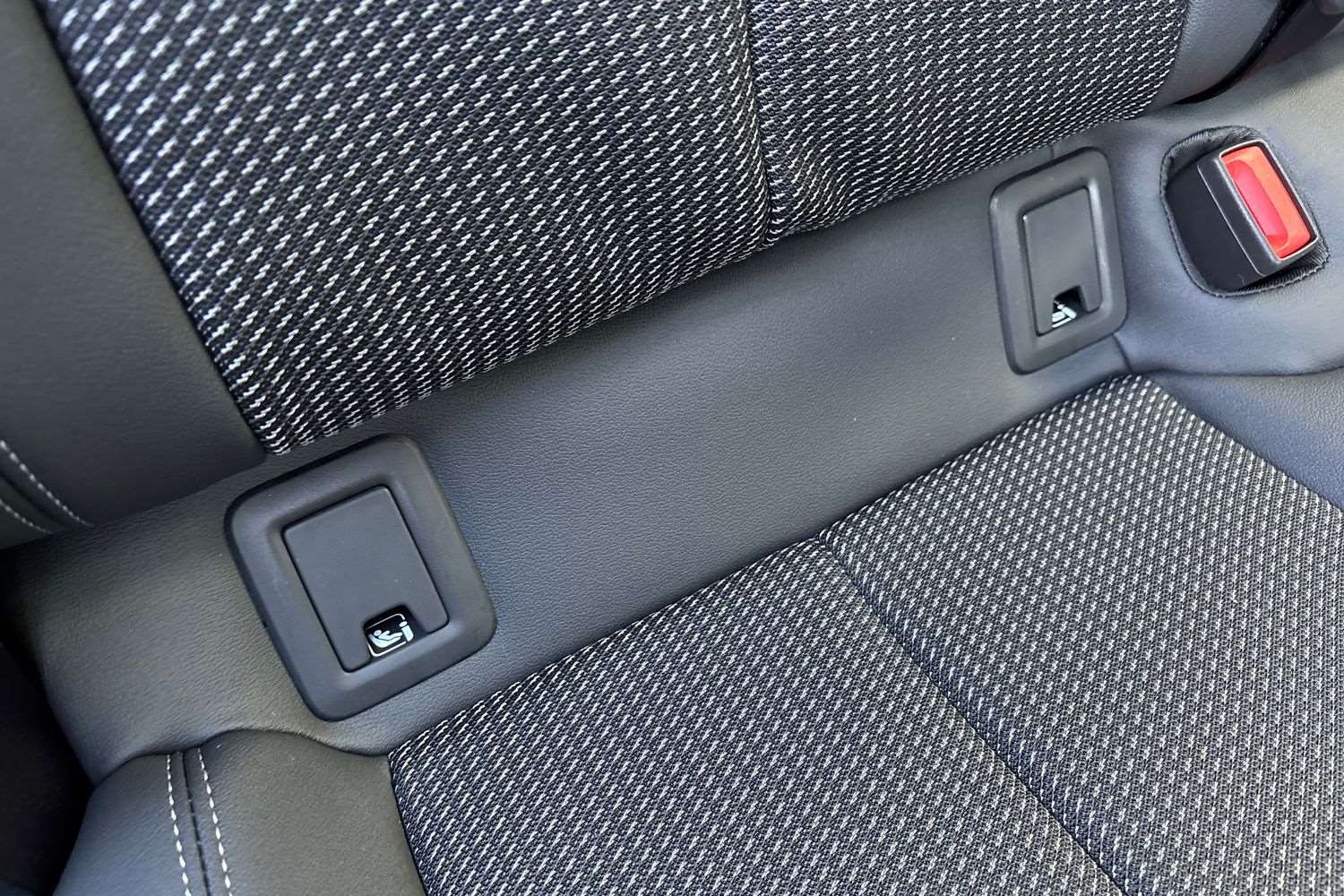 "ISOFIX mounting on outer rear seats with top tether and labels indicating fixing points",