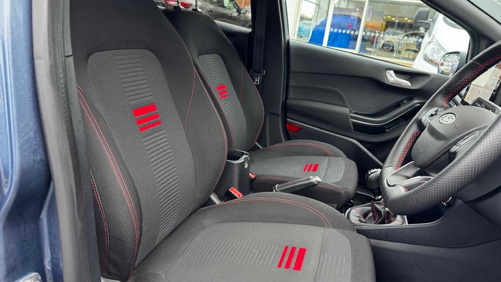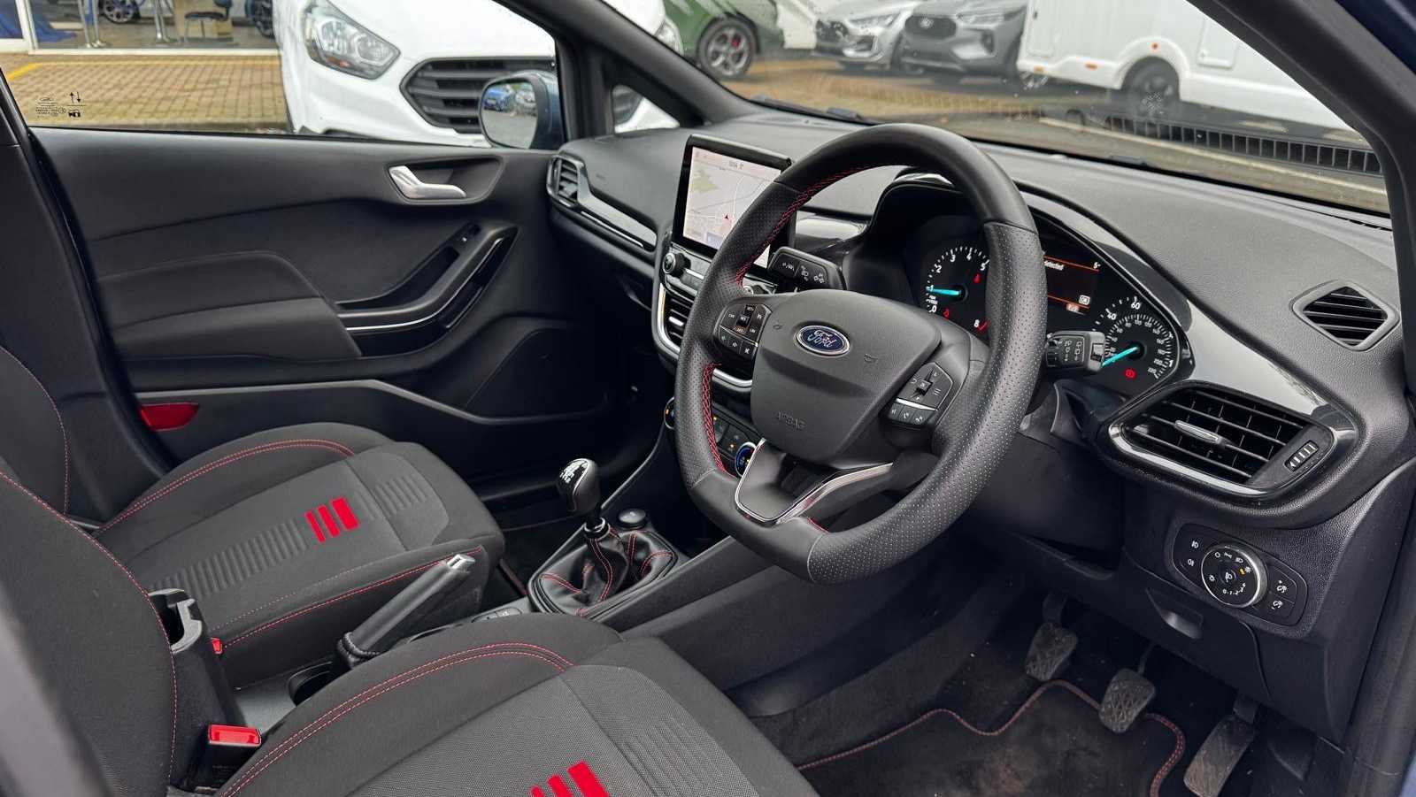"features": "Bluetooth system, Electric power steering, Ford easy fuel, Ford SYNC 3 Navigation system incl 8\" touchscreen, 7 speakers, FordPass connect, Apple carplay, android auto, voice control and emergency assistance, Rear parking distance sensors, Selectable drive modes (Normal, Sport, Track), Trip computer, Sports suspension, 2 USB ports, Auxiliary input socket, DAB Digital radio, Steering wheel mounted controls, Body colour bumpers, Body colour door handles, Body colour large rear spoiler, Body coloured electrically operated and heated door mirrors with side indicators, Cornering front fog lights, Electric front windows/one touch facility, Electric rear windows, LED Night signature to rear lights, Quickclear heated windscreen, Rain sensing wipers and auto dimming rear view mirror, Rear privacy glass, Rear wiper, Unique ST-Line upper grille & full bodystyling kit with ST-Line wing badges, 3 spoke flat bottomed leather steering wheel, 60/40 split folding rear seat, Adjustable head restraints, Black headlining, Boot carpet, Centre console with opening armrest, 2x cupholders, 12v and USB, Chrome inner door handles, Cloth upholstery, Footwell illumination, Front floor mats in velour, Front map reading lights, Front seat and rear pockets, Illuminated glovebox, Leather gaiter, Load area light, Manual 2 way passenger seat adjust, Manual 4-way driver seat adjust, Manual air conditioning, Overhead console with sunglasses holder, Pollen filter, Rake/reach adjustable steering wheel, Sensico wrapped steering wheel, Sports front seats, NCAP Pack - Fiesta, 3 point seatbelts on all rear seats, ABS+EBA, Curtain airbags, Driver and passenger airbags, Drivers knee airbag, Electronic stability control with hill start assist, Front passenger airbag deactivation, Front side airbags, Seatbelt warning, Two tone horn, Tyre pressure monitoring system, Keyless start with 'Ford Power' starter button, MyKey system, Remote central locking & engine immobiliser, Thatcham Cat.1 alarm, 17\" 5 spoke alloy wheels with rock metallic finish, ",