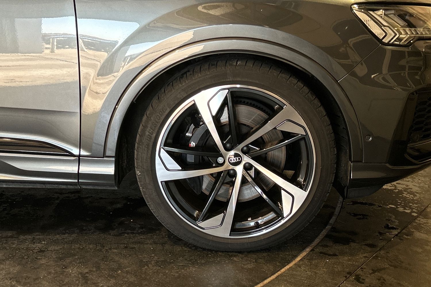 "22\" 5 arm trapezoid design audi sport alloy wheels in anthracite black with gloss turned finish",
