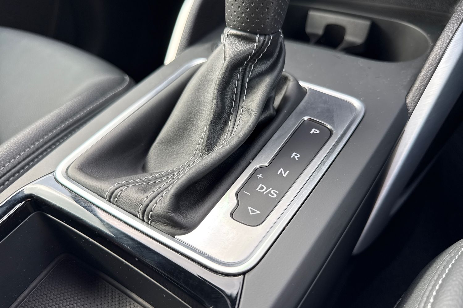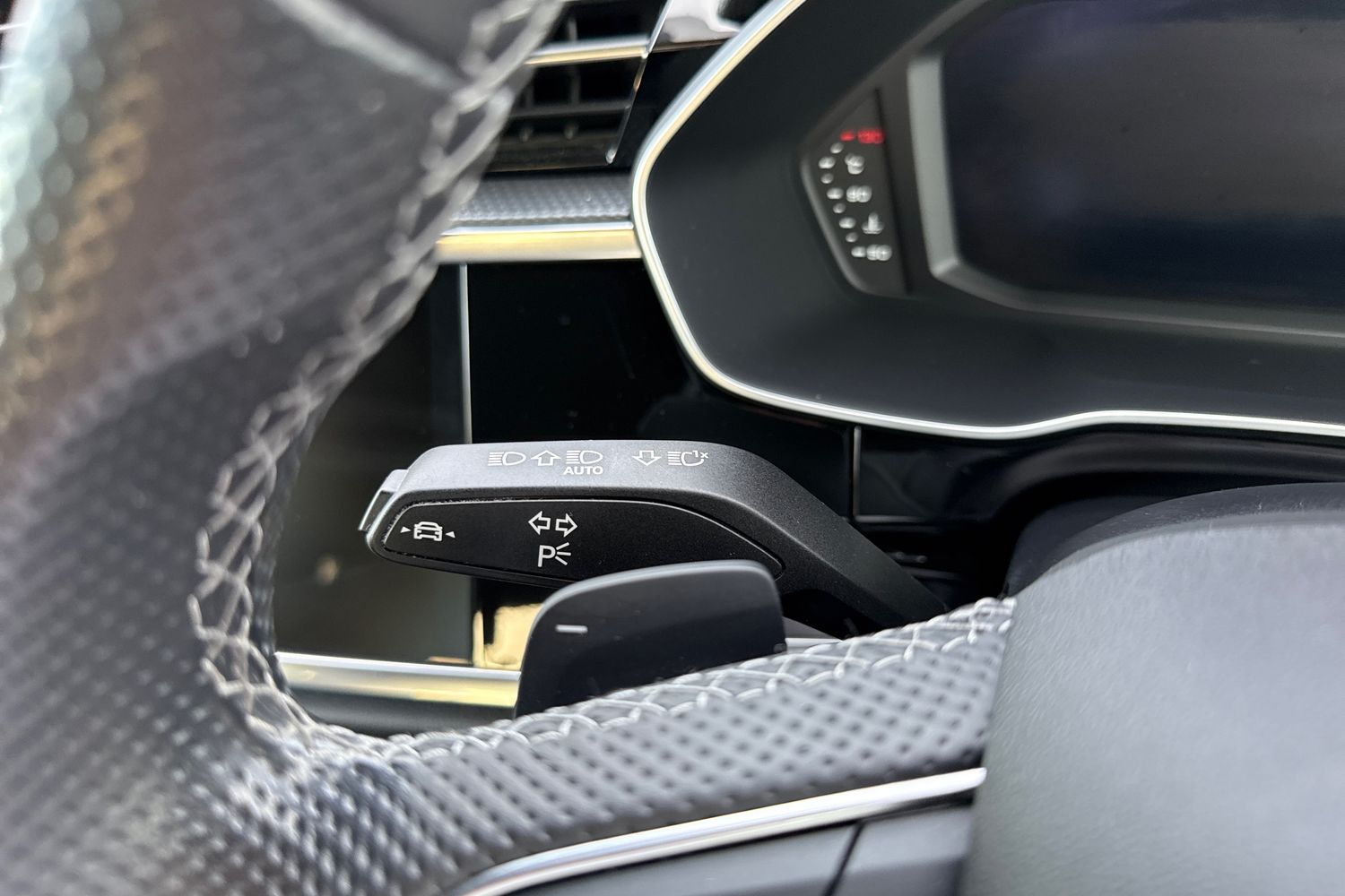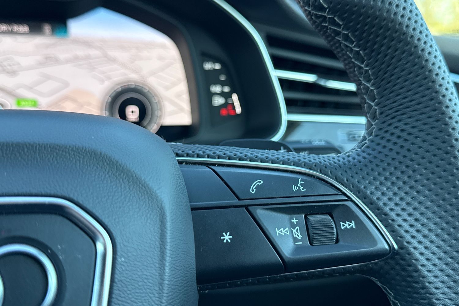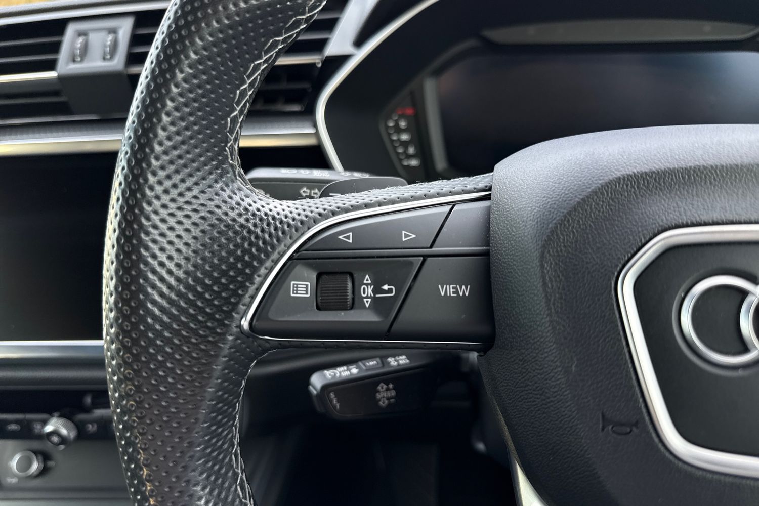 "3 spoke leather multi-function plus steering wheel features S badging and grips in perforated leather with contrast stitching",