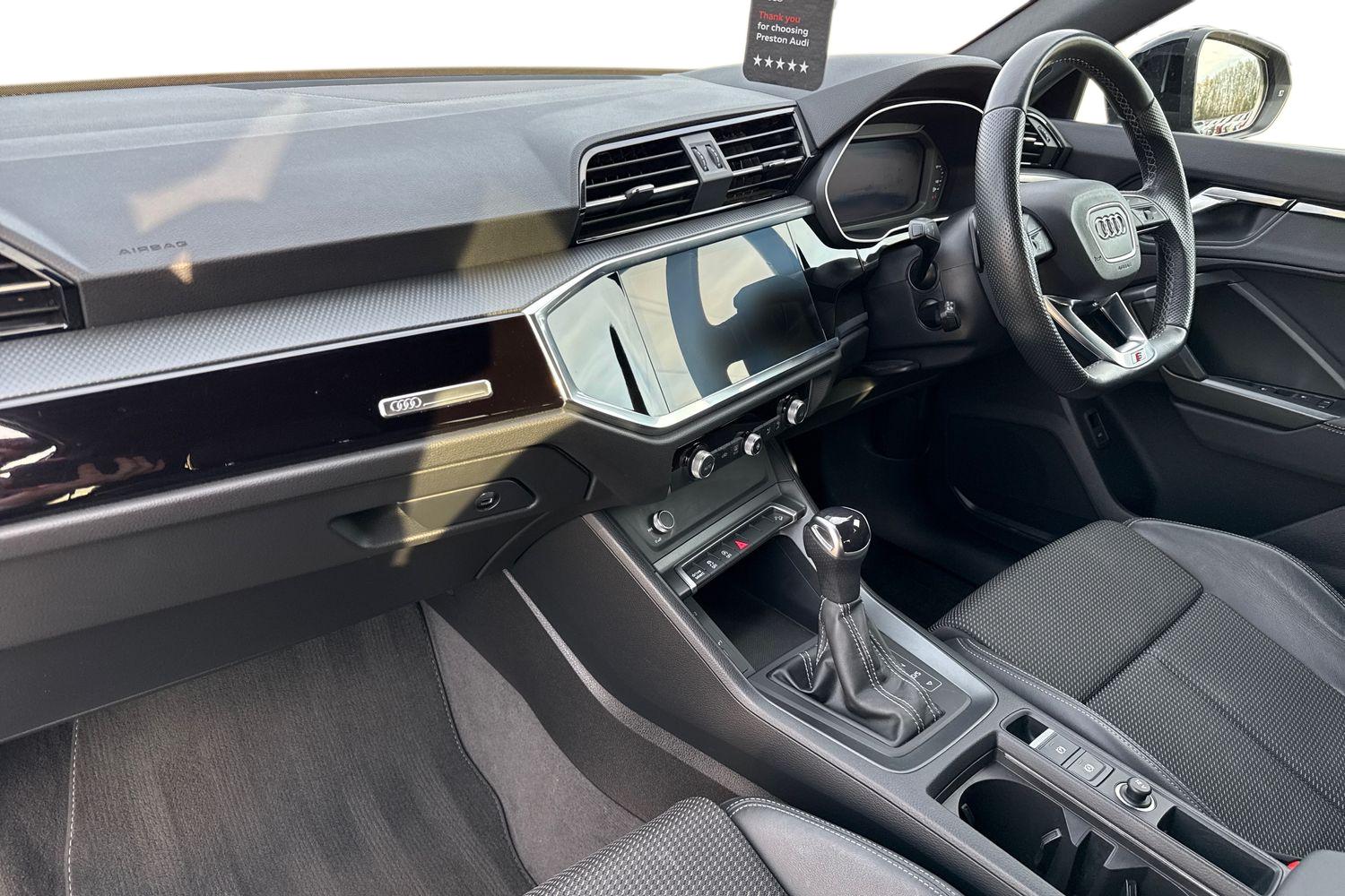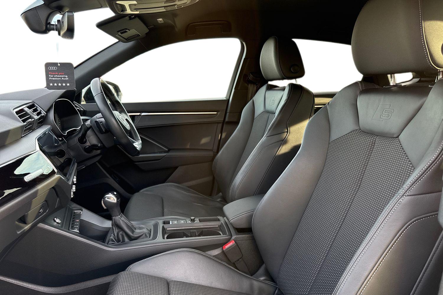 "features": "10.25\" Digital instrument cluster display classis style instrument dials + speed,odometer,time,outside temperature,telephone menu + fuel level warning, Audi smartphone interface with connect compatible smartphone via USB directly MMI display + Nav,music, third party apps controlled via MMI controller, Automatic start/stop system, Bluetooth interface, Cruise control, Driver's information system, Electromechanical power steering, Emergency e-call, Emergency services call system, Lane departure warning system, Service interval indicator, Speed limiter, Voice control system, Washer fluid level indicator, Sports suspension, 1 x SDXC card reader, 2 x USB type C connection points, DAB Digital radio, MMI radio plus with 8.8\" colour MMI display screen and MMI touch, Auto dimming rear view mirror, Body coloured door mirrors, Door sills with aluminium inlays and S Line logo, Electric front and rear windows, Electrically adjustable, heated, folding door mirrors with integrated LED side indicator, Front side air inlets in grained matt black and C frame in anthracite black, Heat insulating glass windscreen and side windows, Heated rear windscreen, High level LED brake light, LED headlights with LED rear lights + dynamic rear indicators + headlight adjustment and high beam, turning light + LED daytime running lights, Radiator grille and rear diffuser in matt anthracite black, Radiator protective grille frame in matt aluminium silver, Rain and light sensors, Rear fog lights, Rear side wing doors, Rear wing door, Rear wiper, S line badges on front wings, Side front spoiler lips in grained matt black, 12V socket in centre console with two cup holders, 3 rear seats with headrests, 3 seat bench in 2nd row, 3 spoke leather multi-function plus steering wheel features S badging and grips in perforated leather with contrast stitching, 40:60 Split folding rear seat or folded fully, Black cloth headlining, Driver and passenger seat with manual height adjust with forward and backwards adjustment, Front and rear black floor mats with contrast stitching in fine silver, Front head restraints, Front passenger seat, Height and reach adjustable steering wheel, ISOFIX child seat mounting for front passenger and outer rear seats including top tether attachment point of outer rear seats, Leather gear knob with aluminium trim, Luggage compartment light with front and rear reading lights, Manually adjustable lumbar support in front seats, Stainless steel pedals, LED interior lighting pack - A1, Luggage compartment pack - A1, S line exterior styling pack - A1 Sportback, 3x3 point rear seatbelts, Audi pre-sense front with pedestrain and cyclist recognition, Brake assist function, Driver and front passenger airbag with front side and head airbags, Electronic Stability Control including ABS, EBD, ASR and EDL, Front passenger airbag deactivation switch, Hill hold assist, Manual rear child locks, Seatbelt height adjustment for front seats, Seatbelt monitoring, Tyre pressure warning light, Warning triangle and first aid kit, Anti theft alarm, Anti theft wheel bolts and loose wheel warning, Immobiliser, Remote central locking with 2 foldaway keys, Aluminium trim for control switches, air vents and digital instrument cluster, Silver grey inlays polygon structure in diamond paint finish, Structured grey accent areas including air vents, door handle recesses and centre console in quartz paint finish, ",