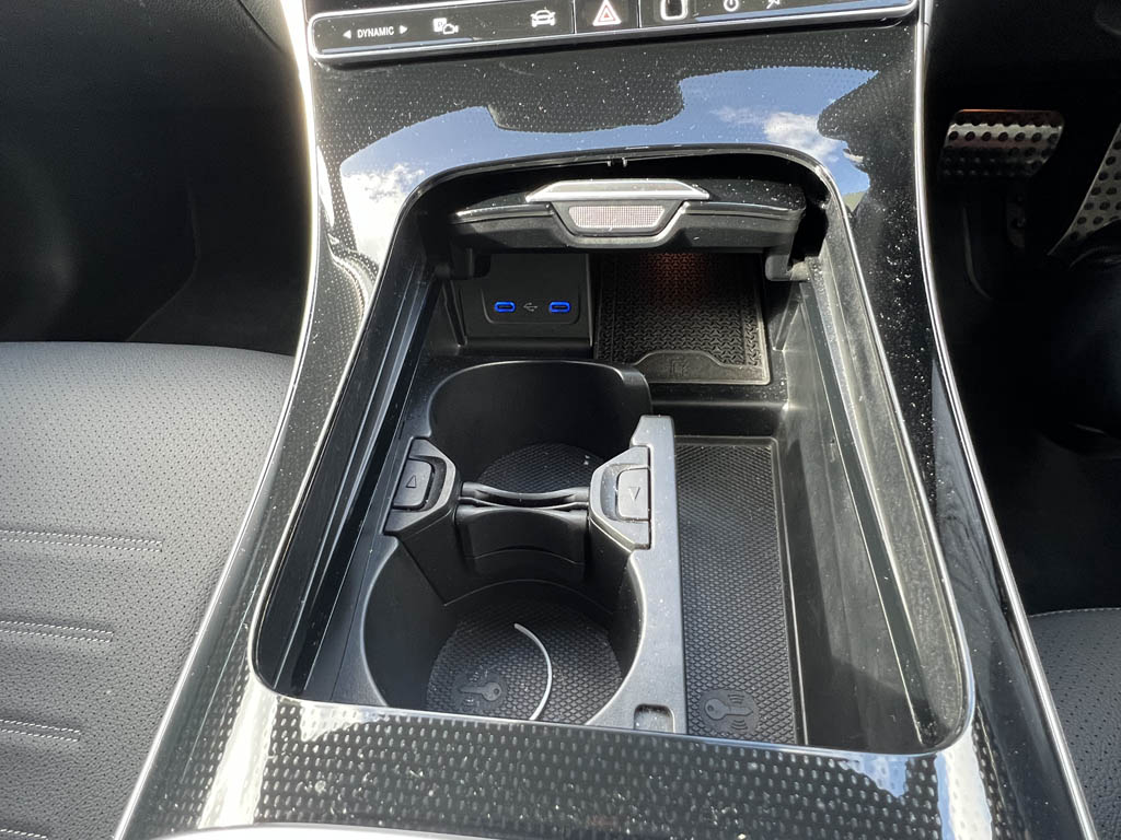 "Load-through provision with cup holder when folded down ('Unsplit rear seat bench, split folding backrest, with centre armrest)",