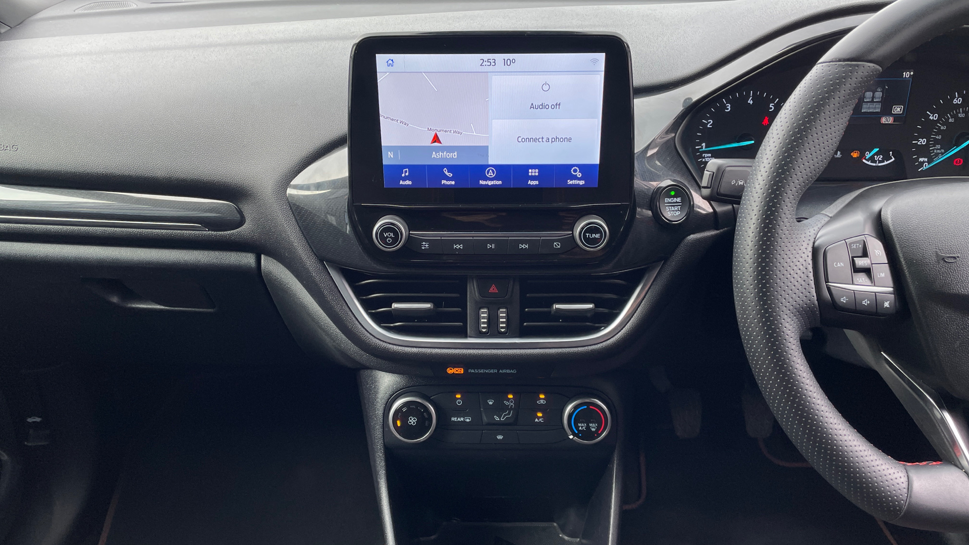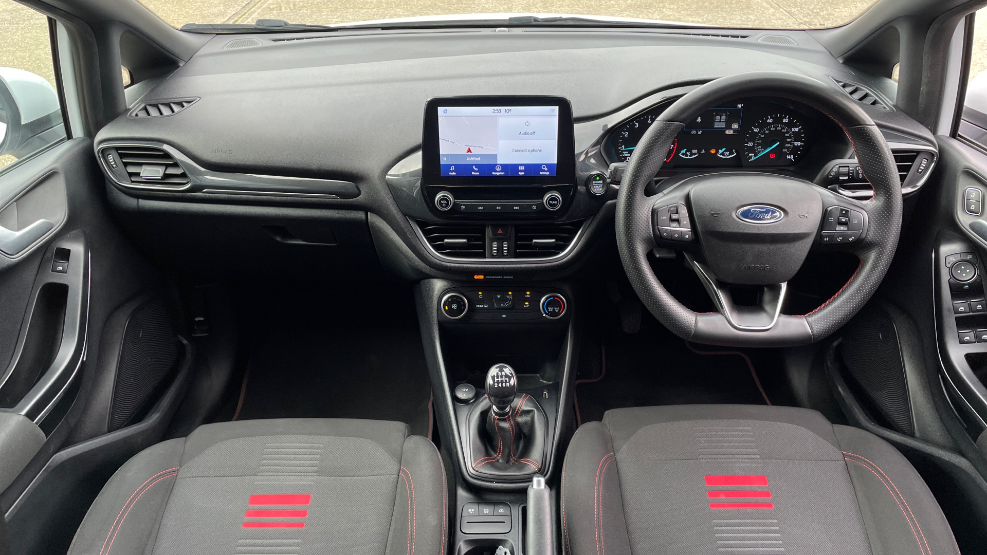 "features": "Bluetooth system, Electric power steering, Ford easy fuel, Ford SYNC 3 Navigation system incl 8\" touchscreen, 7 speakers, FordPass connect, Apple carplay, android auto, voice control and emergency assistance, Rear parking distance sensors, Selectable drive modes (Normal, Sport, Track), Trip computer, Sports suspension, 2 USB ports, Auxiliary input socket, DAB Digital radio, Steering wheel mounted controls, Body colour bumpers, Body colour door handles, Body colour large rear spoiler, Body coloured electrically operated and heated door mirrors with side indicators, Cornering front fog lights, Electric front windows/one touch facility, Electric rear windows, LED Night signature to rear lights, Quickclear heated windscreen, Rain sensing wipers and auto dimming rear view mirror, Rear privacy glass, Rear wiper, Unique ST-Line upper grille & full bodystyling kit with ST-Line wing badges, 3 spoke flat bottomed leather steering wheel, 60/40 split folding rear seat, Adjustable head restraints, Black headlining, Boot carpet, Centre console with opening armrest, 2x cupholders, 12v and USB, Chrome inner door handles, Cloth upholstery, Footwell illumination, Front floor mats in velour, Front map reading lights, Front seat and rear pockets, Illuminated glovebox, Leather gaiter, Load area light, Manual 2 way passenger seat adjust, Manual 4-way driver seat adjust, Manual air conditioning, Overhead console with sunglasses holder, Pollen filter, Rake/reach adjustable steering wheel, Sensico wrapped steering wheel, Sports front seats, NCAP Pack - Fiesta, 3 point seatbelts on all rear seats, ABS+EBA, Curtain airbags, Driver and passenger airbags, Drivers knee airbag, Electronic stability control with hill start assist, Front passenger airbag deactivation, Front side airbags, Seatbelt warning, Two tone horn, Tyre pressure monitoring system, Keyless start with 'Ford Power' starter button, MyKey system, Remote central locking & engine immobiliser, Thatcham Cat.1 alarm, 17\" 5 spoke alloy wheels with rock metallic finish, ",