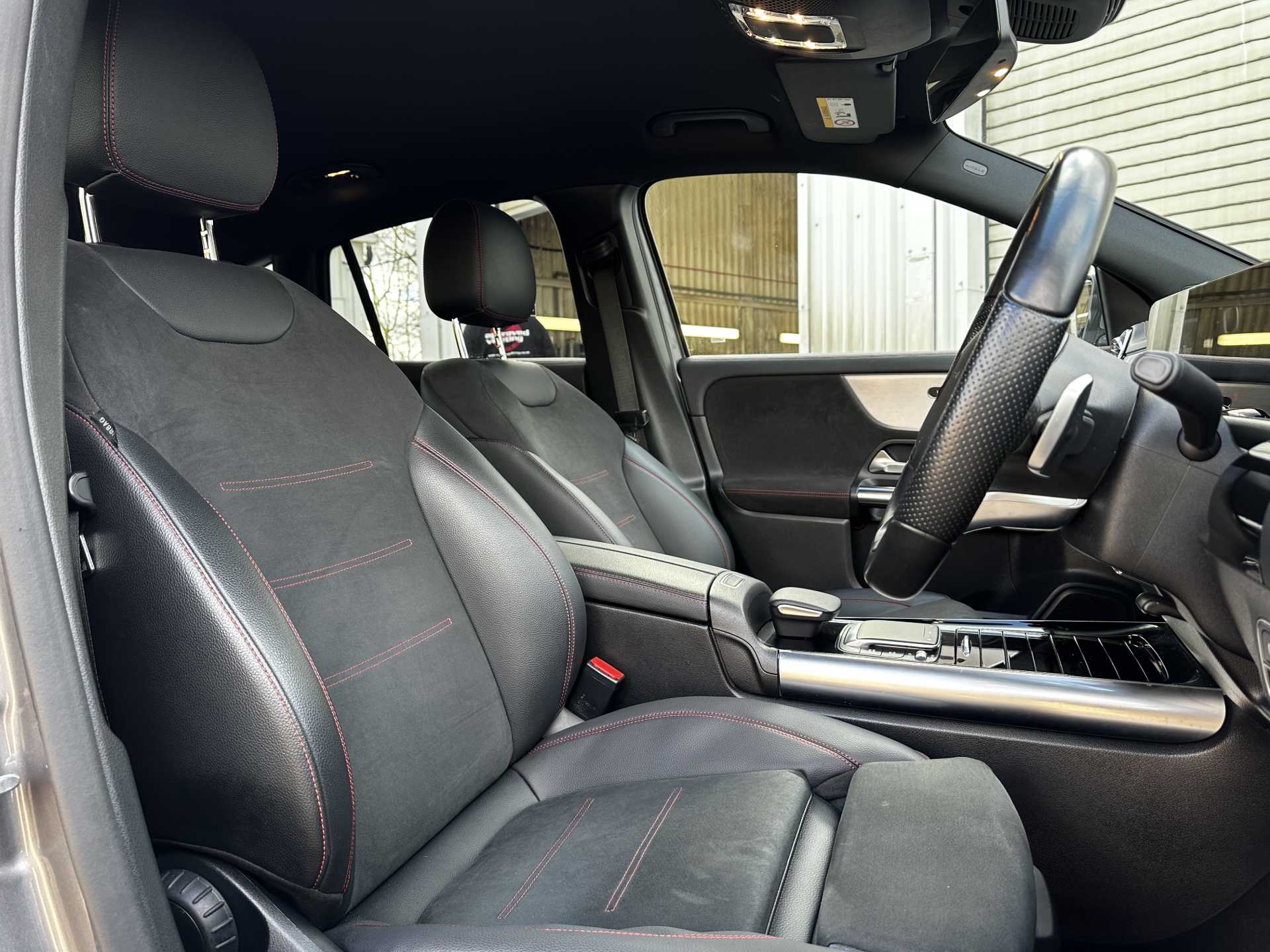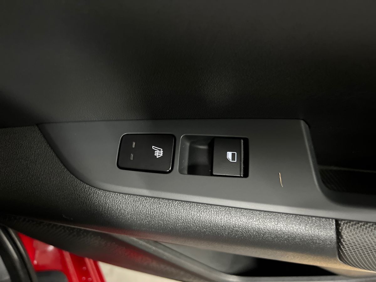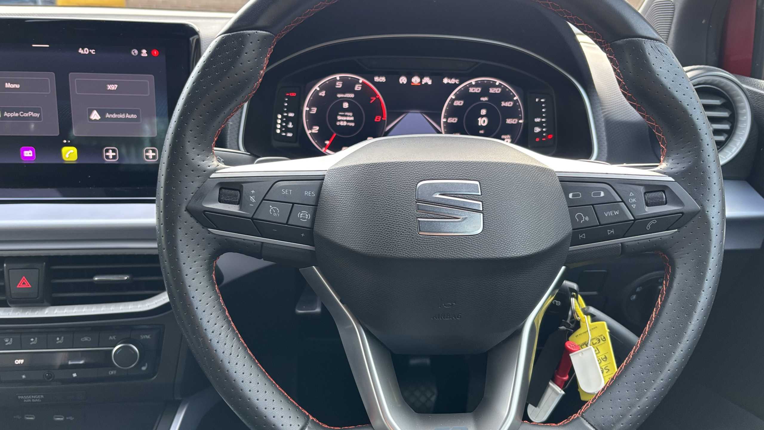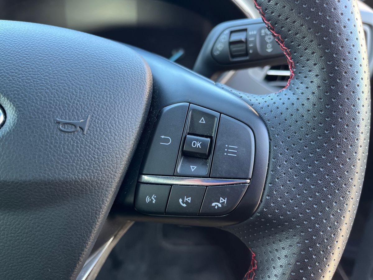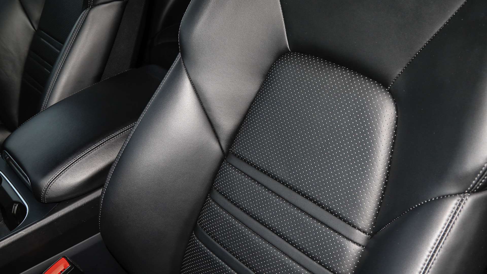 "Red stitching on steering wheel",