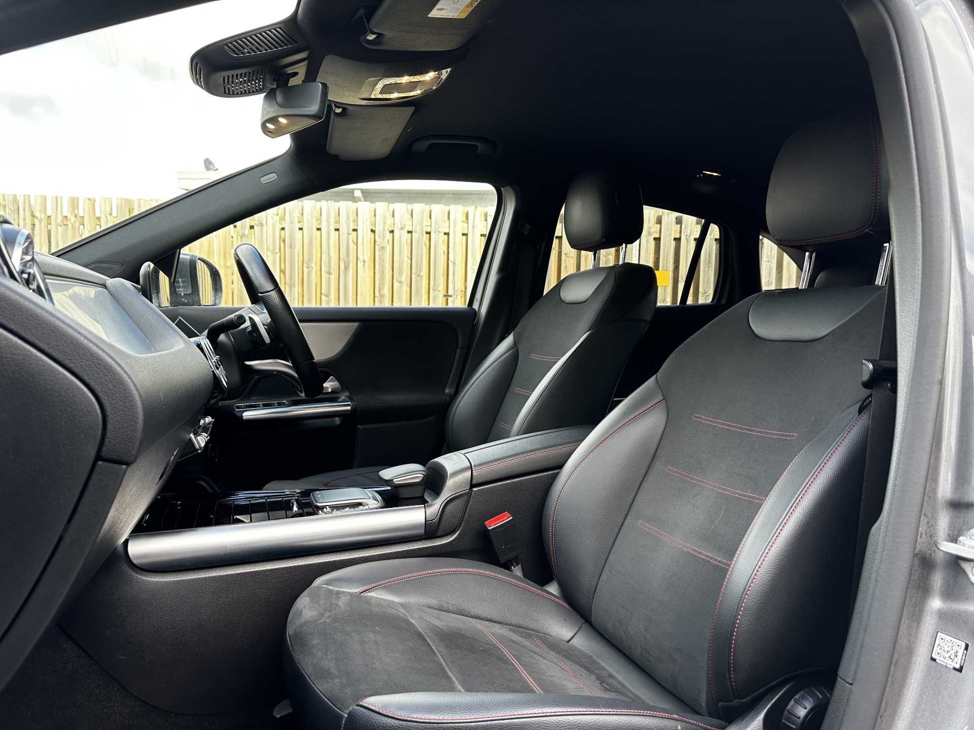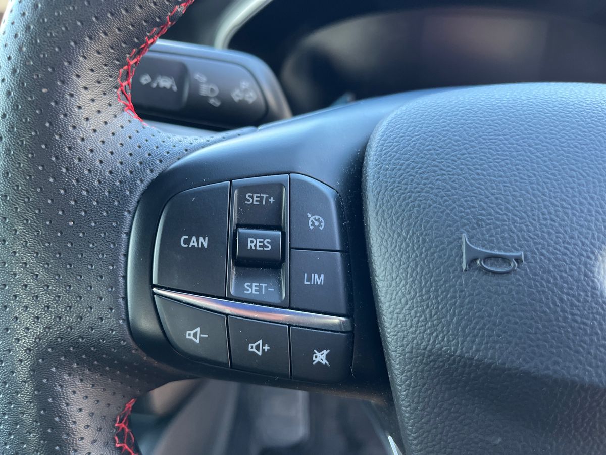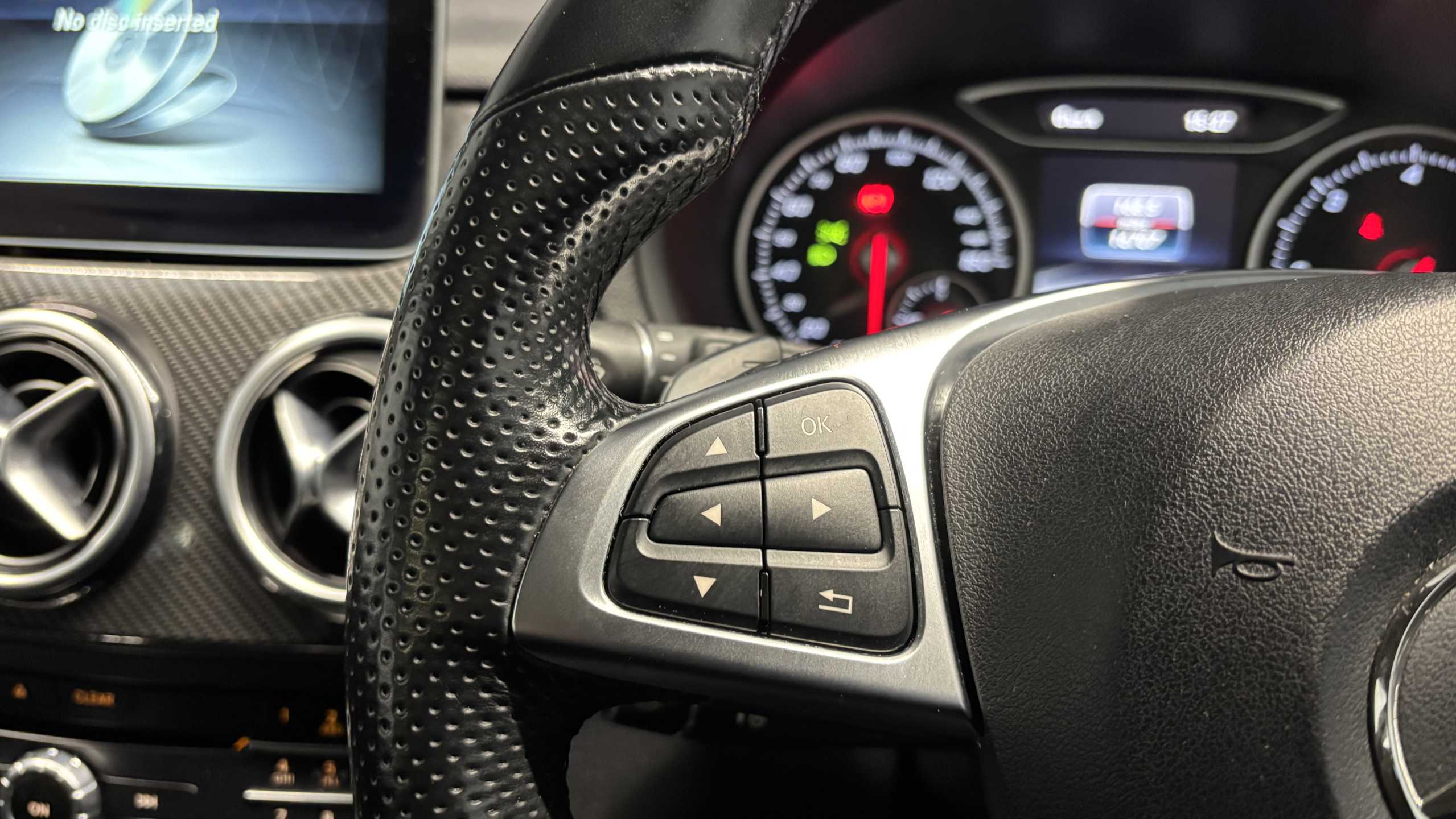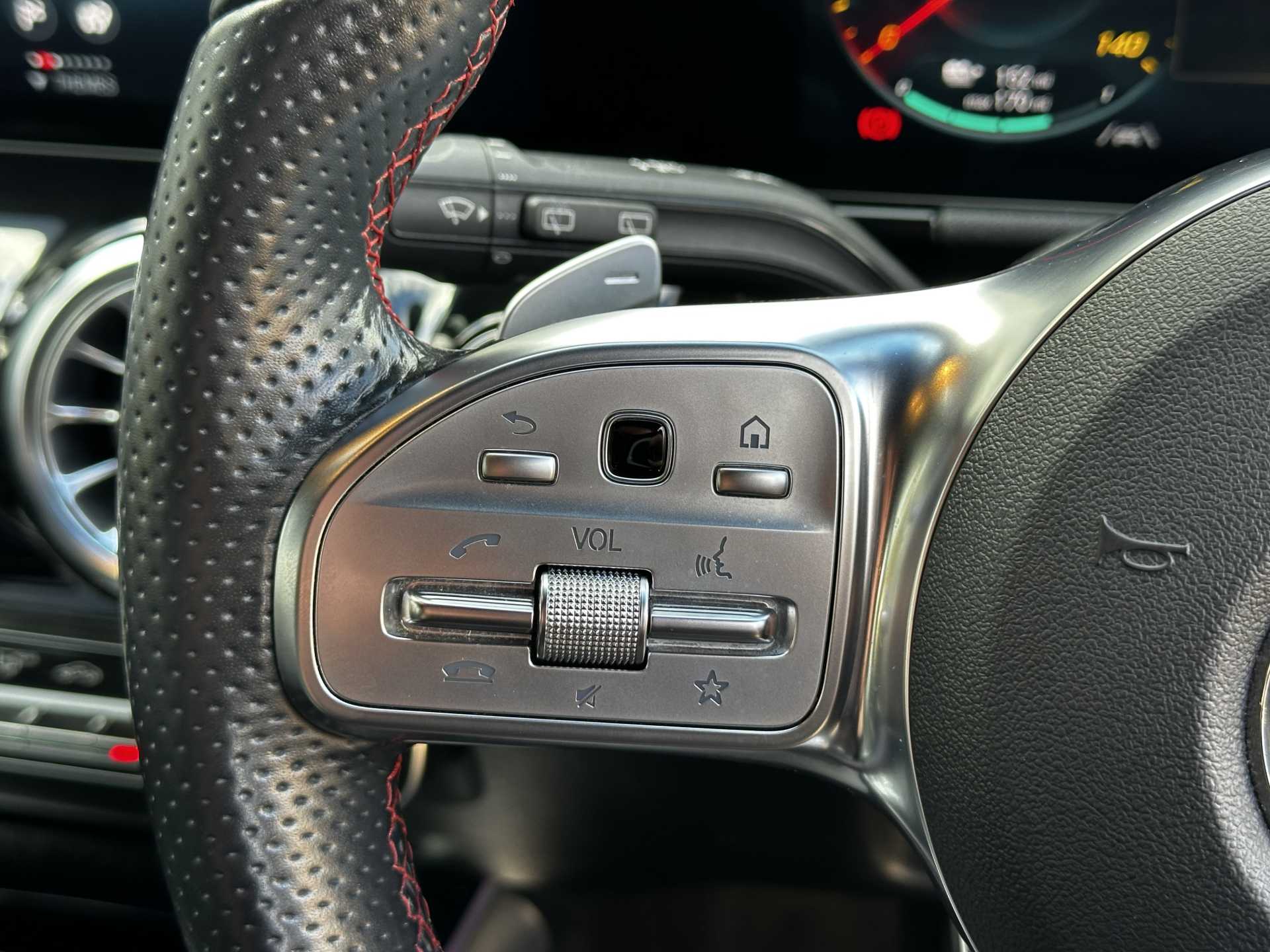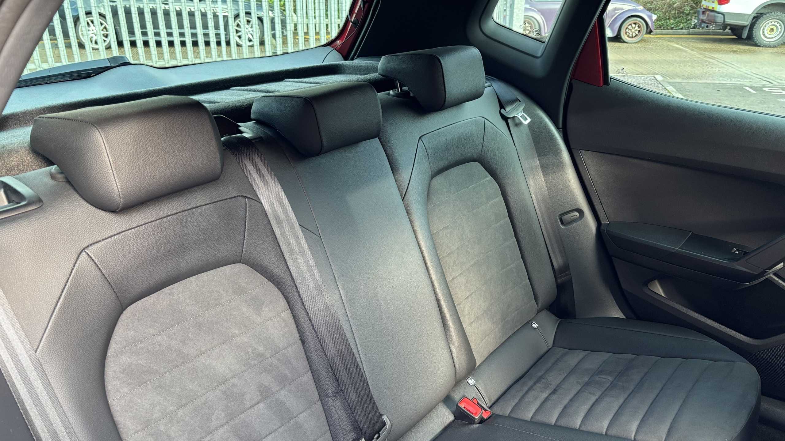 "Red stitching on steering wheel",