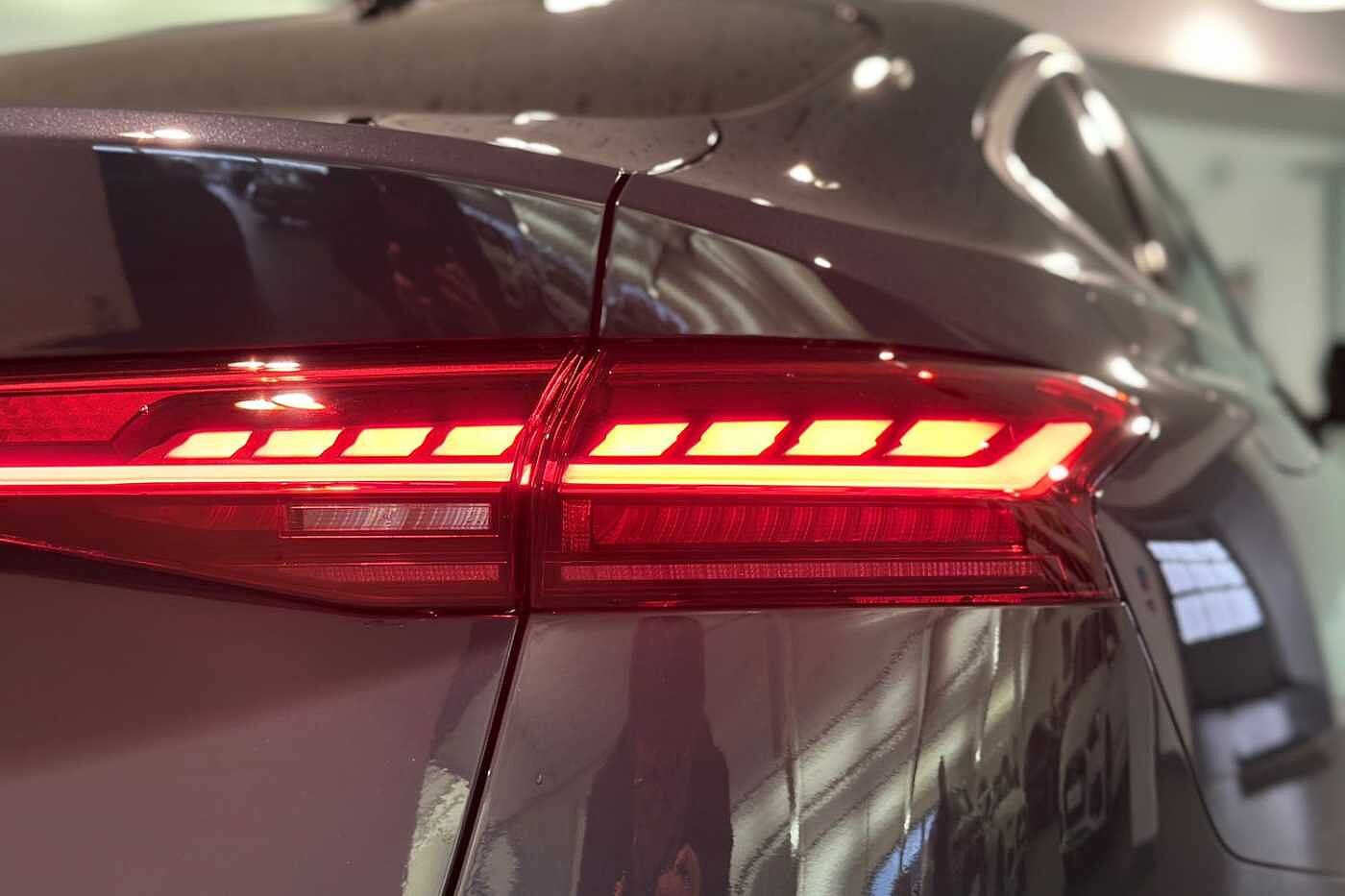 "Two part LED tailights in L-shape with components in smoked glass, brake light, LED turn indicator and rear fog light",