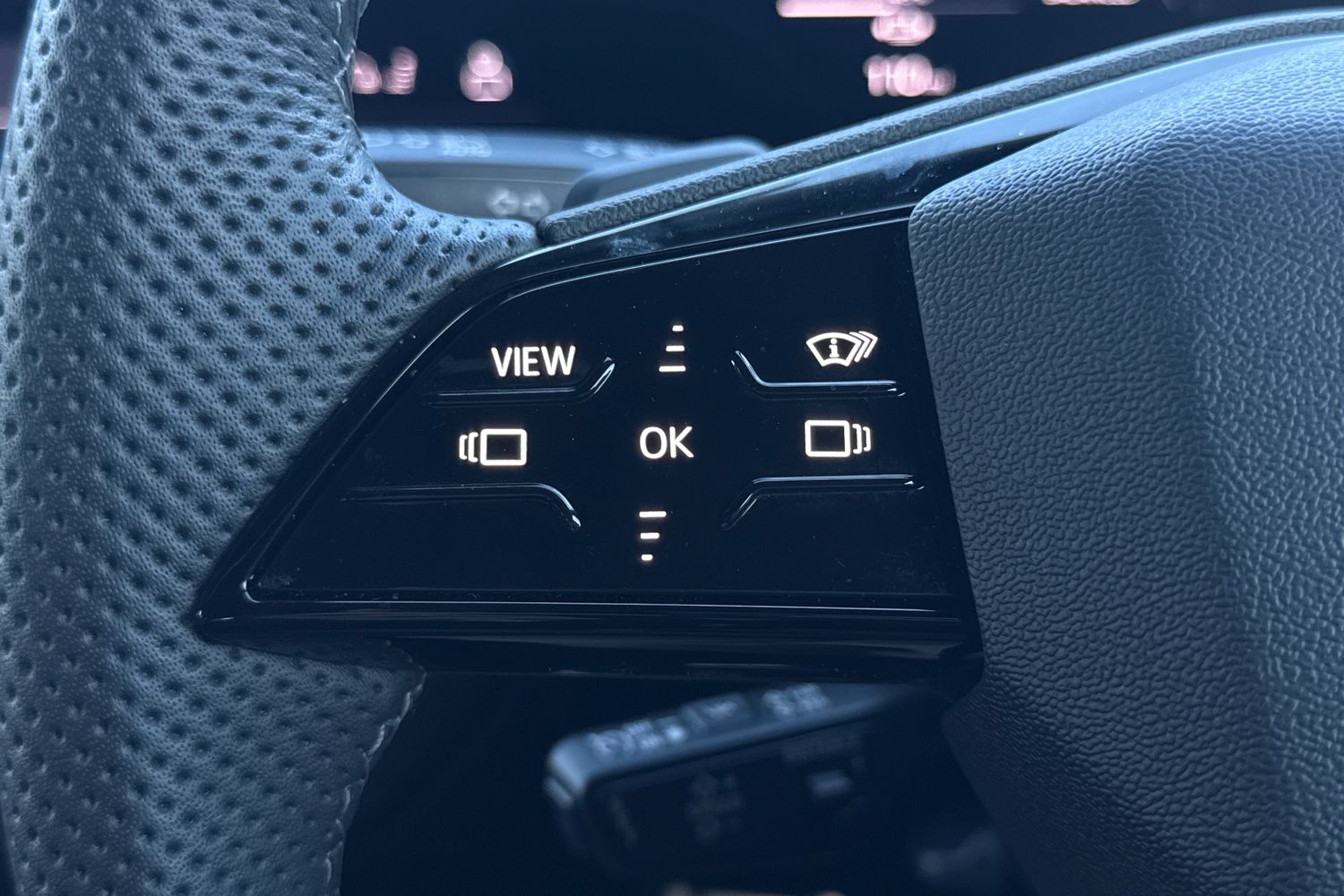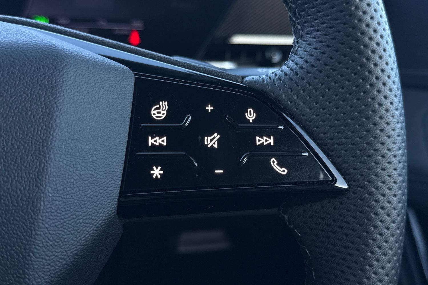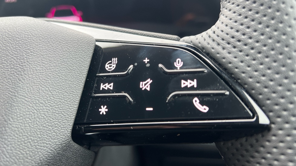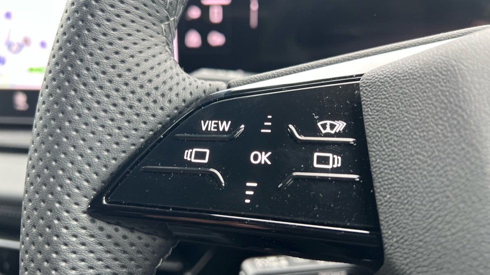"Multi function full grain perforated leather steering wheel with adamite green stitch detail and 'GT' emblem",