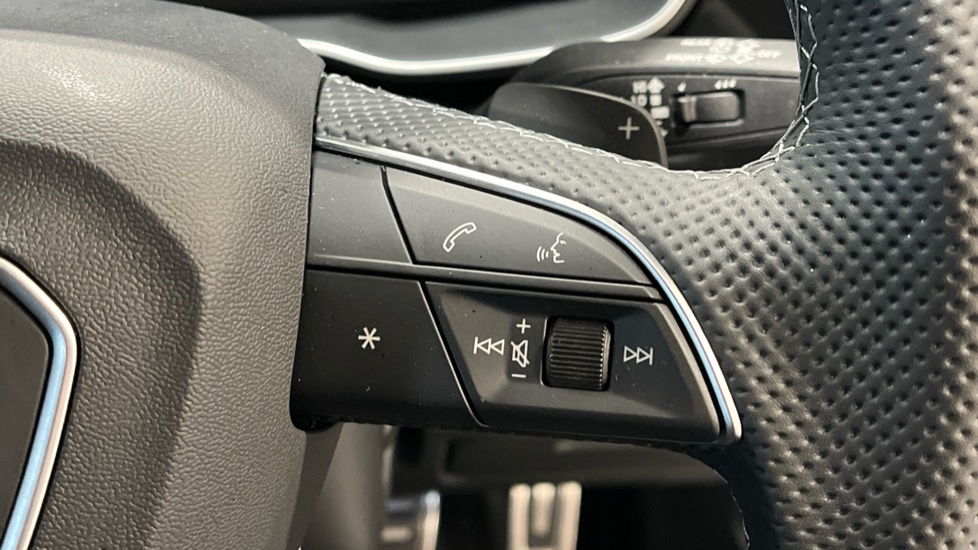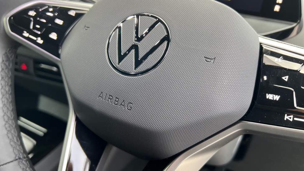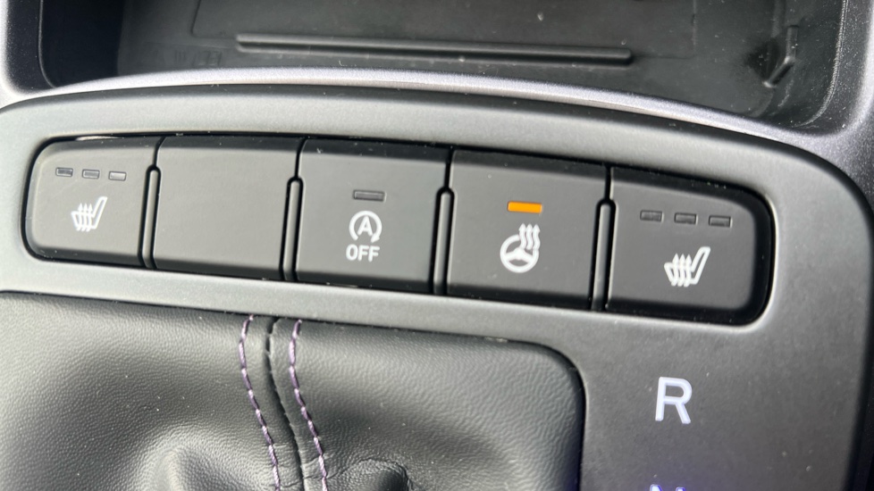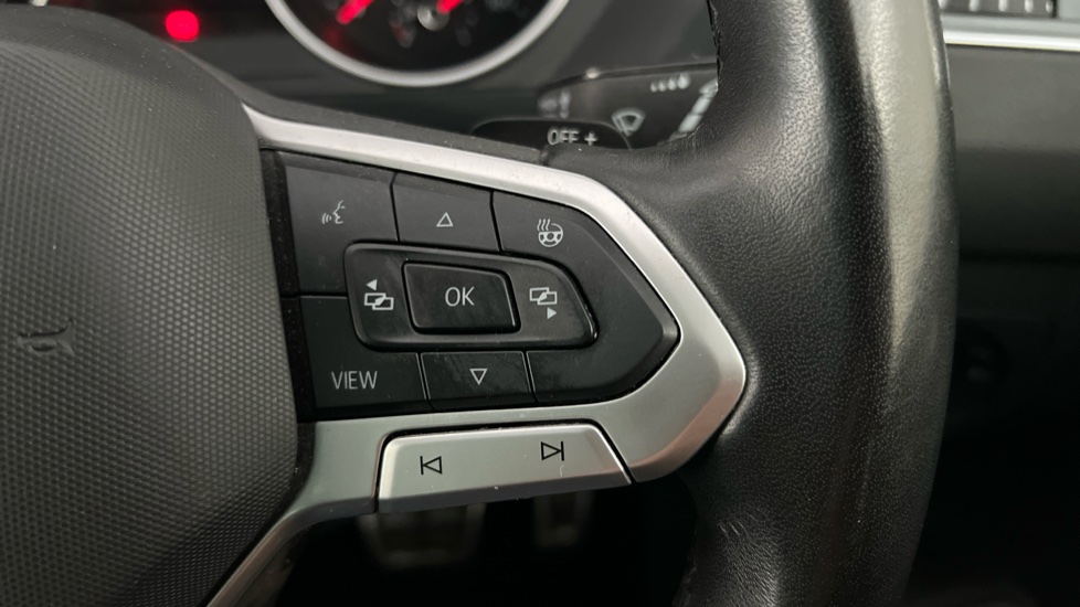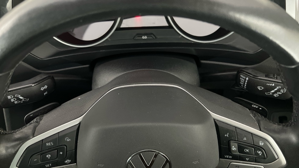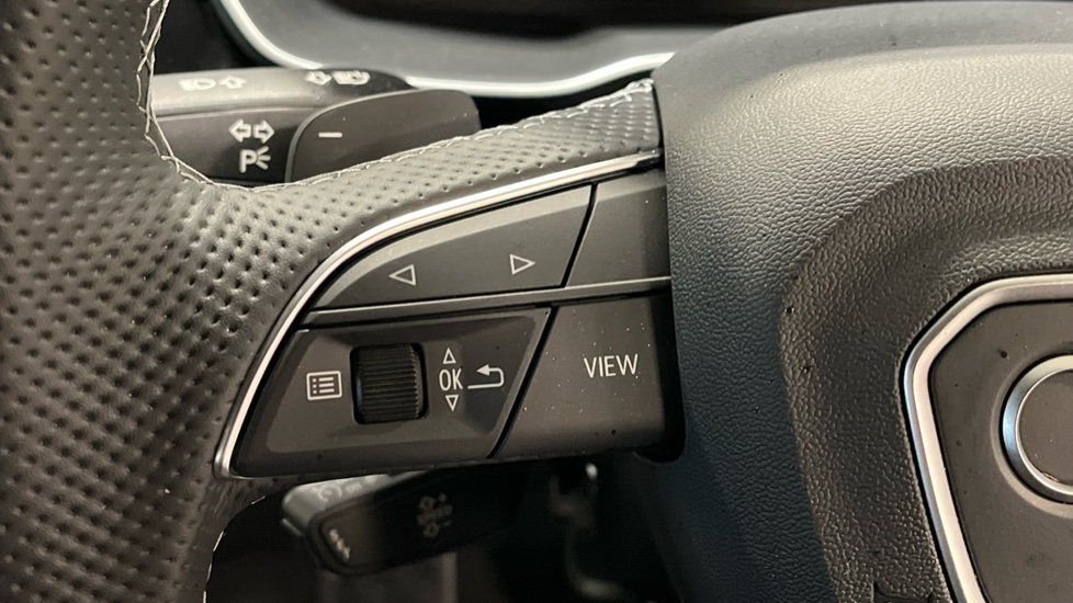 "Multi function full grain perforated leather steering wheel with adamite green stitch detail and 'GT' emblem",