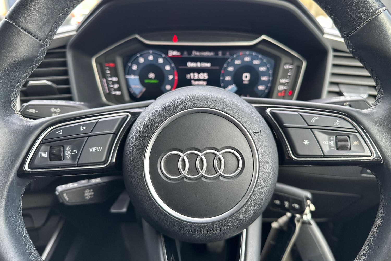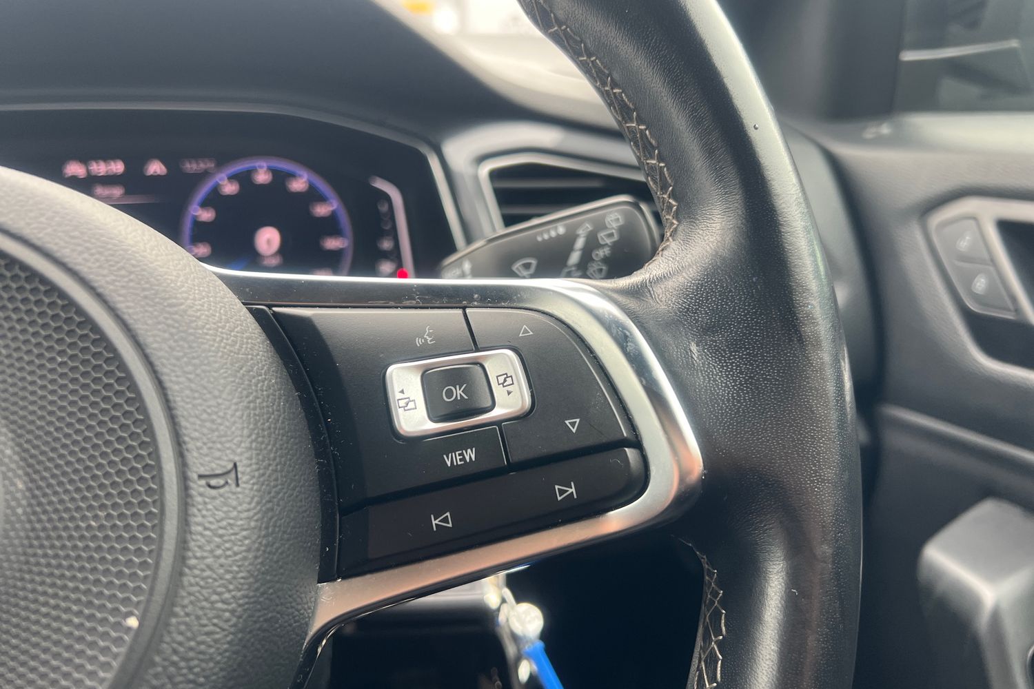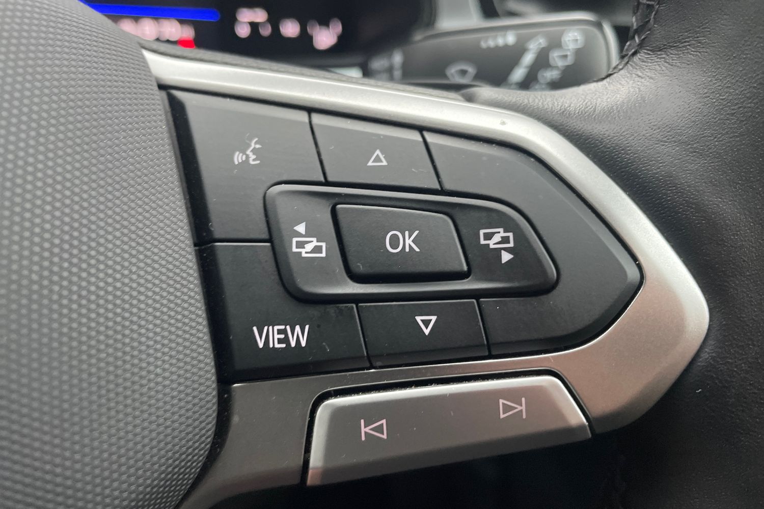 "Leather wrapped multifunction steering wheel with decorative aluminum inserts",