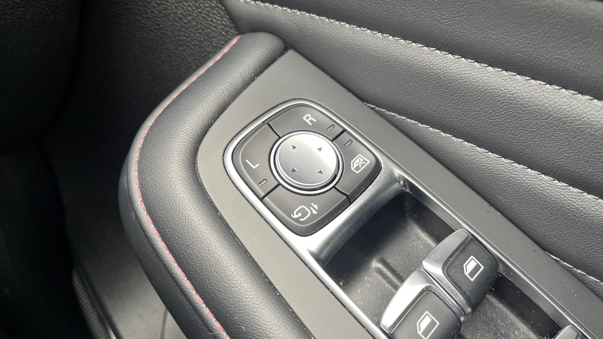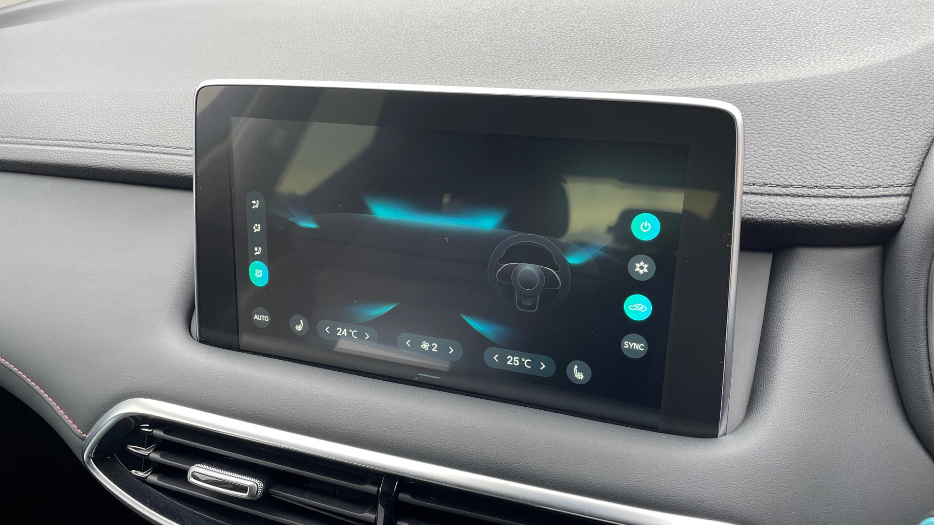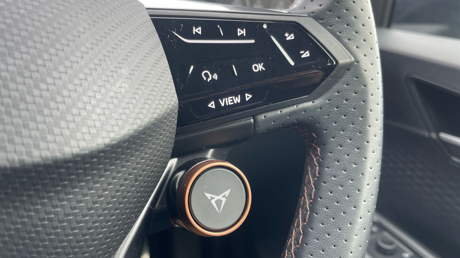 "Compact heated multifunction steering wheel with full grain leather Iced Clay stitching, gloss black and satin chrome detailing and GT badge",
