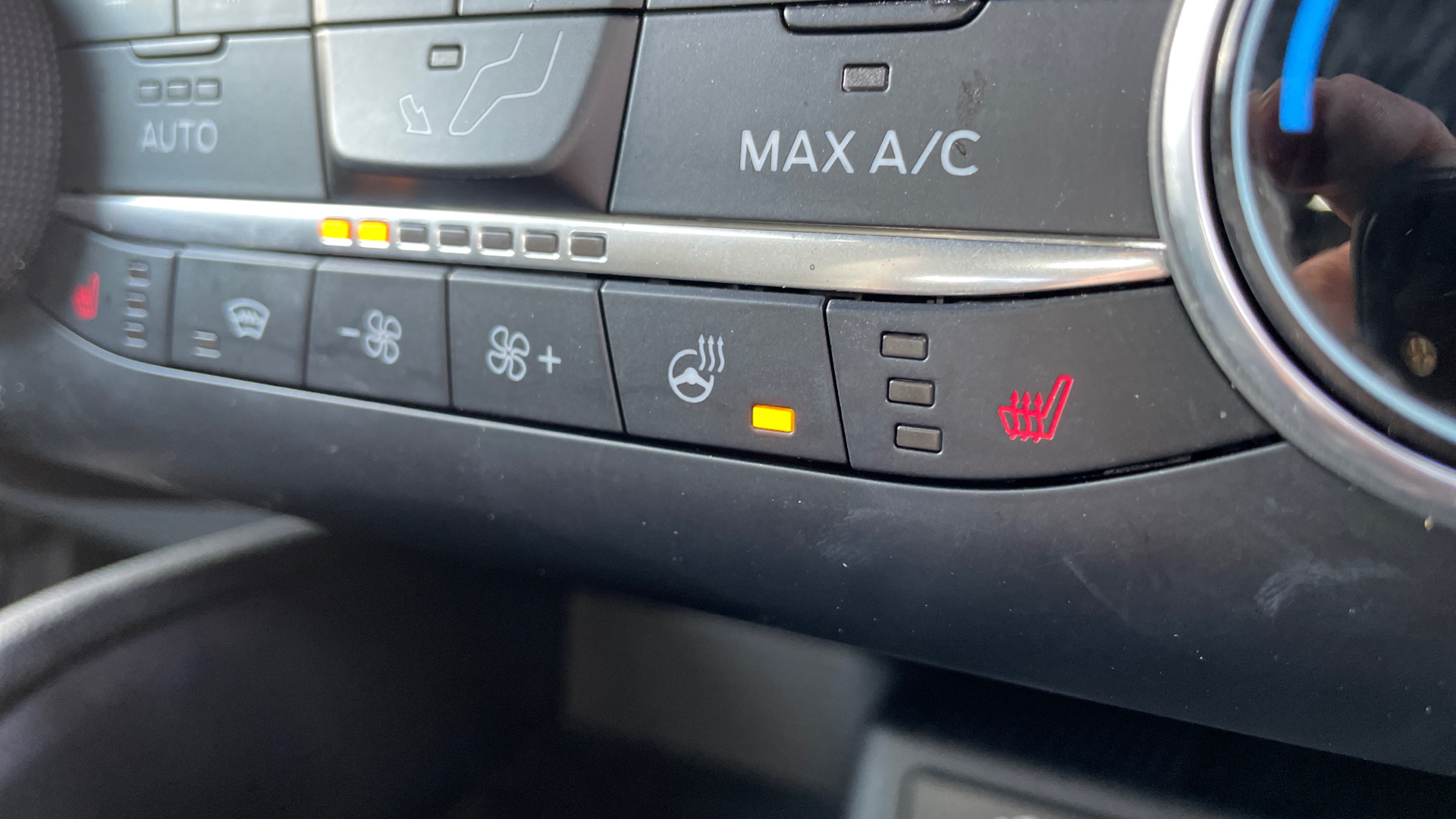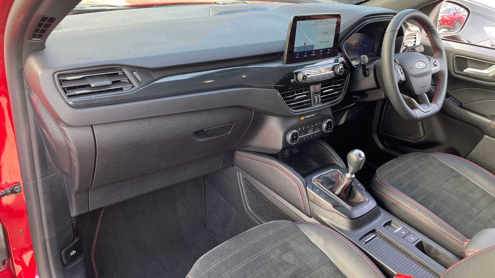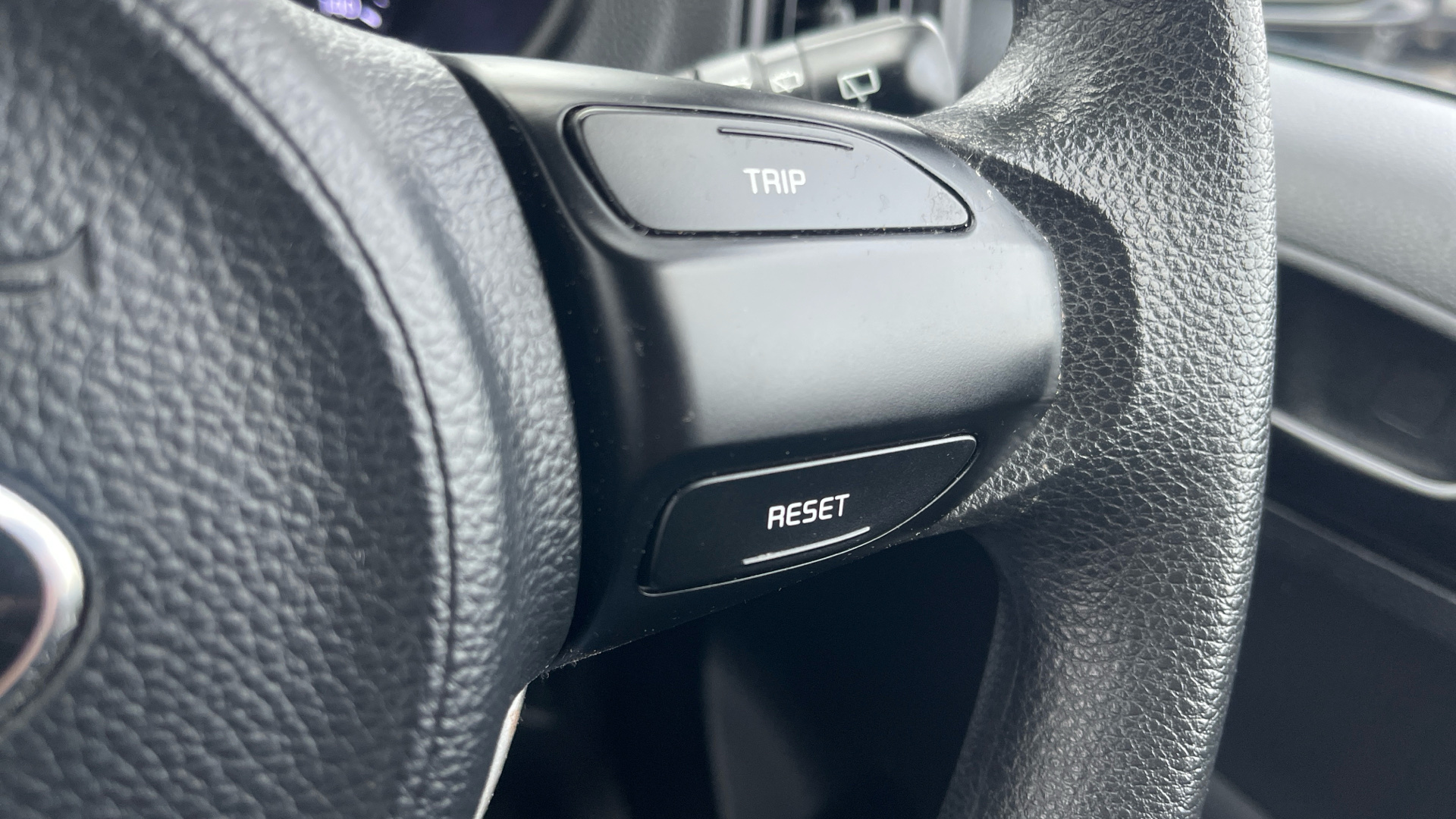 "Compact heated multifunction steering wheel with full grain leather Iced Clay stitching, gloss black and satin chrome detailing and GT badge",