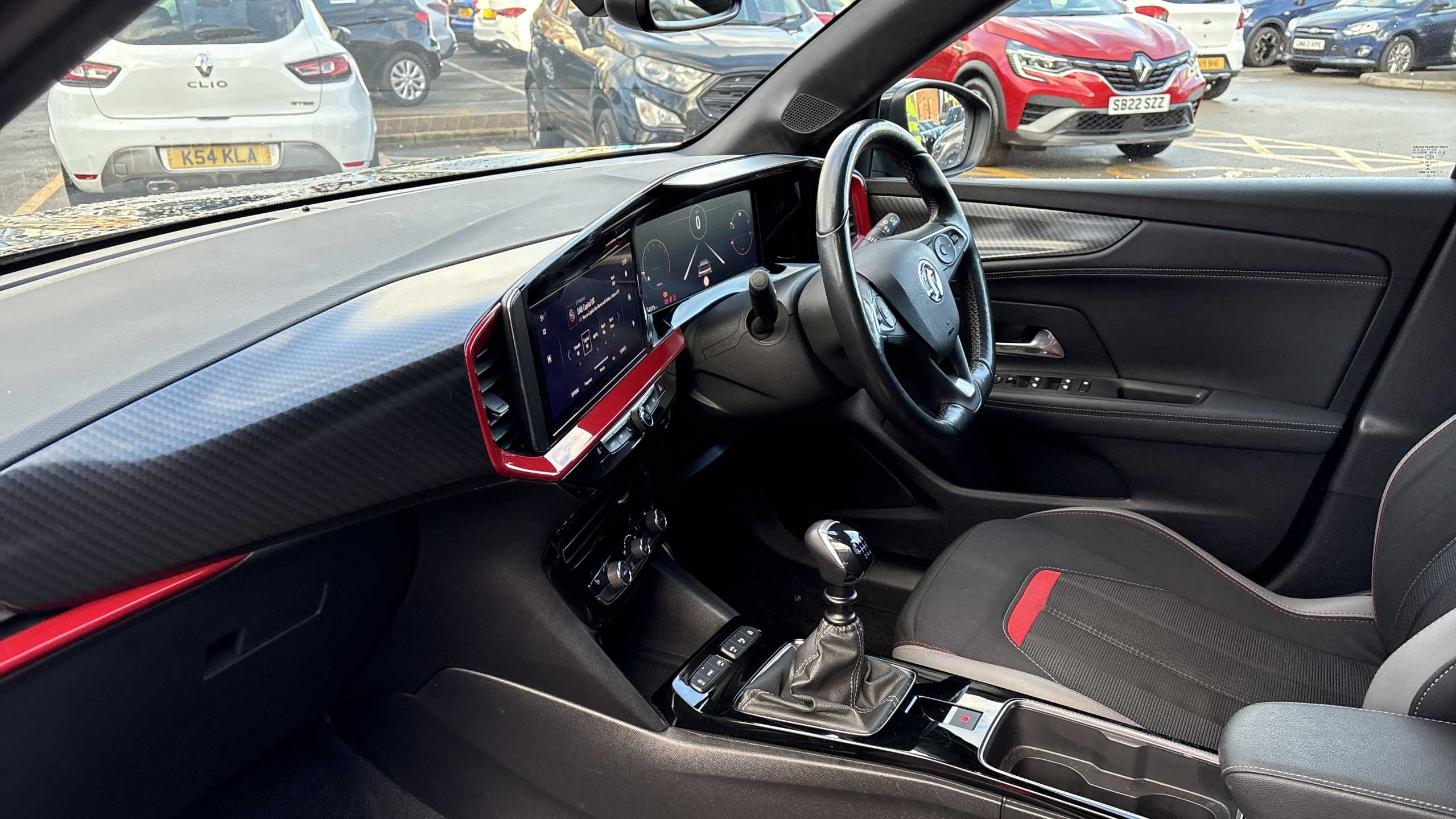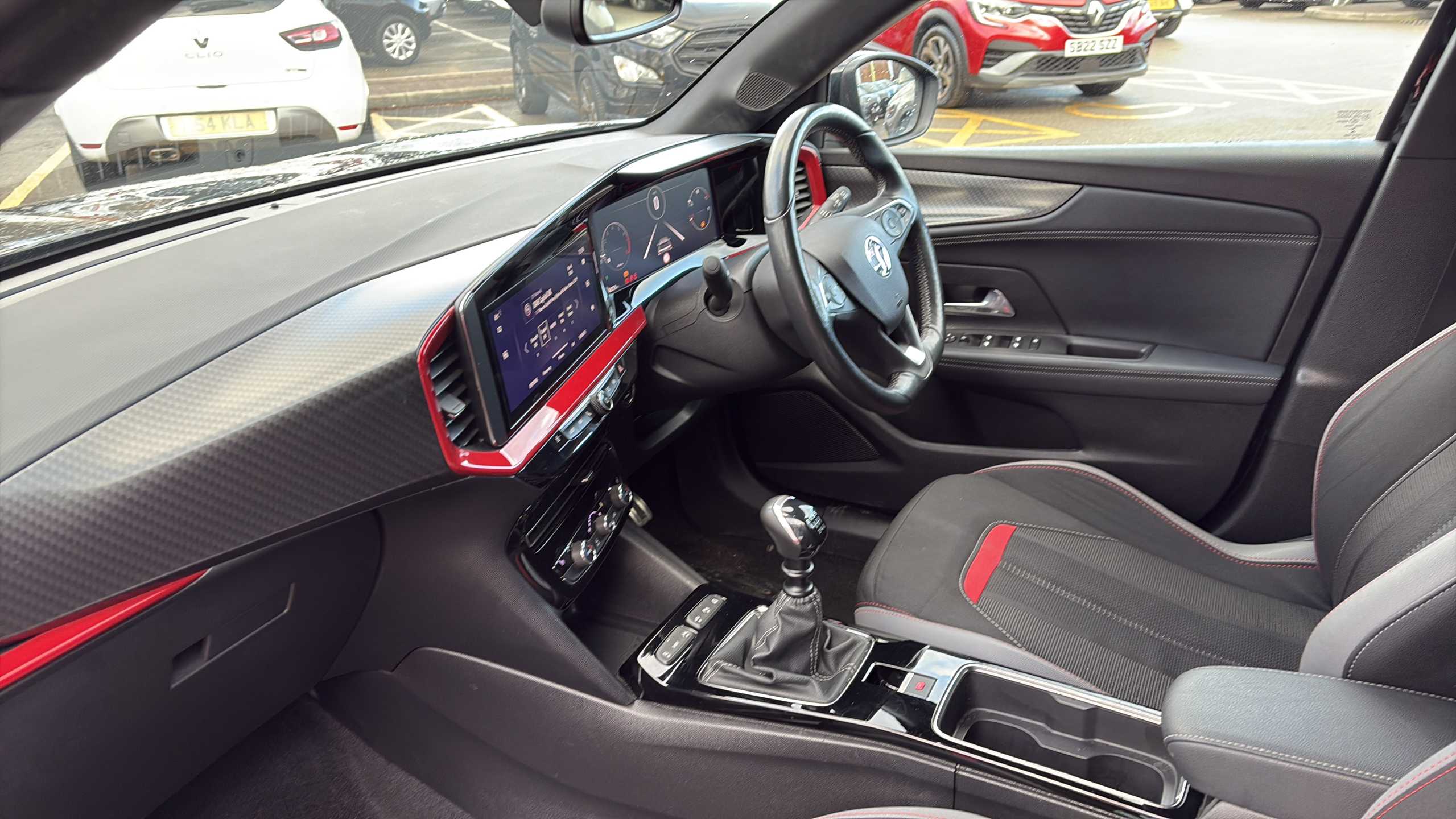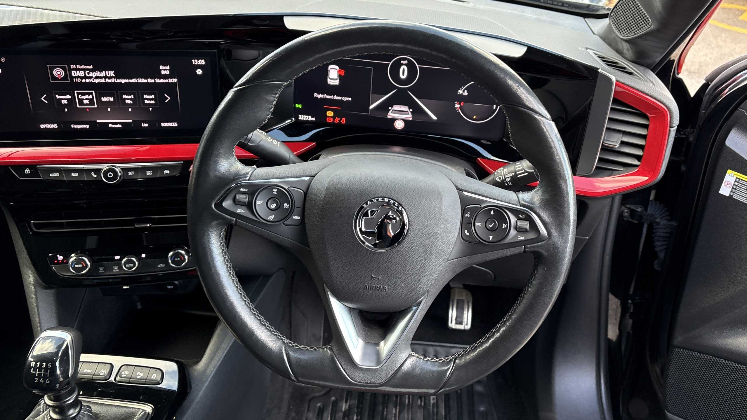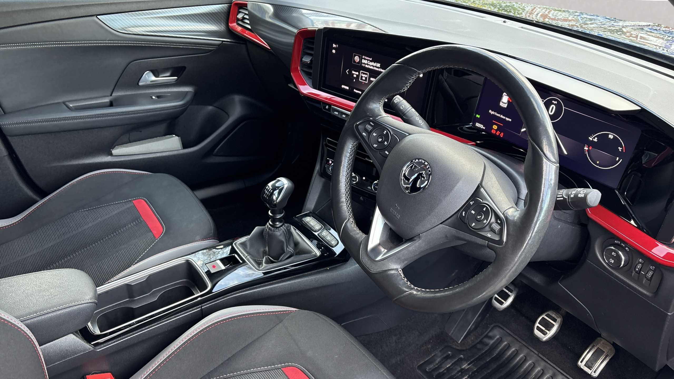 "Perforated flat bottomed leather steering wheel/gear knob/handbrake with red stitching and FR logo",
