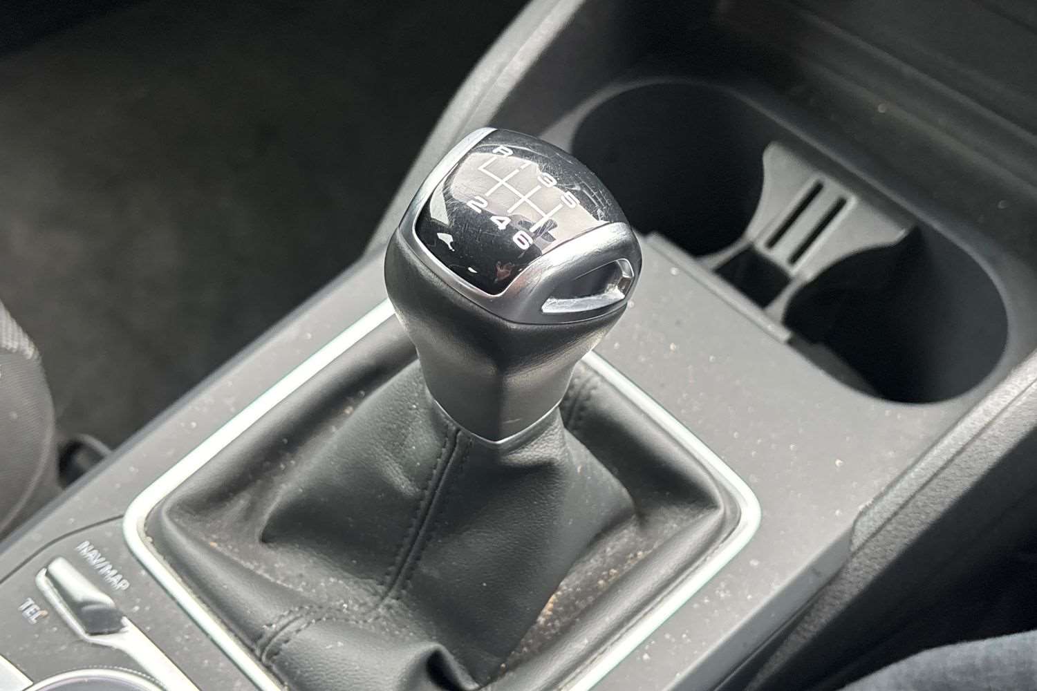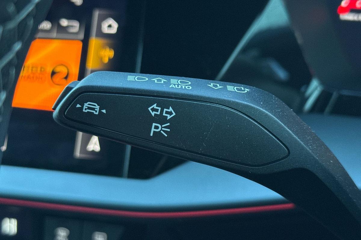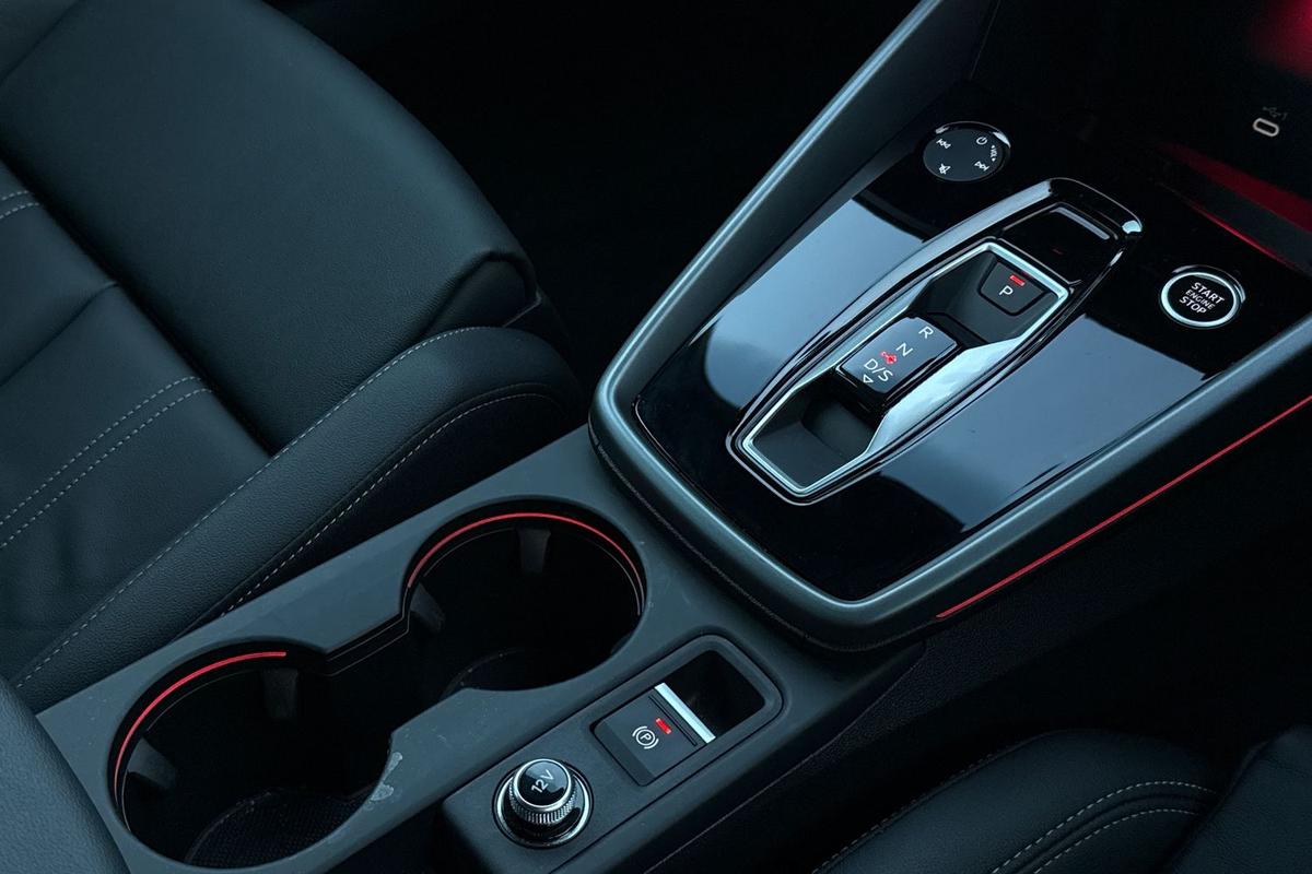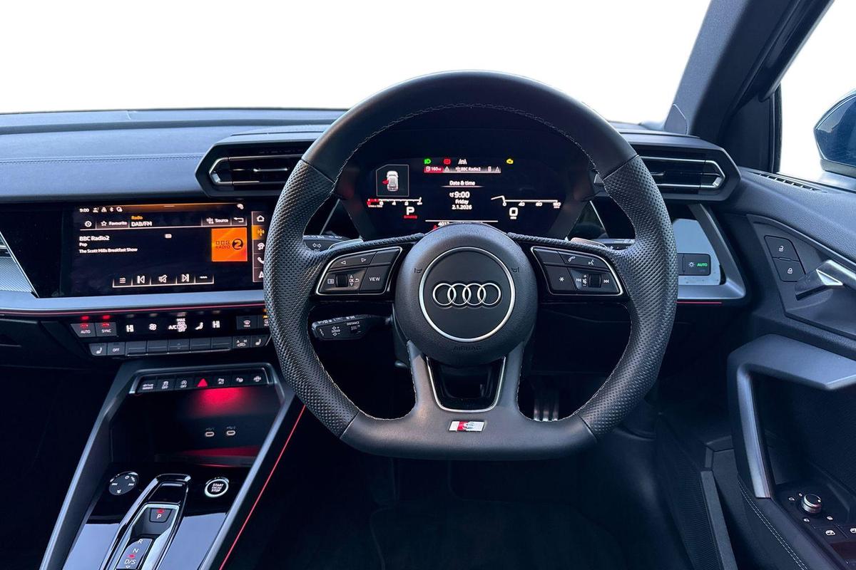 "Perforated flat bottomed leather steering wheel/gear knob/handbrake with red stitching and FR logo",