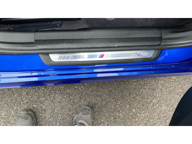 "Front door sill finishers in black plastic with M designation in metallic look",