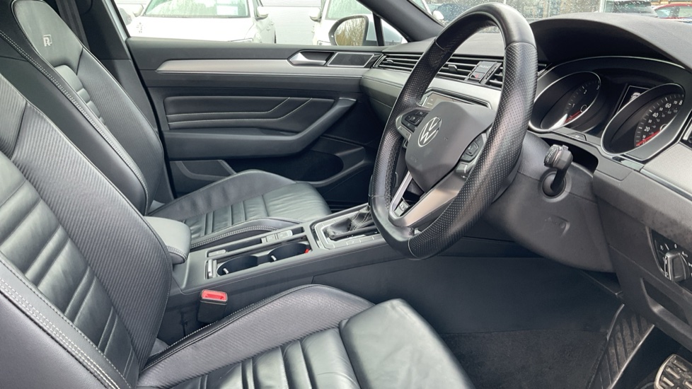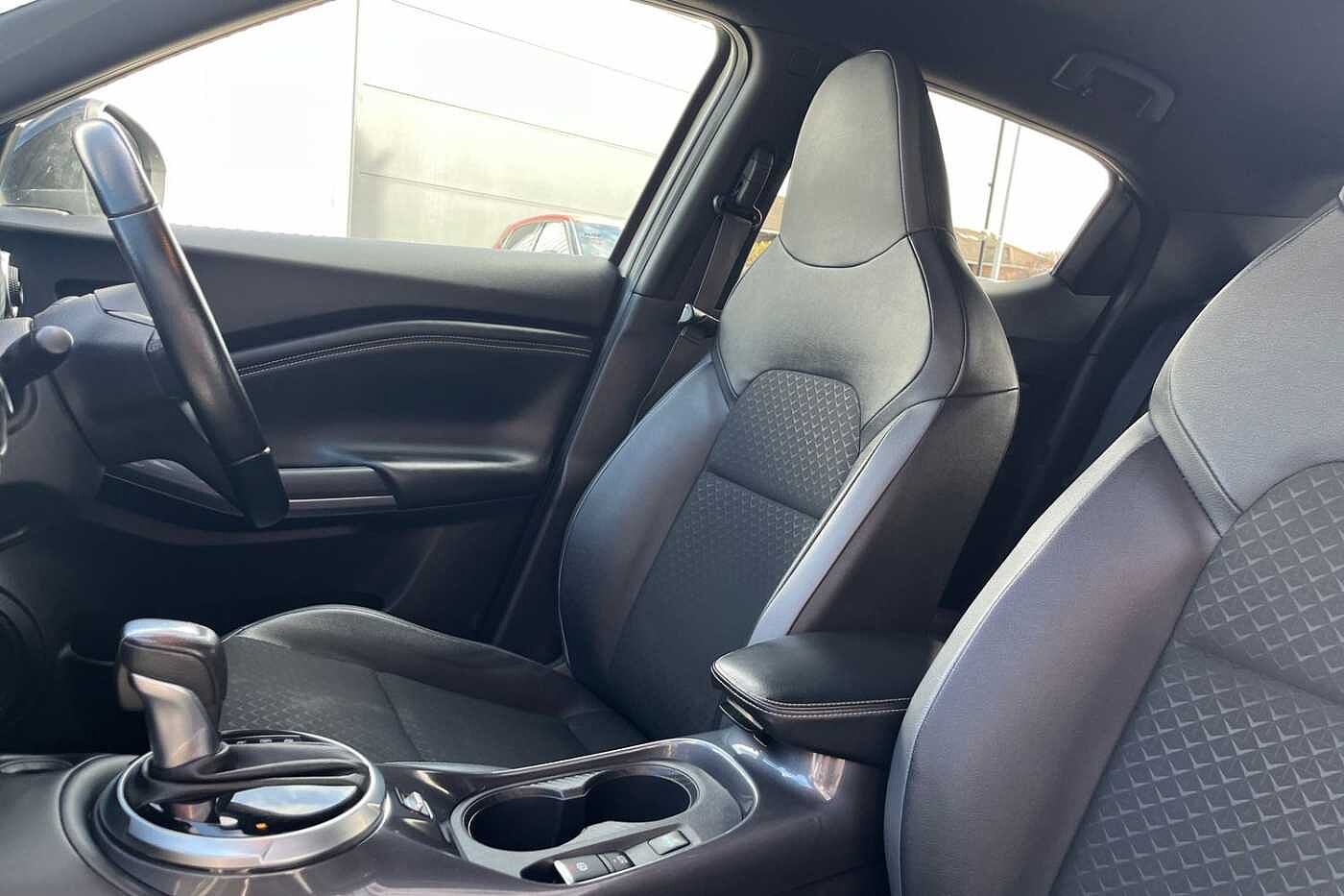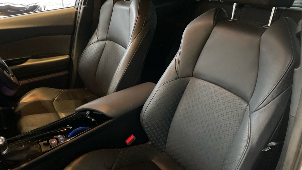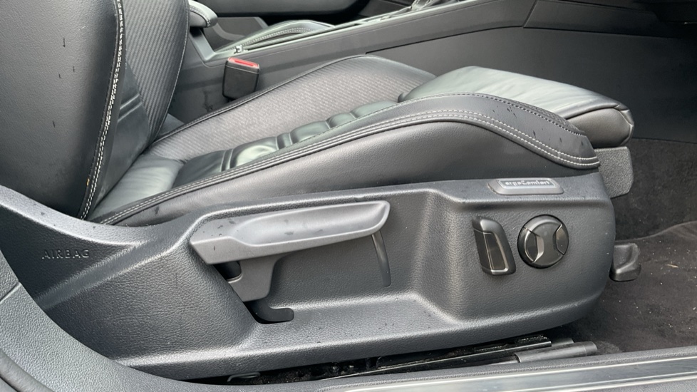 "Perforated grained leather upholstery with contrast stitching",