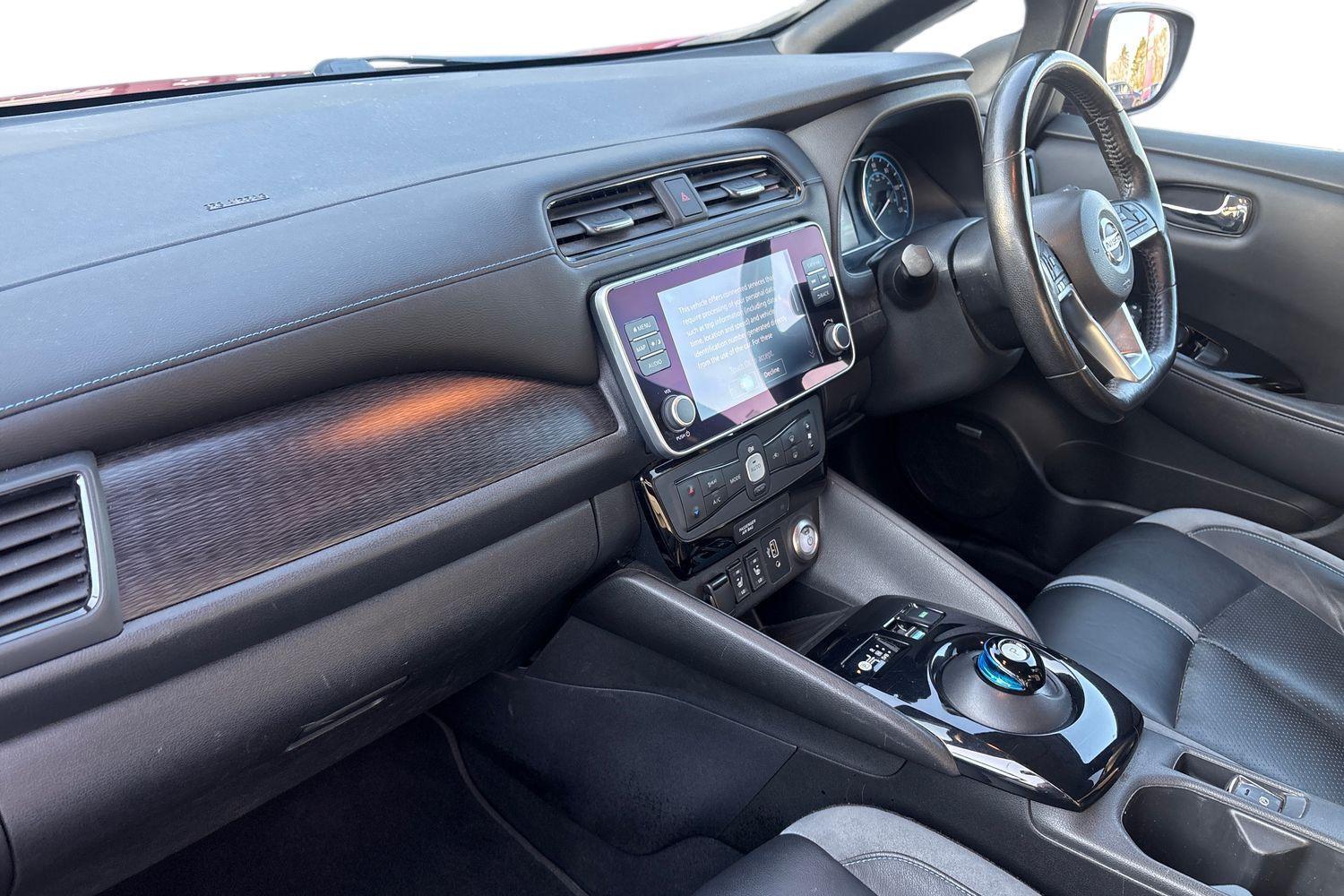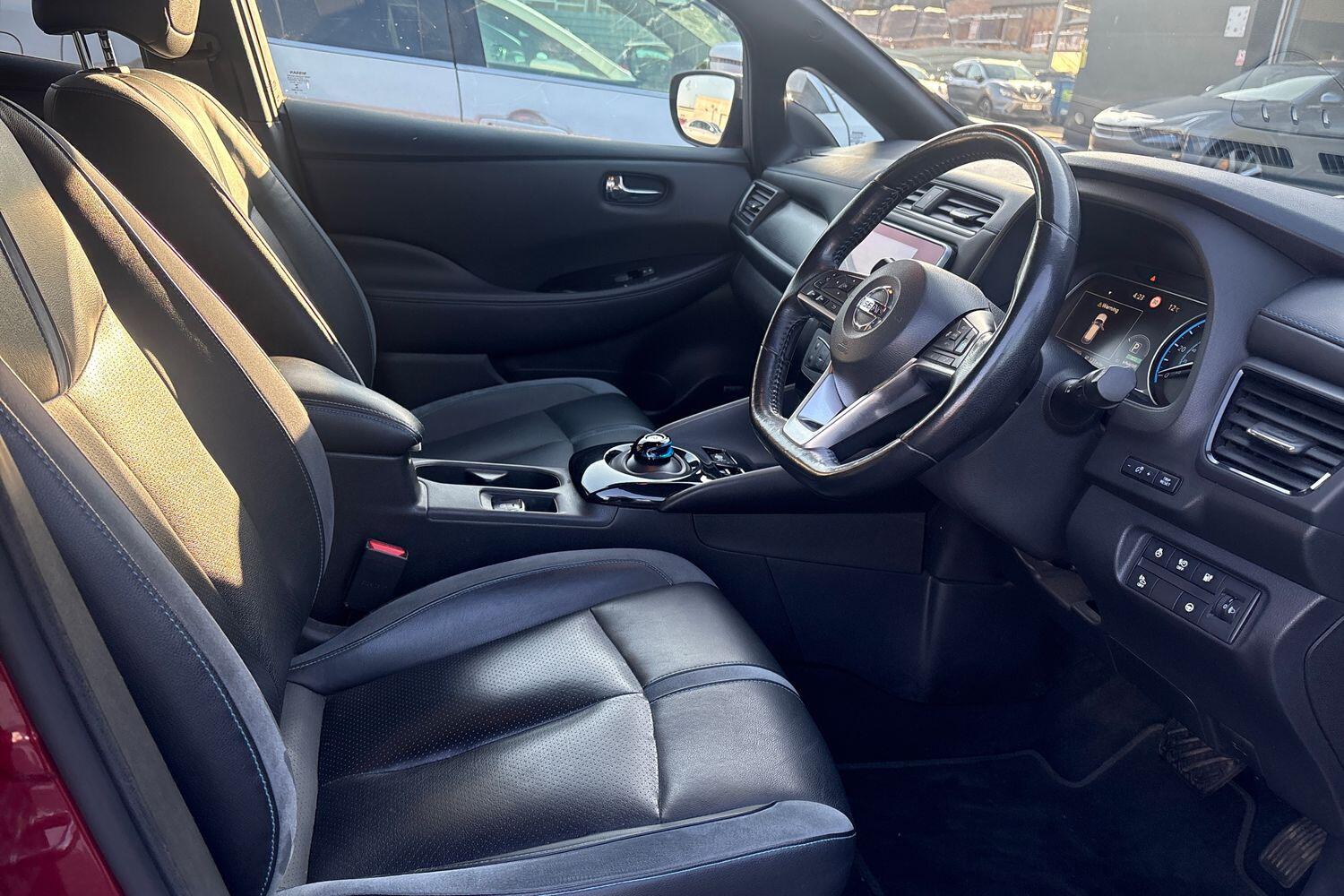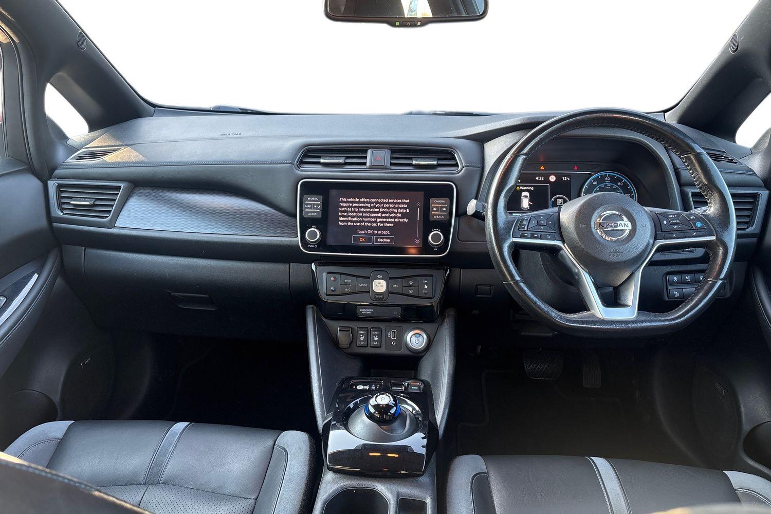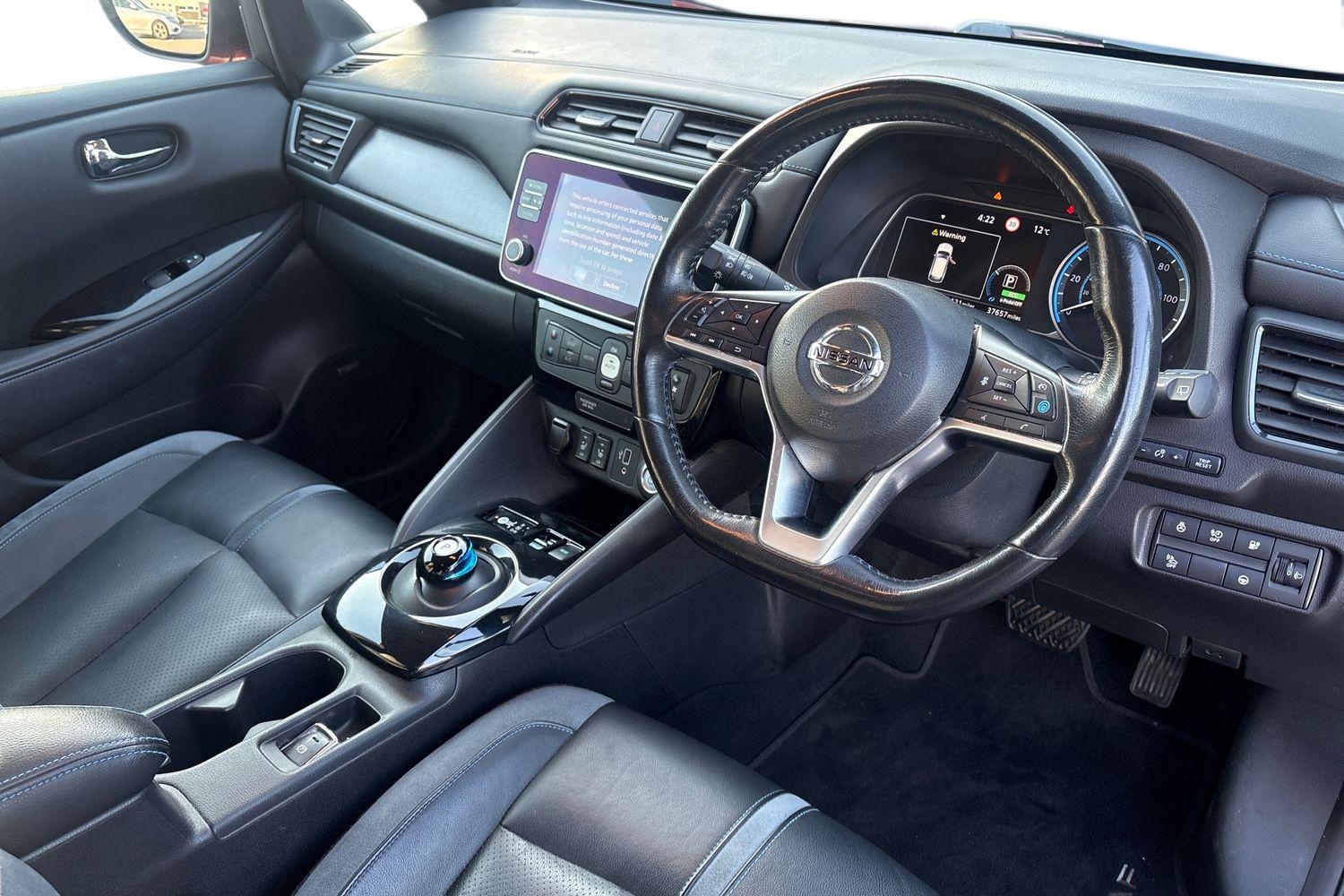 "features": "7\" Combimeter, Apple car play/Android Auto, Blind spot warning, E Pedal, Intelligent Cruise control (ICC), Intelligent lane intervention, Lane departure warning system, Nissan connect EV 8\" touch screen navigation and entertainment system, Push button starter, Rear cross traffic alert, Rear view camera, Speed limiter, Speed sensitive power steering, Telematics system, Trip computer, Voice control system, 6.6 kw On-board charger, 6.6 kW onboard charger, EVSE charging cable, AM/FM/DAB audio system, Aux-in socket, Bose Premium Audio system+7 speakers, Remote audio control, Two rear USB sockets, USB port, Anti dazzle rear view mirror, Auto dimming rear view mirror, Automatic activation of hazard warning lights, Automatic rain sensing wipers, Body coloured door mirrors with integrated LED indicators, Chrome door handles, Door mirrors with turn signal and puddle lamps, e+ embossed charging port, Electric front/rear windows, Electrically adjustable and folding door mirrors, Follow me home headlights, Gloss black finish B pillar, High beam assist, Intelligent auto headlights, LED signature daytime running lights, LED tail light signature, Metallic blue front splitter, Metallic blue rear bumper accent, Rear privacy glass, 60/40 split folding rear seat, Automatic air conditioning with timer and heater, Front centre console and armrest, Front head restraints, Front seatback pocket, Heat pump system with remote control, Height adjustable driver seat, Isofix child seat anchor points, Leather D shaped steering wheel, Manual adjust driver/passenger seats, Part leather/Ultra suede upholstery, PTC (Positive Temp Co-efficent) heater, Quick charge port, Rear assist grips, Rear head restraints, Rear heater duct, Tilt adjustable steering wheel, Heat pack - LEAF, LED Pack - Leaf, Pro pilot Pack - Leaf, Tech Pack - Leaf, 3 point front seatbelts with pre-tensioners, 3x3 point rear seatbelts, ABS with EBD and brake assist, Curtain airbags, Driver and passenger airbags, Front seatbelt pretensioners + load limiters, Height adjustable front seatbelts, Hill start assist, Intelligent emergency braking with pedestrian recognition, Intelligent trace control, Seatbelt reminder for driver and front passenger, Side airbags, Traction control, Tyre pressure monitoring system, VDC Dynamic Vehicle Control, Deadlock, Immobiliser, Nissan i-key, Remote central locking, Thatcham Cat.1 alarm, 17\" alloy wheels, ",
