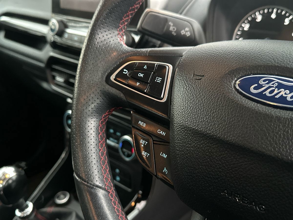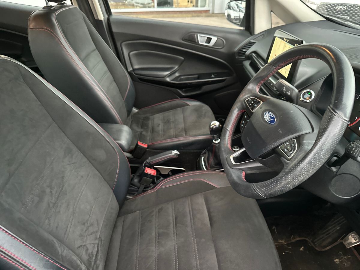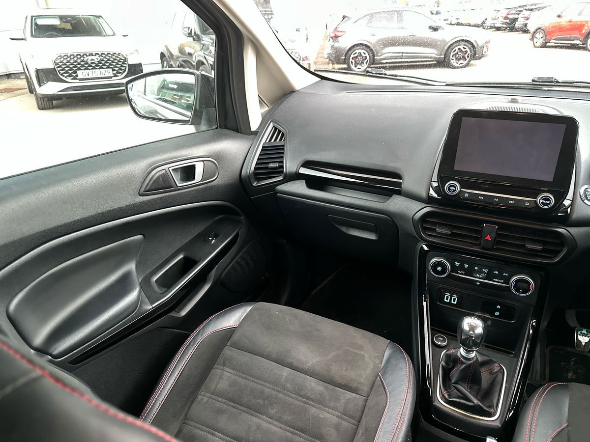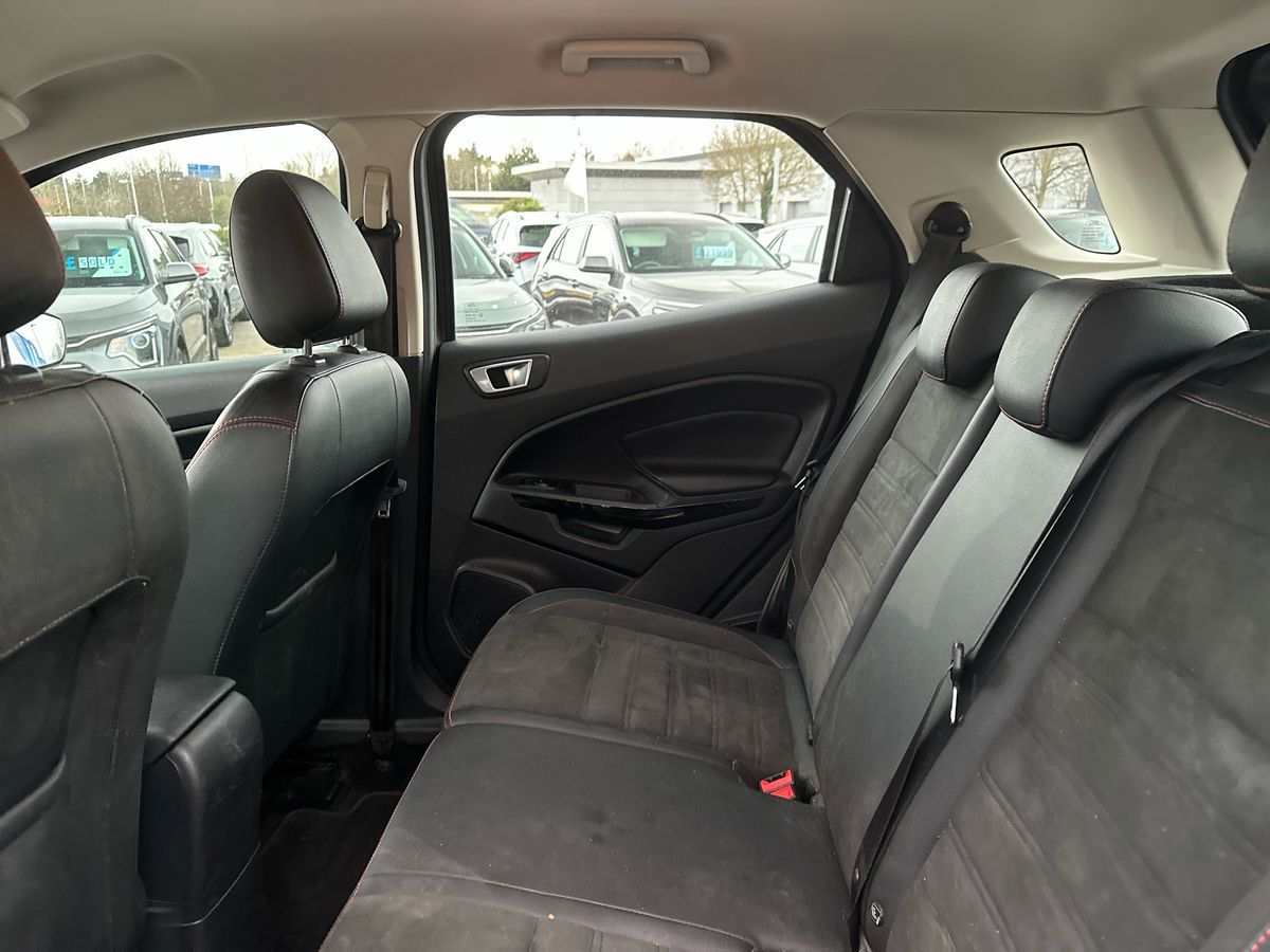 "features": "Cruise control, Easy fuel capless refuelling system, PAS, SYNC 3 nav system with DAB radio, 8\" screen, voice control, emergency assistance, Apple car play/Android auto, 2x USB, Ford pass connect, Trip computer, Sports suspension, Steering wheel mounted audio controls, 'Quickclear' heated windscreen/heated washer jets, Auto dimming rear view mirror, Automatic headlights, Black roof rails, Body colour door handles, Body coloured bumpers, Electrically adjustable and heated door mirrors, Front door threshold plates with ST-Line logo, Front fog lights, Headlamps with LED day running lights, Headlight levelling control, Large rear spoiler, Power foldable door mirrors with puddle lights, Power front and rear windows with global opening/closing, Rain sensing front wipers, Rear wiper, ST-Line body styling kit, ST-Line front grille, 12V socket in front and rear, 60/40 split rear seats, 7 shade adjustable ambient lighting, Ambient light, Centre console with sliding front armrest, Cooled glovebox, Courtesy lights with map reading light, Driver seat height/lumbar adjust, Driver's side glovebox, Driver/passenger sunvisors and lidded vanity mirrors, EATC - Electronic Auto Temperature control, Folding grab handles, Footwell ambient lighting, Front head restraints, Front seat back map pockets, Front/rear floor mats, Illuminated glovebox, Illuminated luggage compartment, Isofix system on outer rear seats, Leather steering wheel/gearshift/handbrake lever with red stitching, Luggage compartment carpet, Overhead console with sunglasses holder, Partial leather upholstery, Rake adjustable rear seats, Reach + rake adjustable steering column, Rear headrests, Stainless steel sports pedals, Steering wheel with chrome inserts, Storage drawers under front seats, Tie down hooks, Variable boot floor, Rear view camera pack - Ecosport, 3x3 point rear seatbelts, ABS, Child locks on rear doors, Curtain airbags, Driver airbag, Drivers knee airbag, Electronic Stability Programme with hill launch assist, Emergency brake assist, Front passenger airbag deactivation, Front side airbags, Passenger airbag, Seatbelt reminder for driver and front passenger, Traction control, Tyre pressure monitoring system, Immobiliser, MyKey system, Remote central locking, Thatcham 1 volume sensing alarm, Tyre inflation kit, ",