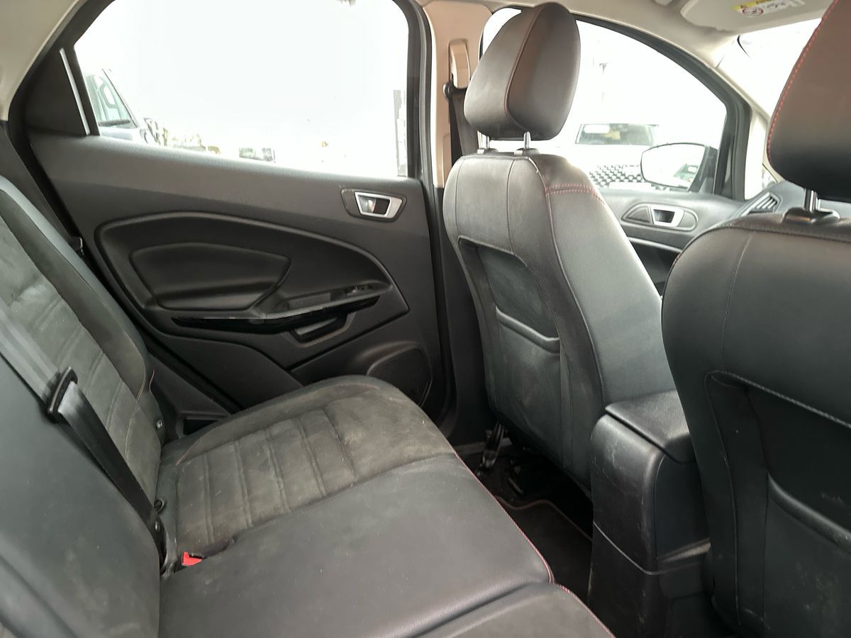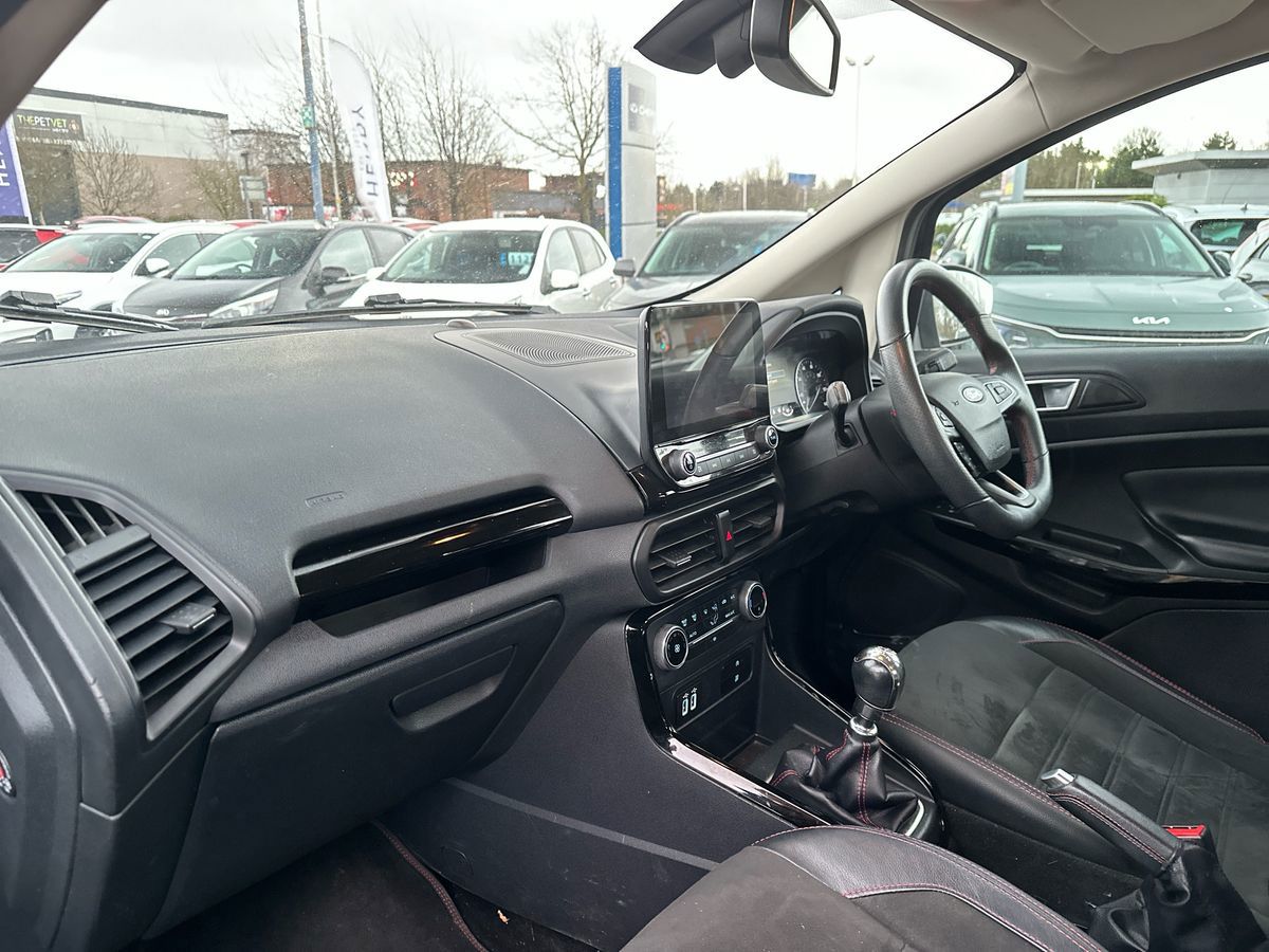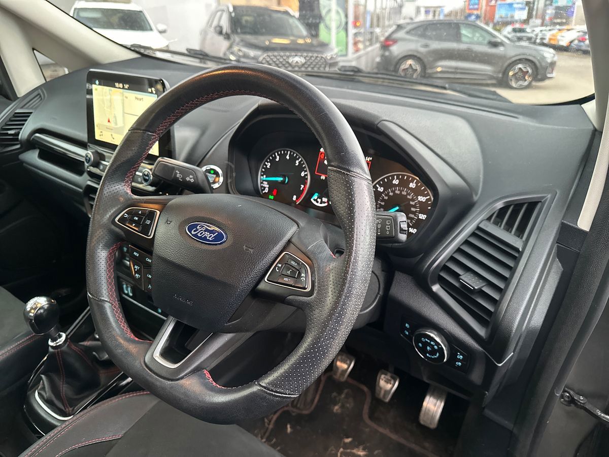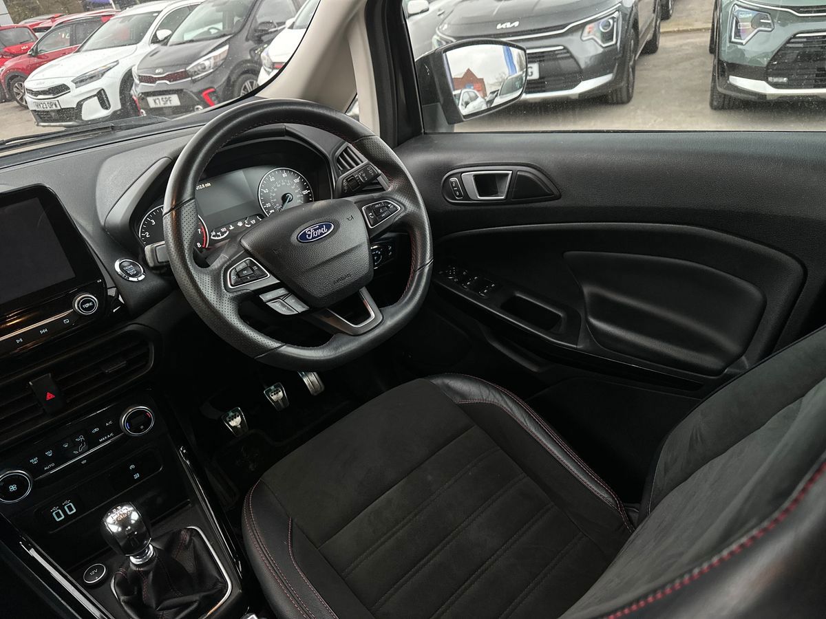"features": "Cruise control, Easy fuel capless refuelling system, PAS, SYNC 3 nav system with DAB radio, 8\" screen, voice control, emergency assistance, Apple car play/Android auto, 2x USB, Ford pass connect, Trip computer, Sports suspension, Steering wheel mounted audio controls, 'Quickclear' heated windscreen/heated washer jets, Auto dimming rear view mirror, Automatic headlights, Black roof rails, Body colour door handles, Body coloured bumpers, Electrically adjustable and heated door mirrors, Front door threshold plates with ST-Line logo, Front fog lights, Headlamps with LED day running lights, Headlight levelling control, Large rear spoiler, Power foldable door mirrors with puddle lights, Power front and rear windows with global opening/closing, Rain sensing front wipers, Rear wiper, ST-Line body styling kit, ST-Line front grille, 12V socket in front and rear, 60/40 split rear seats, 7 shade adjustable ambient lighting, Ambient light, Centre console with sliding front armrest, Cooled glovebox, Courtesy lights with map reading light, Driver seat height/lumbar adjust, Driver's side glovebox, Driver/passenger sunvisors and lidded vanity mirrors, EATC - Electronic Auto Temperature control, Folding grab handles, Footwell ambient lighting, Front head restraints, Front seat back map pockets, Front/rear floor mats, Illuminated glovebox, Illuminated luggage compartment, Isofix system on outer rear seats, Leather steering wheel/gearshift/handbrake lever with red stitching, Luggage compartment carpet, Overhead console with sunglasses holder, Partial leather upholstery, Rake adjustable rear seats, Reach + rake adjustable steering column, Rear headrests, Stainless steel sports pedals, Steering wheel with chrome inserts, Storage drawers under front seats, Tie down hooks, Variable boot floor, Rear view camera pack - Ecosport, 3x3 point rear seatbelts, ABS, Child locks on rear doors, Curtain airbags, Driver airbag, Drivers knee airbag, Electronic Stability Programme with hill launch assist, Emergency brake assist, Front passenger airbag deactivation, Front side airbags, Passenger airbag, Seatbelt reminder for driver and front passenger, Traction control, Tyre pressure monitoring system, Immobiliser, MyKey system, Remote central locking, Thatcham 1 volume sensing alarm, Tyre inflation kit, ",