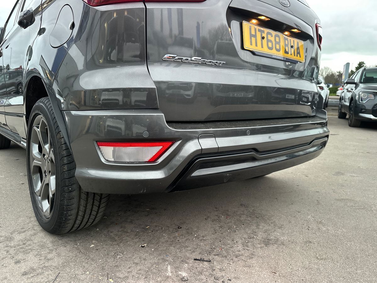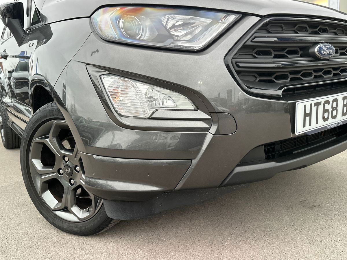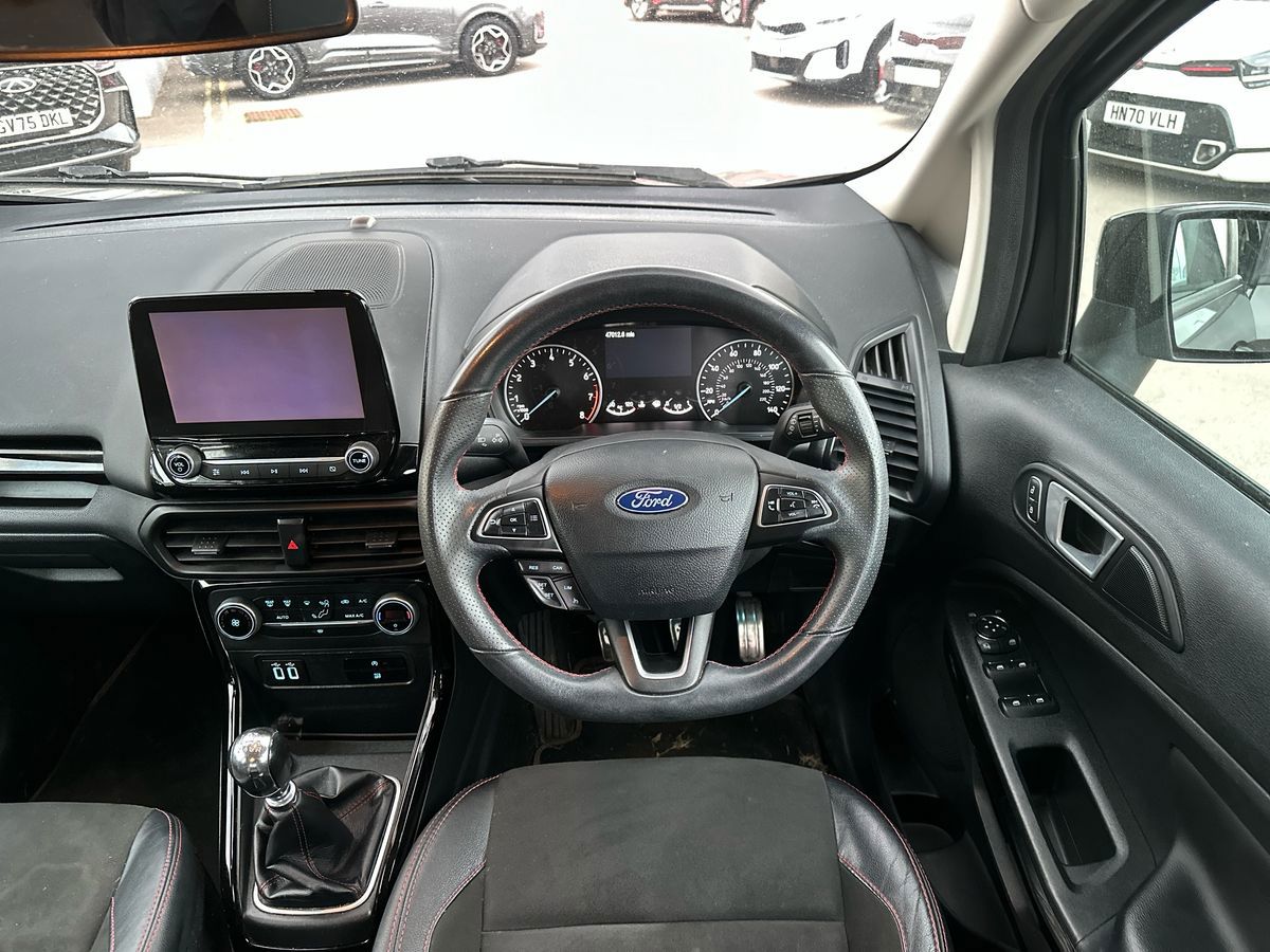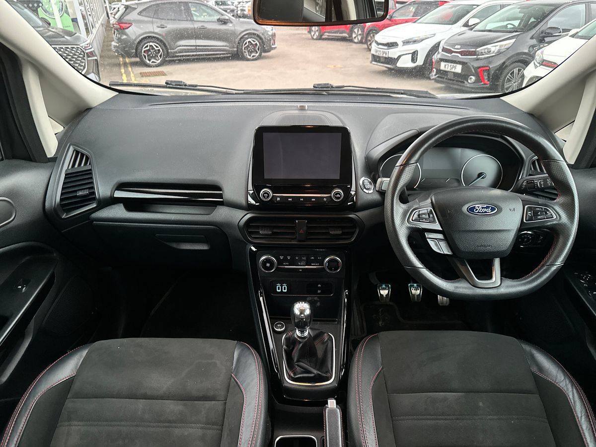 "features": "Cruise control, Easy fuel capless refuelling system, PAS, SYNC 3 nav system with DAB radio, 8\" screen, voice control, emergency assistance, Apple car play/Android auto, 2x USB, Ford pass connect, Trip computer, Sports suspension, Steering wheel mounted audio controls, 'Quickclear' heated windscreen/heated washer jets, Auto dimming rear view mirror, Automatic headlights, Black roof rails, Body colour door handles, Body coloured bumpers, Electrically adjustable and heated door mirrors, Front door threshold plates with ST-Line logo, Front fog lights, Headlamps with LED day running lights, Headlight levelling control, Large rear spoiler, Power foldable door mirrors with puddle lights, Power front and rear windows with global opening/closing, Rain sensing front wipers, Rear wiper, ST-Line body styling kit, ST-Line front grille, 12V socket in front and rear, 60/40 split rear seats, 7 shade adjustable ambient lighting, Ambient light, Centre console with sliding front armrest, Cooled glovebox, Courtesy lights with map reading light, Driver seat height/lumbar adjust, Driver's side glovebox, Driver/passenger sunvisors and lidded vanity mirrors, EATC - Electronic Auto Temperature control, Folding grab handles, Footwell ambient lighting, Front head restraints, Front seat back map pockets, Front/rear floor mats, Illuminated glovebox, Illuminated luggage compartment, Isofix system on outer rear seats, Leather steering wheel/gearshift/handbrake lever with red stitching, Luggage compartment carpet, Overhead console with sunglasses holder, Partial leather upholstery, Rake adjustable rear seats, Reach + rake adjustable steering column, Rear headrests, Stainless steel sports pedals, Steering wheel with chrome inserts, Storage drawers under front seats, Tie down hooks, Variable boot floor, Rear view camera pack - Ecosport, 3x3 point rear seatbelts, ABS, Child locks on rear doors, Curtain airbags, Driver airbag, Drivers knee airbag, Electronic Stability Programme with hill launch assist, Emergency brake assist, Front passenger airbag deactivation, Front side airbags, Passenger airbag, Seatbelt reminder for driver and front passenger, Traction control, Tyre pressure monitoring system, Immobiliser, MyKey system, Remote central locking, Thatcham 1 volume sensing alarm, Tyre inflation kit, ",
