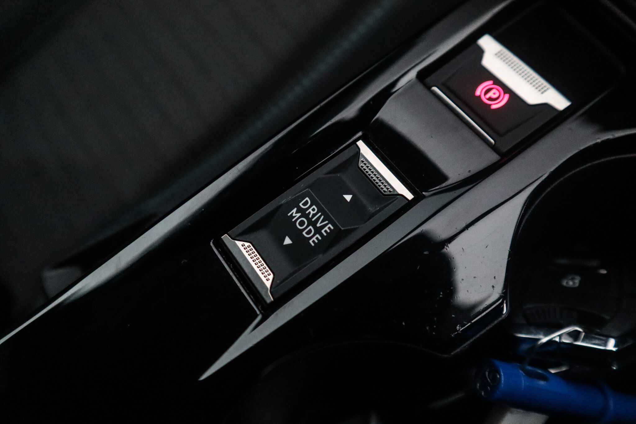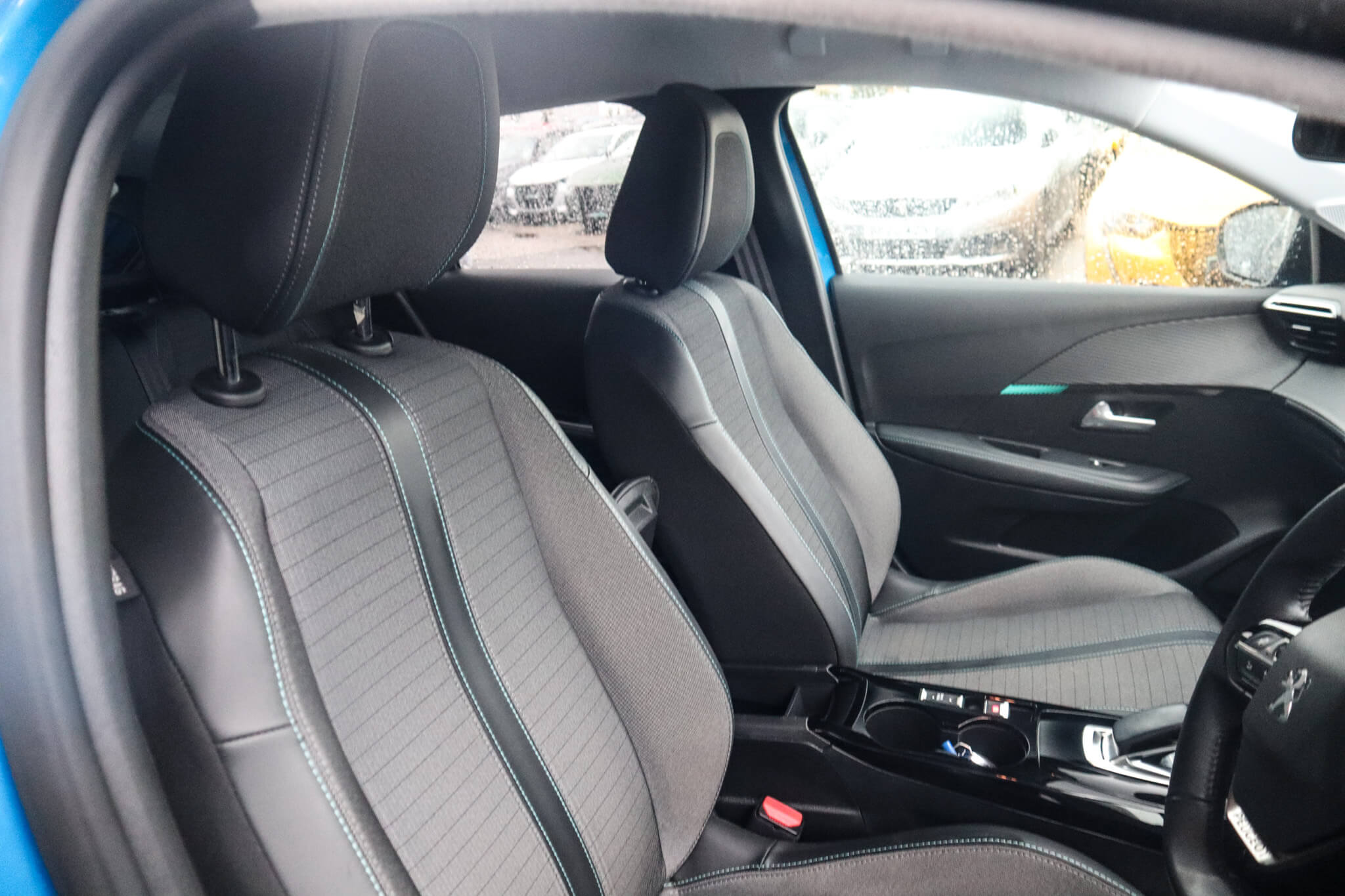 "Blue ambient lighting to front door panels, central storage and cupholders",