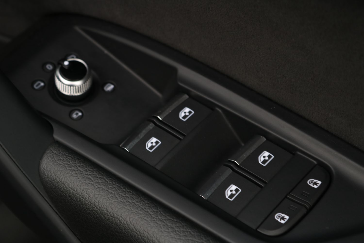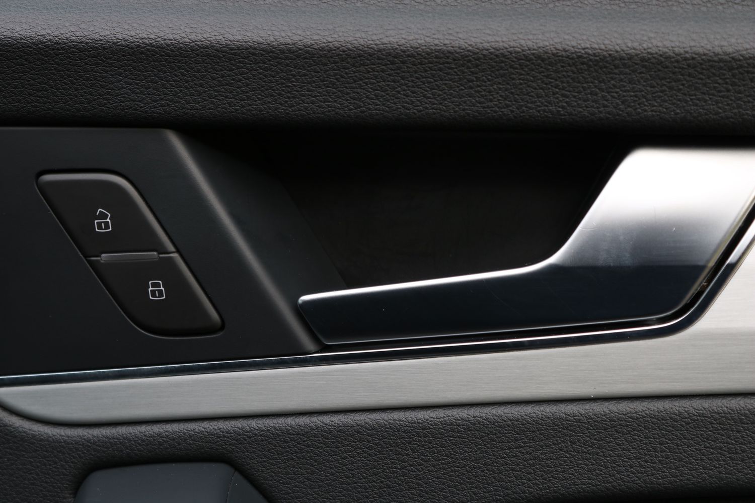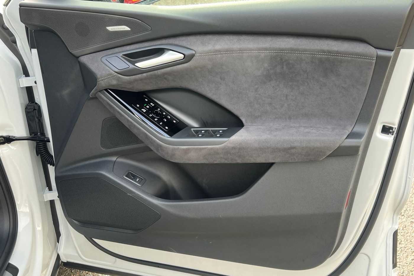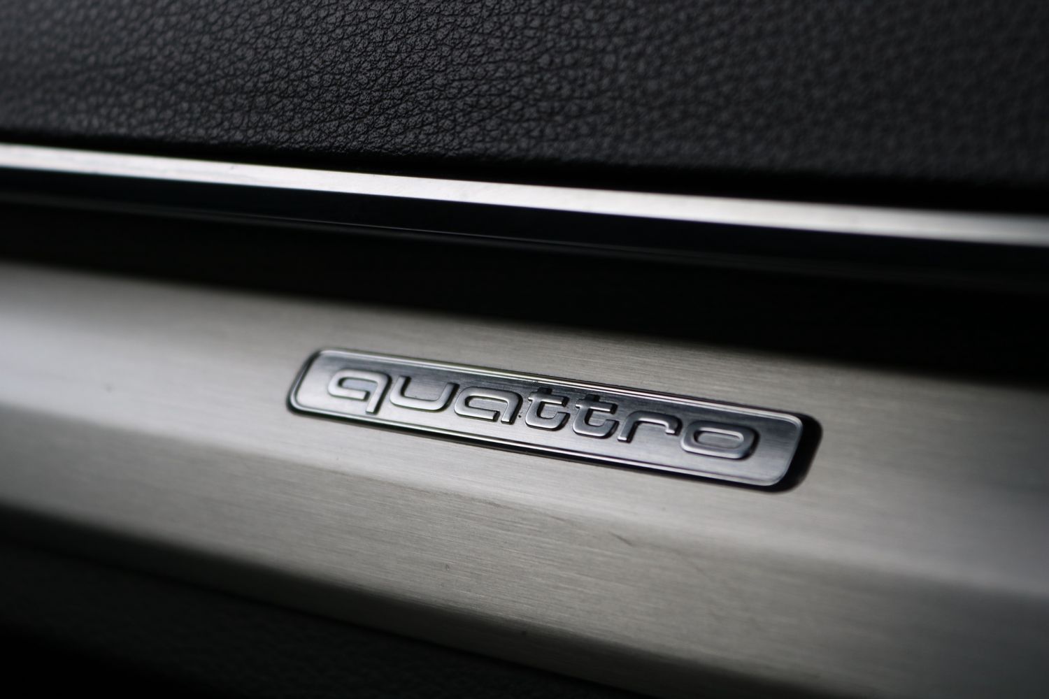 "Trim elements in the instrument panel and doors in black with contrast stitch in steel grey"
