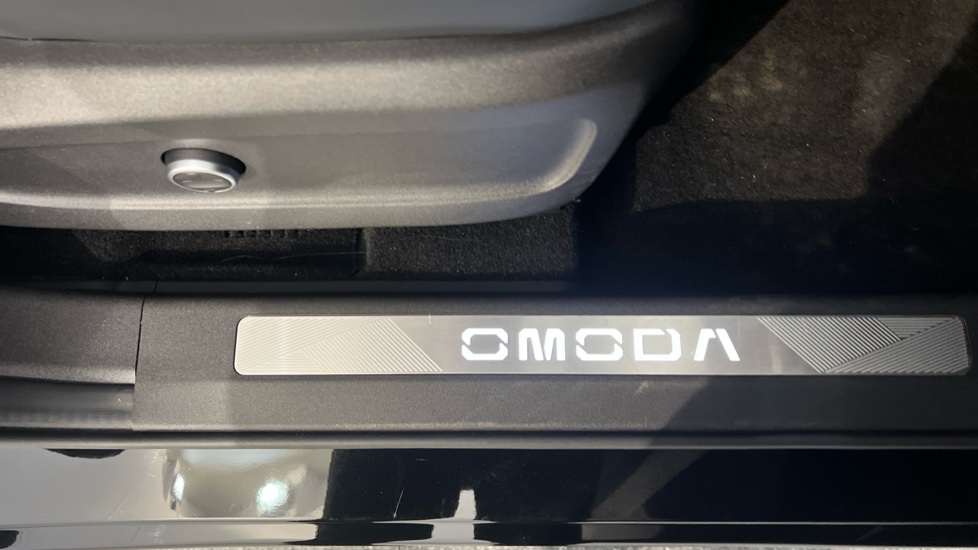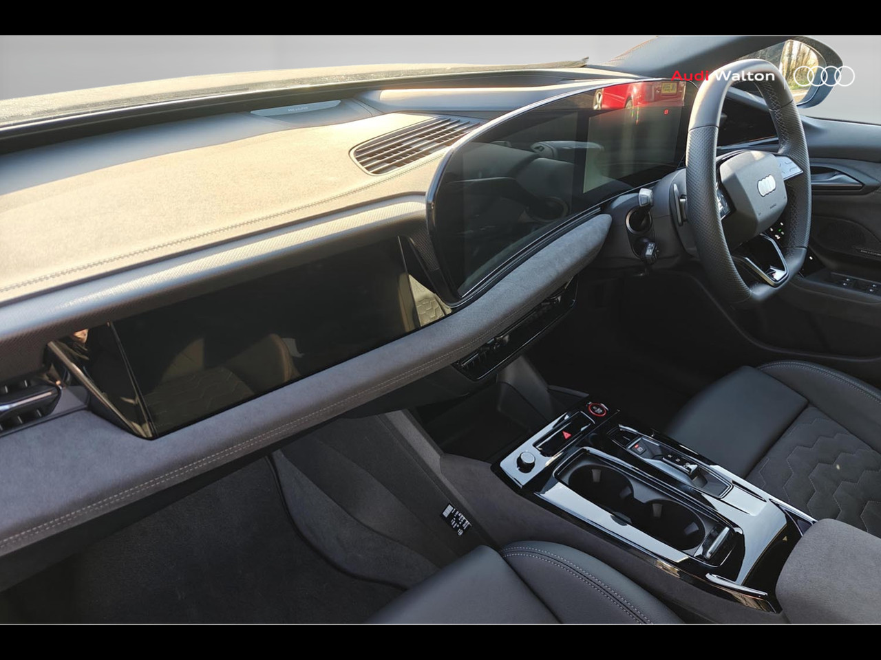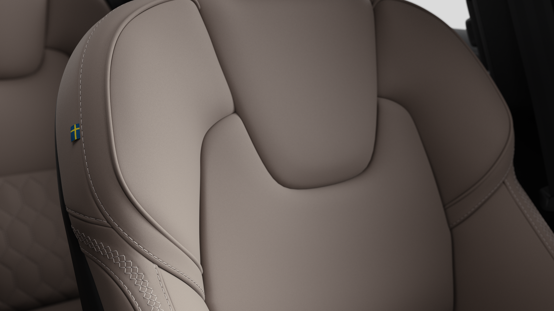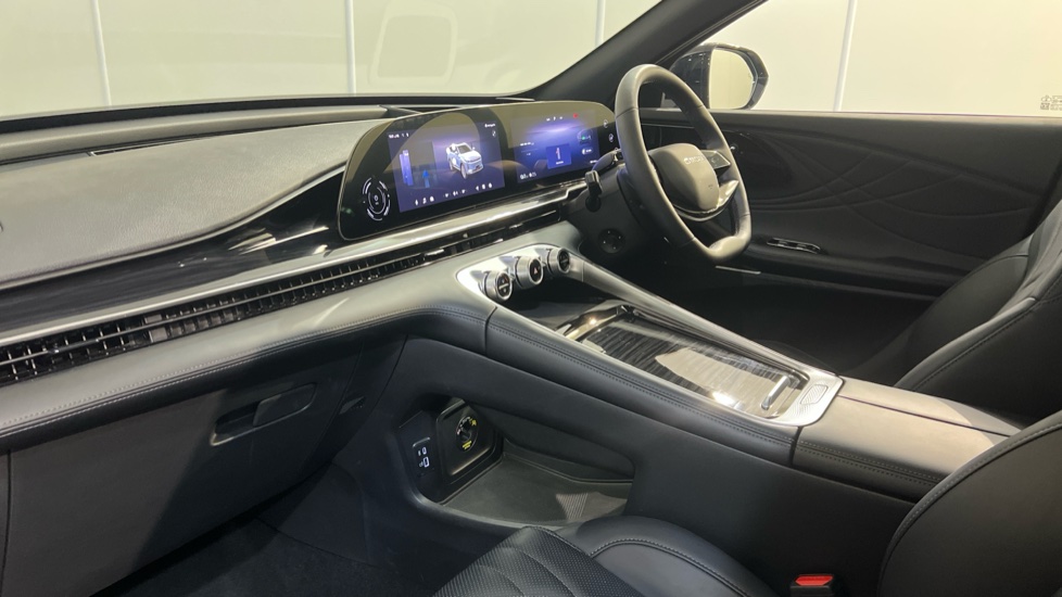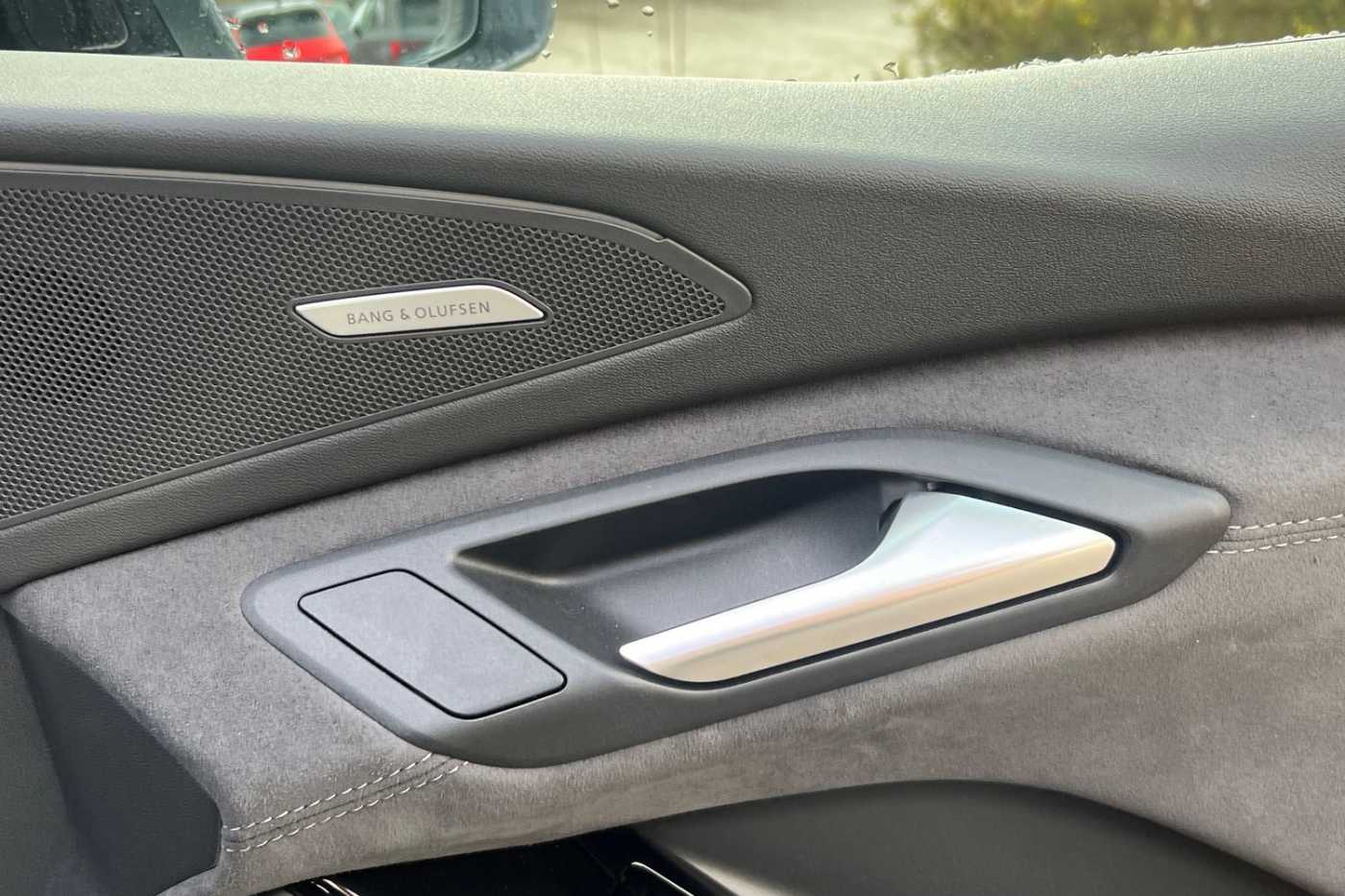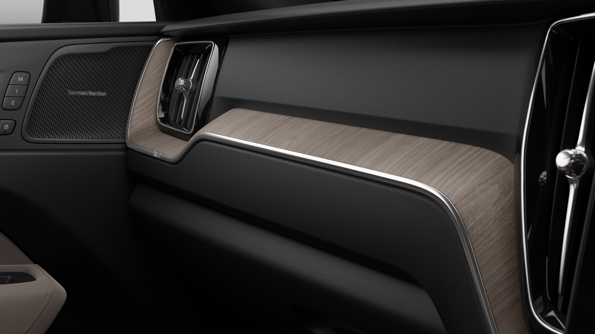 "Trim elements in the instrument panel and doors in black with contrast stitch in steel grey"