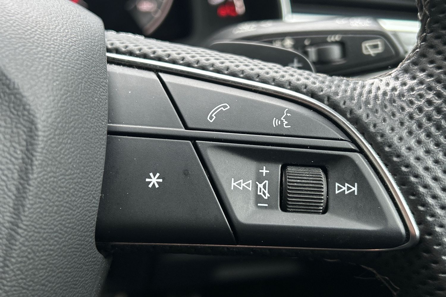 "Heated leather wrapped multi function steering wheel with satellite buttons",
