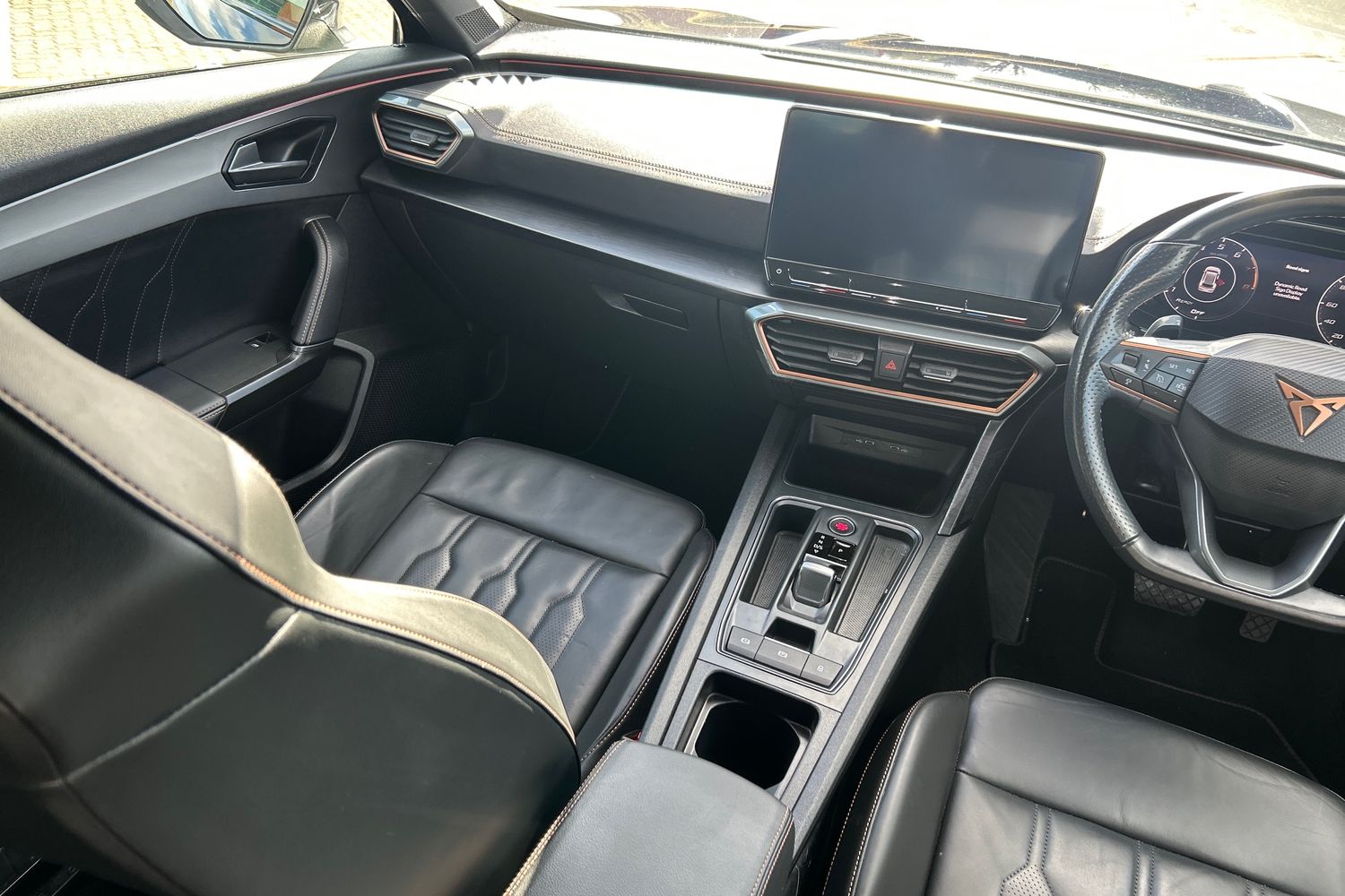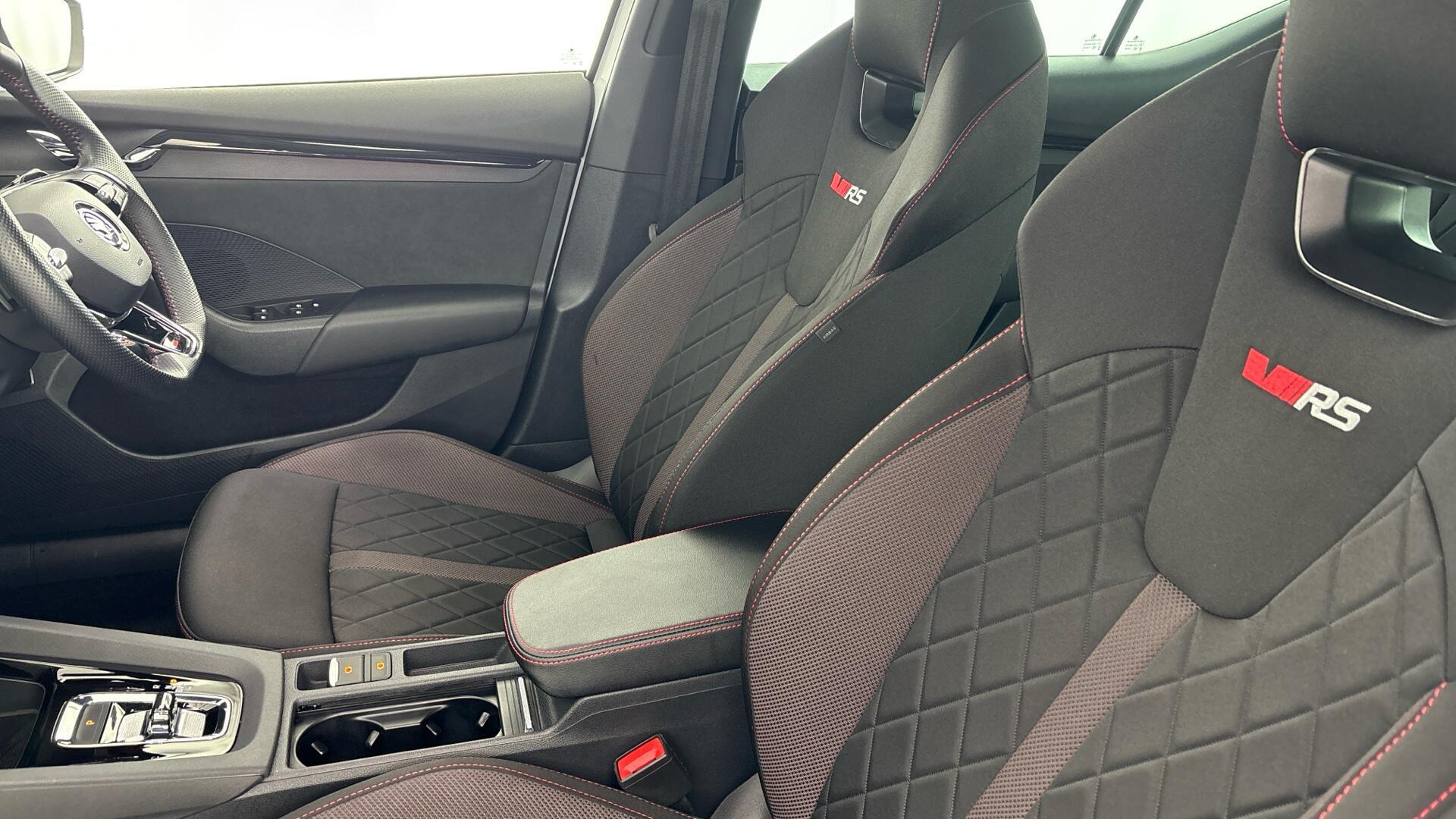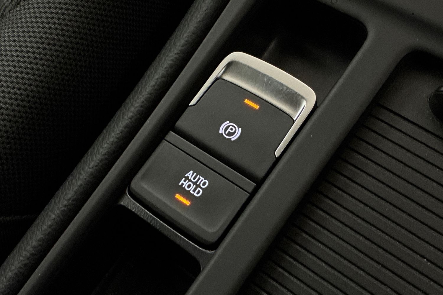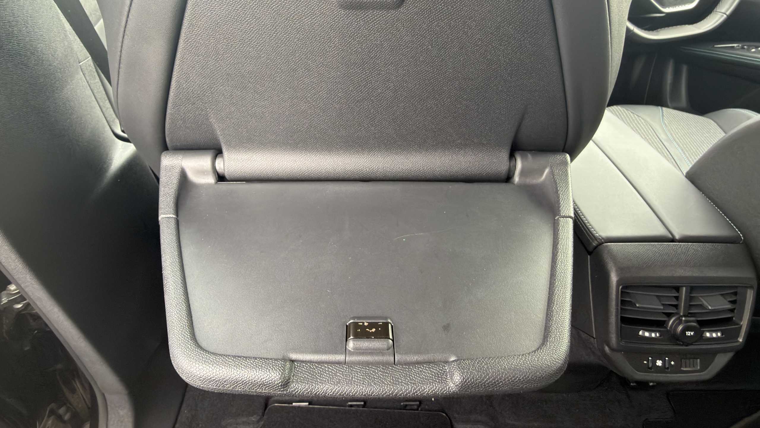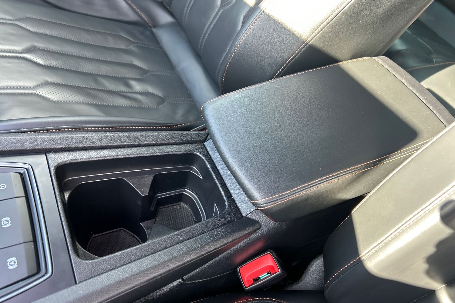 "Central front armrest with butterfly wing opening, Tramontane double stitching and illuminated storage compartment",