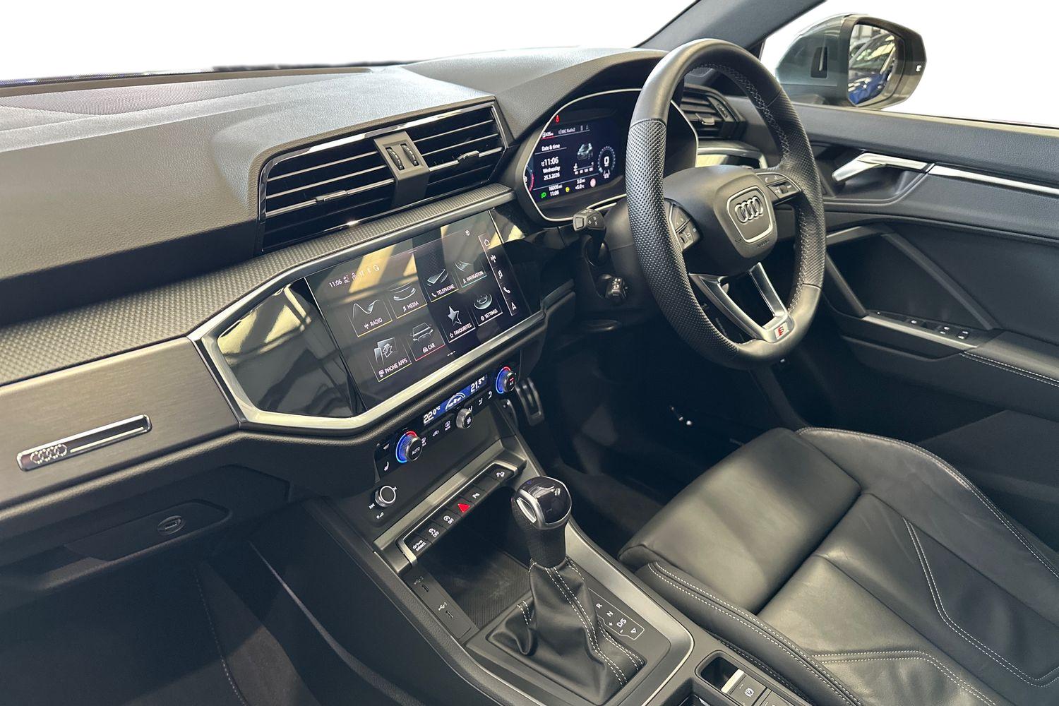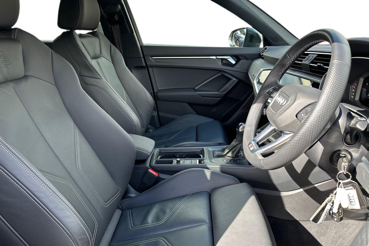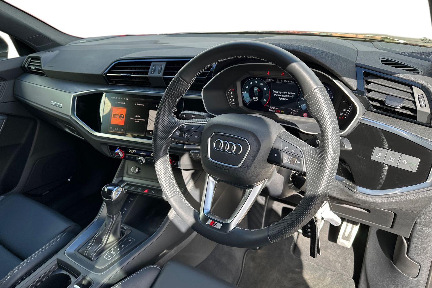 "features": "Amazon alexa Integration, Audi drive select, Audi lane departure warning, Audi Virtual Cockpit - 10.25\" display, Bluetooth interface, Camera based traffic sign recognition, Legal emergency call, MMI Navigation Plus with high resolution 10.1 inch touchscreen colour display, Power operated tailgate, Progressive steering, Service interval indicator, Smartphone interface includes wireless Apple carplay/Android Auto, Start stop system with recuperation, Voice control system with natural language interaction, Sports suspension, 2 USB-C ports with charge and data functions, 6 passive loudspeakers, DAB digital radio module, Acoustic windscreen, Aluminium roof rails, Aluminium window trim, Anthracite black radiator grille, Auto dimming frameless rear view mirror, Body colour front spoiler blade, Body coloured bumpers, Electrically folding, adjustable and heated door mirrors with integrated LED side indicators and kerb view function for passenger side, Front and rear electric windows, Front fog lights, Front side air inlets in matt platinum grey, Grille vertical bars in aluminium silver/Matt, High gloss black finish B and C pillars, LED Dynamic rear indicators, LED headlights with LED daytime running lights, LED rear lights, LED third brake light, Privacy glass dark tinted rear and rear-side windows (from B-pillar backwards), Rain and light sensors, Rear diffuser grille in grained matt black, Rear diffuser strip in matt anthracite black, Rear side wing doors, Rear wiper, S line badges on front wings, S Line front and rear bumpers, Side skirt insert in matt Platinium grey, Variable front intermittent wipers, 12V socket in rear centre console, 3 seat bench in 2nd row, 3 spoke leather multifunction steering wheel features S badging and grips in perforated leather with contrast stitching, 40:20:40 folding with manual adjustment for 60:40 forwards/backwards position and backrest angle, Adjustable rear seat bench/backrest with centre armrest and cupholder, Black cloth headlining, Dual zone electronic climate control, Front and rear black floor mats with contrast stitching in rock grey, Front and rear headrests, Front and rear roof module including reading lights, Front centre armrest, Glove compartment lighting, Height and reach adjustable steering wheel, Illuminated door sill trims with S logo, ISOFIX child seat mounting for front passenger with airbag deactivation and outer rear seat including top tether attachment point for outer rear seats, Luggage compartment light, Manual front seats with height adjustment, Perforated leather gearknob, Single front passenger seat, Stainless steel luggage compartment sill finisher, Stainless steel pedals, Ambient lighting pack - Q3, Non smoking pack - Q3, 3x3 point rear seatbelts, 6 airbags - Driver, front passenger, curtain and side windows, Audi pre-sense front with pedestrain and cyclist recognition, Electrically operated child locks on rear doors, Electromechanical parking brake, Electronic stabilisation control including ABS, ASR and EDL, Front seatbelt reminder, Hill descent control, Hill hold assist, Pre sense basic, Seatbelt monitoring, Tyre pressure warning, Warning triangle and first aid kit, Anti theft alarm, Anti theft wheel bolts, Immobiliser, Remote central locking, Aluminium look interior elements, Dark matt brushed aluminium inlay, Detail dashboard around MMI touch colour display in glass look, black with surround in aluminium look, Leatherette door armrest, ",