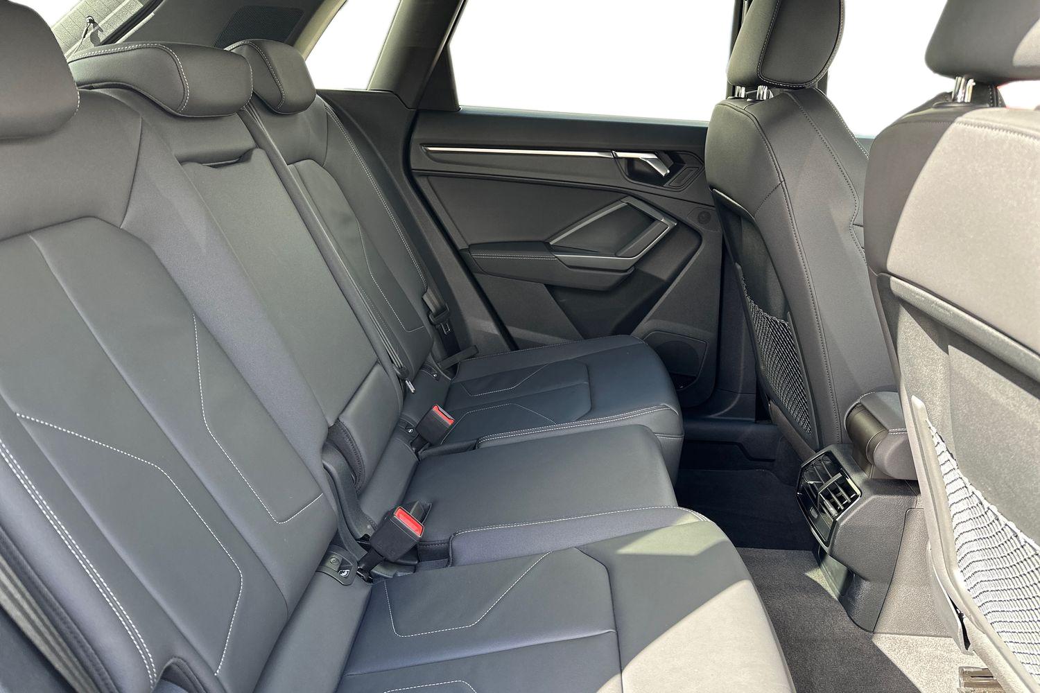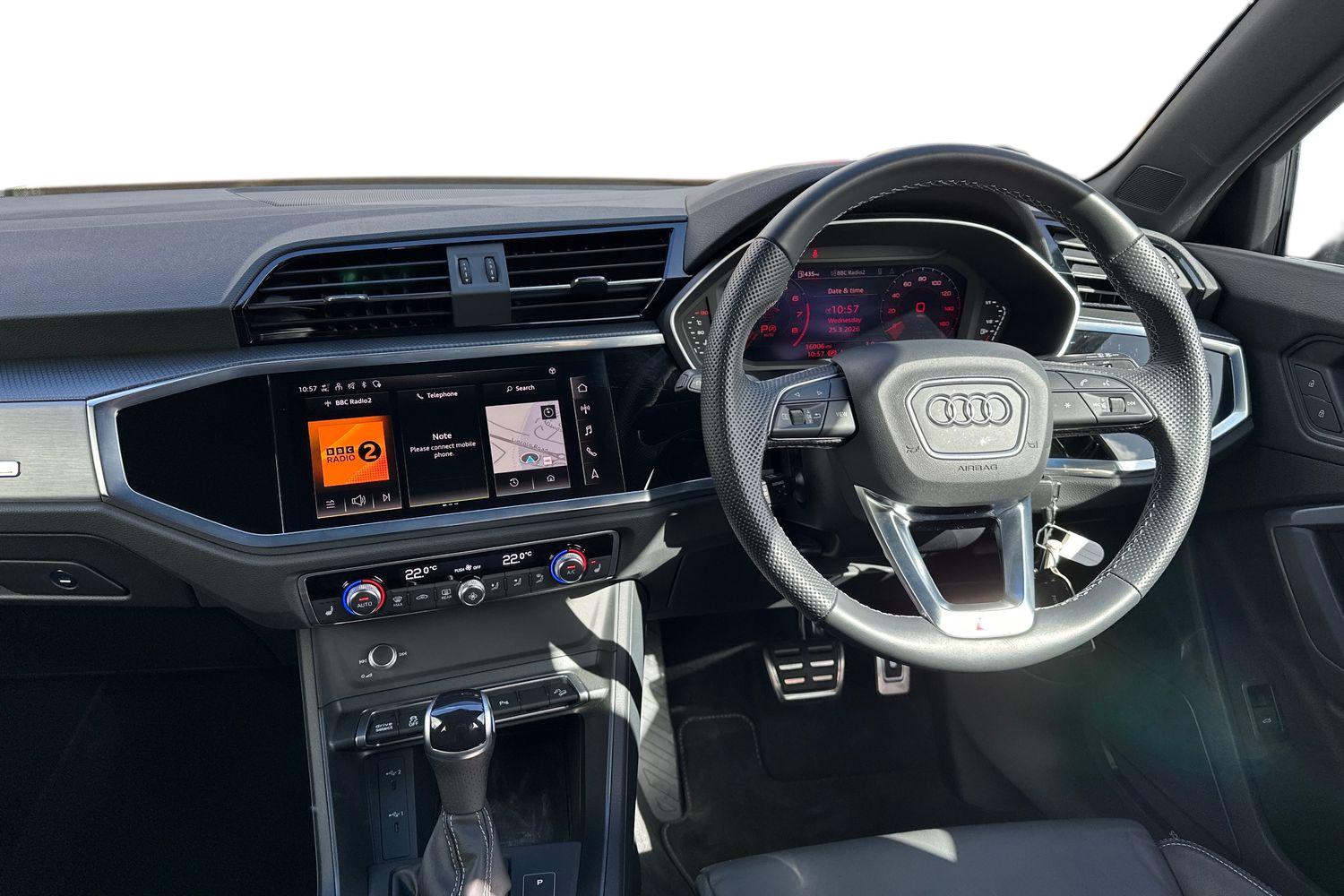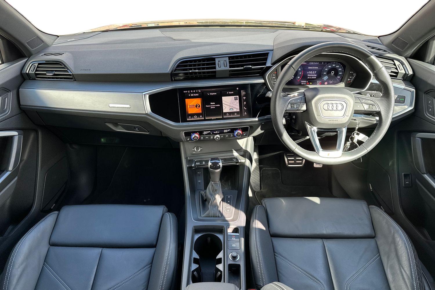 "features": "Amazon alexa Integration, Audi drive select, Audi lane departure warning, Audi Virtual Cockpit - 10.25\" display, Bluetooth interface, Camera based traffic sign recognition, Legal emergency call, MMI Navigation Plus with high resolution 10.1 inch touchscreen colour display, Power operated tailgate, Progressive steering, Service interval indicator, Smartphone interface includes wireless Apple carplay/Android Auto, Start stop system with recuperation, Voice control system with natural language interaction, Sports suspension, 2 USB-C ports with charge and data functions, 6 passive loudspeakers, DAB digital radio module, Acoustic windscreen, Aluminium roof rails, Aluminium window trim, Anthracite black radiator grille, Auto dimming frameless rear view mirror, Body colour front spoiler blade, Body coloured bumpers, Electrically folding, adjustable and heated door mirrors with integrated LED side indicators and kerb view function for passenger side, Front and rear electric windows, Front fog lights, Front side air inlets in matt platinum grey, Grille vertical bars in aluminium silver/Matt, High gloss black finish B and C pillars, LED Dynamic rear indicators, LED headlights with LED daytime running lights, LED rear lights, LED third brake light, Privacy glass dark tinted rear and rear-side windows (from B-pillar backwards), Rain and light sensors, Rear diffuser grille in grained matt black, Rear diffuser strip in matt anthracite black, Rear side wing doors, Rear wiper, S line badges on front wings, S Line front and rear bumpers, Side skirt insert in matt Platinium grey, Variable front intermittent wipers, 12V socket in rear centre console, 3 seat bench in 2nd row, 3 spoke leather multifunction steering wheel features S badging and grips in perforated leather with contrast stitching, 40:20:40 folding with manual adjustment for 60:40 forwards/backwards position and backrest angle, Adjustable rear seat bench/backrest with centre armrest and cupholder, Black cloth headlining, Dual zone electronic climate control, Front and rear black floor mats with contrast stitching in rock grey, Front and rear headrests, Front and rear roof module including reading lights, Front centre armrest, Glove compartment lighting, Height and reach adjustable steering wheel, Illuminated door sill trims with S logo, ISOFIX child seat mounting for front passenger with airbag deactivation and outer rear seat including top tether attachment point for outer rear seats, Luggage compartment light, Manual front seats with height adjustment, Perforated leather gearknob, Single front passenger seat, Stainless steel luggage compartment sill finisher, Stainless steel pedals, Ambient lighting pack - Q3, Non smoking pack - Q3, 3x3 point rear seatbelts, 6 airbags - Driver, front passenger, curtain and side windows, Audi pre-sense front with pedestrain and cyclist recognition, Electrically operated child locks on rear doors, Electromechanical parking brake, Electronic stabilisation control including ABS, ASR and EDL, Front seatbelt reminder, Hill descent control, Hill hold assist, Pre sense basic, Seatbelt monitoring, Tyre pressure warning, Warning triangle and first aid kit, Anti theft alarm, Anti theft wheel bolts, Immobiliser, Remote central locking, Aluminium look interior elements, Dark matt brushed aluminium inlay, Detail dashboard around MMI touch colour display in glass look, black with surround in aluminium look, Leatherette door armrest, ",