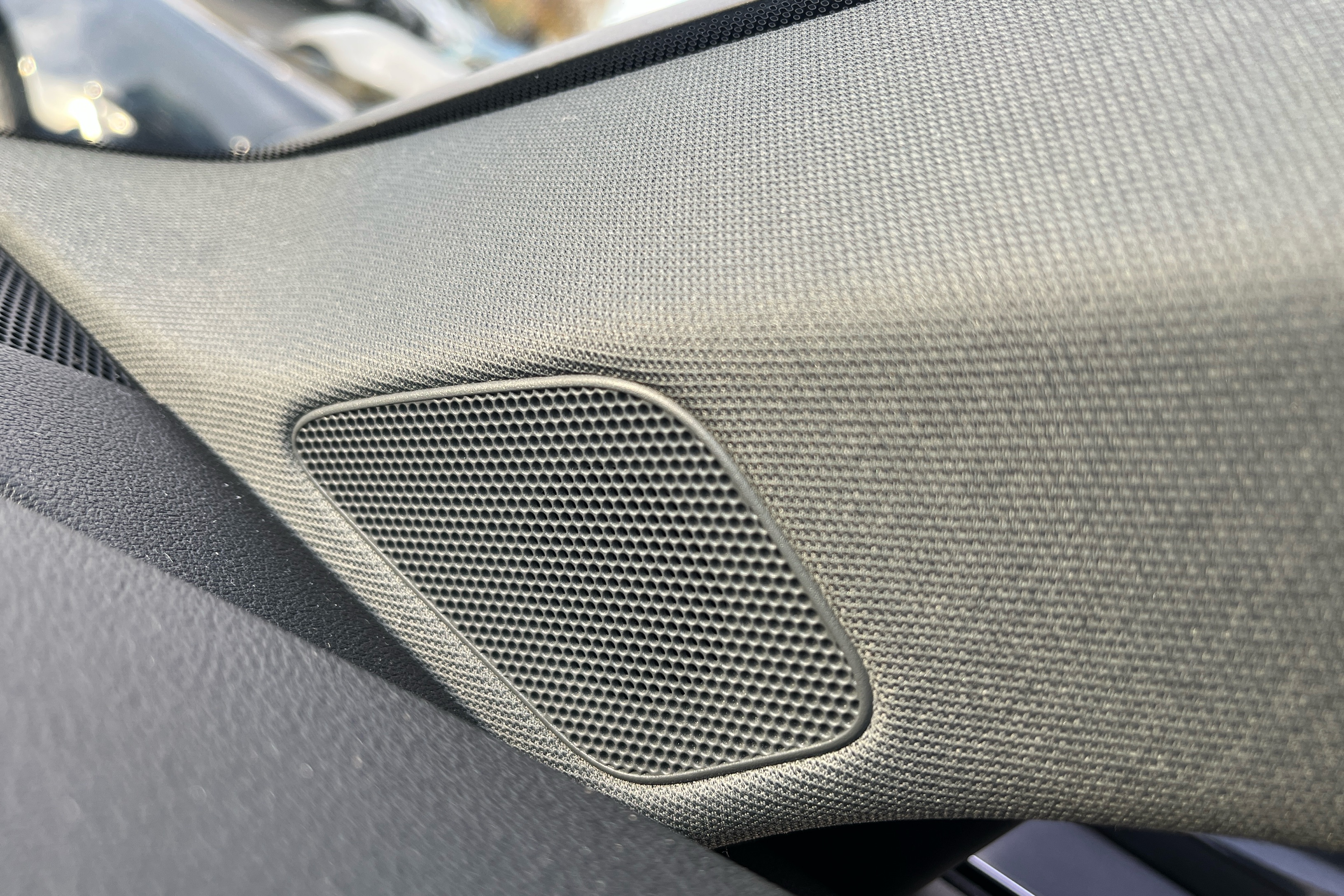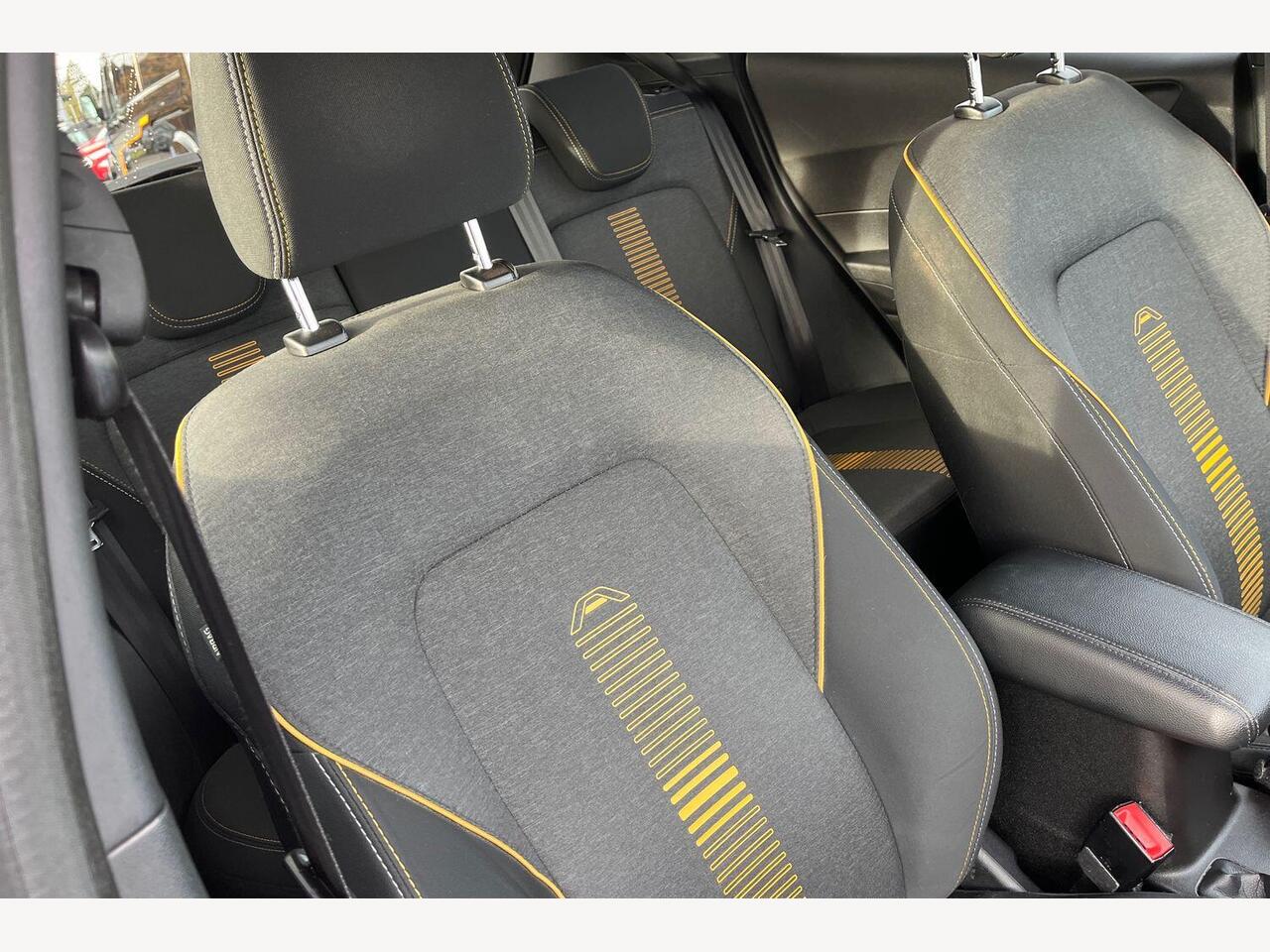 "Cloth upholstery with black and metallic grey syntech leather inserts",