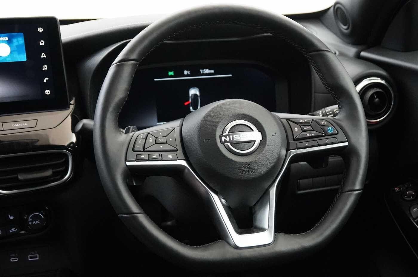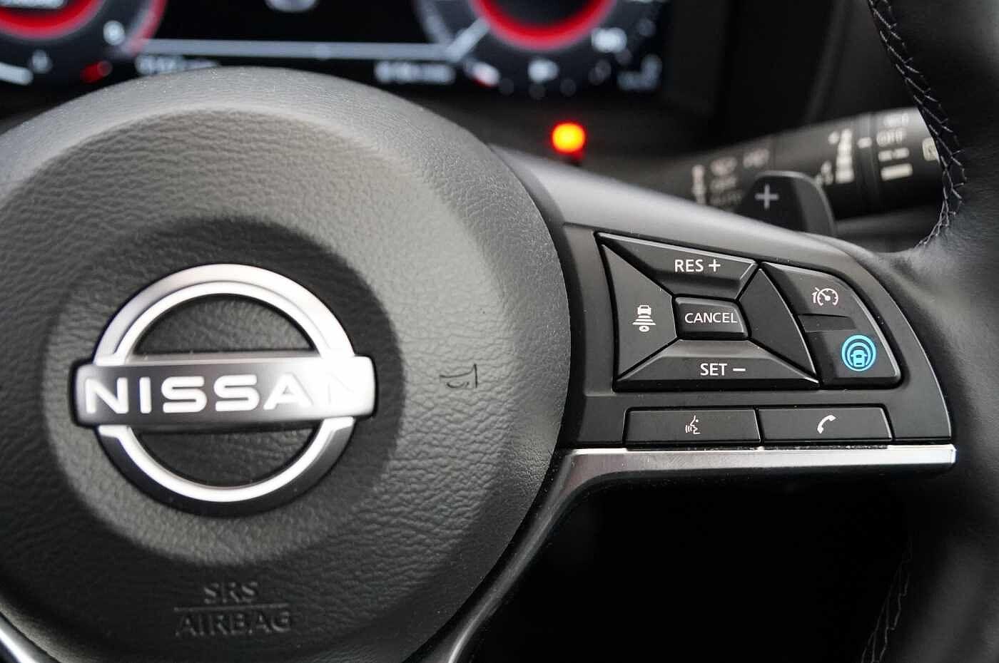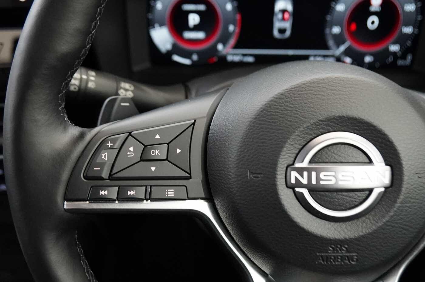 "features": "12.3\" full colour TFT screen combimeter, Drive modes select (Eco, normal and sport), Emergency and breakdown call, Front parking sensor, Idle start/stop system, Intelligent driver alert system, Intelligent lane intervention, Lane departure warning system, Nissan connect 12.3\" touch screen entertainment system, Nissan connect nav with TomTom traffic, Nissan connect services and Wifi connection, Outside temperature sensor, Power Steering, Rear parking sensor, Stop/start button, Traffic sign recognition, Trip computer, Voice recognition, Wireless Apple CarPlay and Google Android auto, Wireless Smartphone charger, 2 X Rear console USB port, 6 speakers, Bluetooth system, USB, Aux-in and 12V socket, DAB Digital radio, Auto dimming frameless rear view mirror, Automatic hazard signal with emergency stop signal, Body colour door handles, Electrically adjustable door mirrors with integrated indicators, Follow me home headlights, Front and rear electric window with one touch driver window, Heated and auto folding door mirrors, High beam assist, LED 3rd brake light, LED daytime running lights, LED headlamps, LED rear fog lamp, LED rear lamps, One touch passenger window, Rain sensor windscreen wipers, Rear privacy glass, Rear side wing doors, Rear wiper, Roof spoiler, Shark fin roof antenna in solid Black, Three blink turn signal, 3 height adjustable rear headrests, 3 seat bench in 2nd row, 60/40 split folding rear seat, Automatic climate control, Card holder on driver sunvisor, Cloth/Synthetic leather with melange fabric inserts, Driver side rear coat hanger, Driver/passenger sunvisors and vanity mirrors, Front and rear cabin lights, Front armrest, Front door pockets with bottle holders, Front head restraints, Front/rear passenger grab handles, Height adjustable driver's seat, Internal chrome door handles, Leather gearshift knob, Leather steering wheel, Luggage board, Luggage space lighting, Monoform sporty seats, Multifunction steering wheel, Rear door bottle holders, Single front passenger seat, Steering wheel mounted gearshift paddles, Synthetic leather kneepad, Telescopic steering wheel adjustment, Two cupholders in front centre console, Two rear isofix child seat anchorage points with top tether, Welcome light and console tray ambient lighting, ABS with EBD and brake assist, Active ride control, Active Trace Control, Driver and passenger airbags, Driver and passenger side airbags, Electric handbrake with auto hold function, Electronic Stability Programme (ESP), Front and rear curtain airbags, Height adjustable seatbelts, Hill start assist, Intelligent emergency braking with pedestrian and cyclist recognition, Rear door child safety locks, Seatbelt reminder for driver/front passenger and rear seats, Three 3 point rear seatbelts, Traction control, Tyre pressure monitoring system, VDC Dynamic Vehicle Control, Alarm, Immobiliser, Intelligent key and start push button with walk away lock and approach unlock functions, Remote central locking, 17\" Alloy wheels, ",