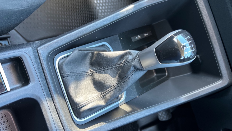 "Leather gear shift with satin chrome on gear shift console",