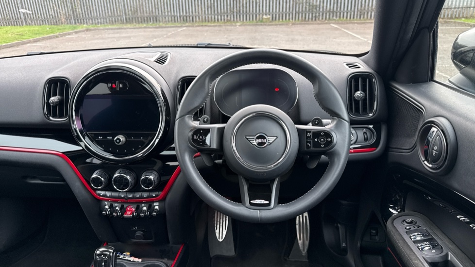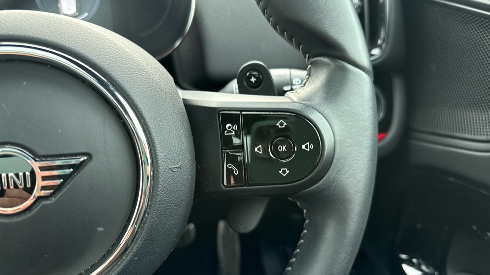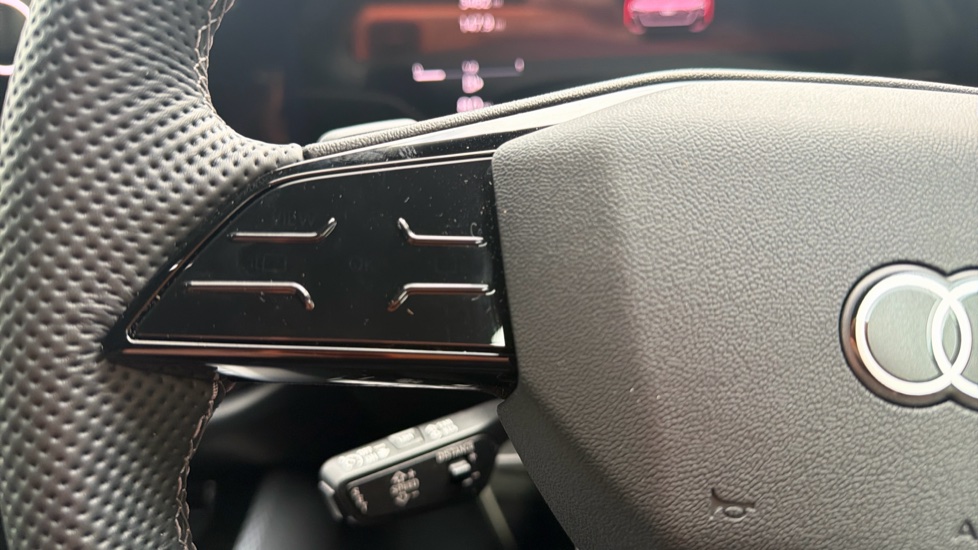 "3 spoke flat bottom leather steering wheel with satin chrome effect bezel",
