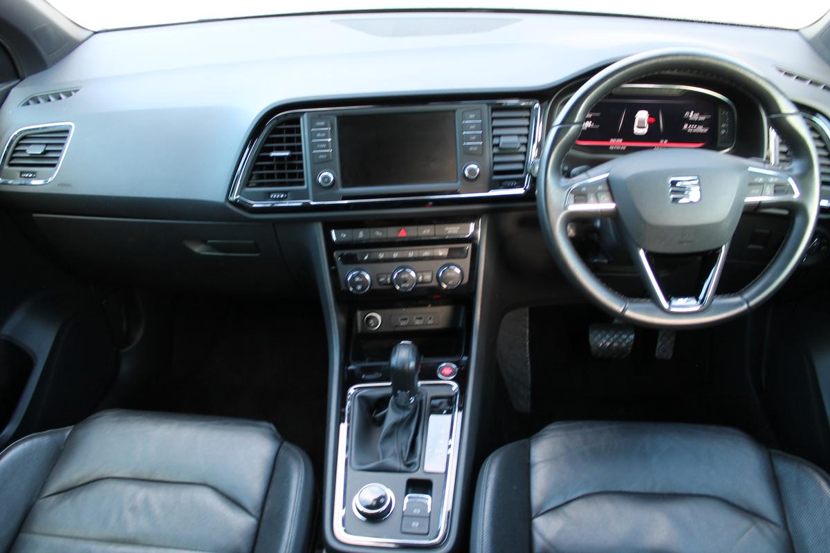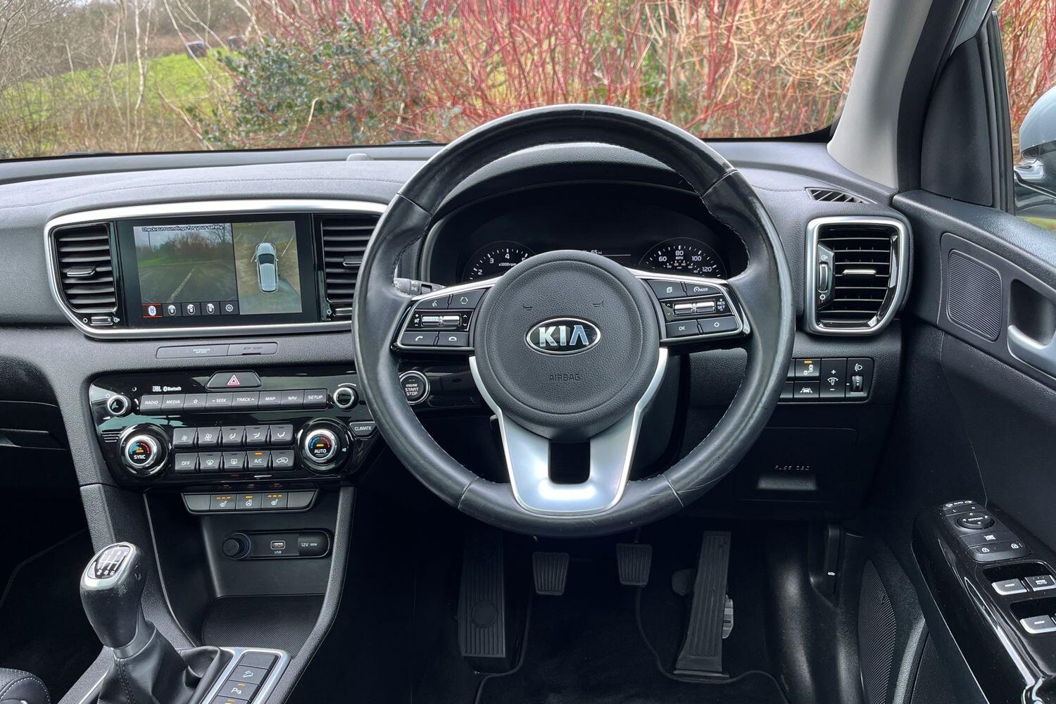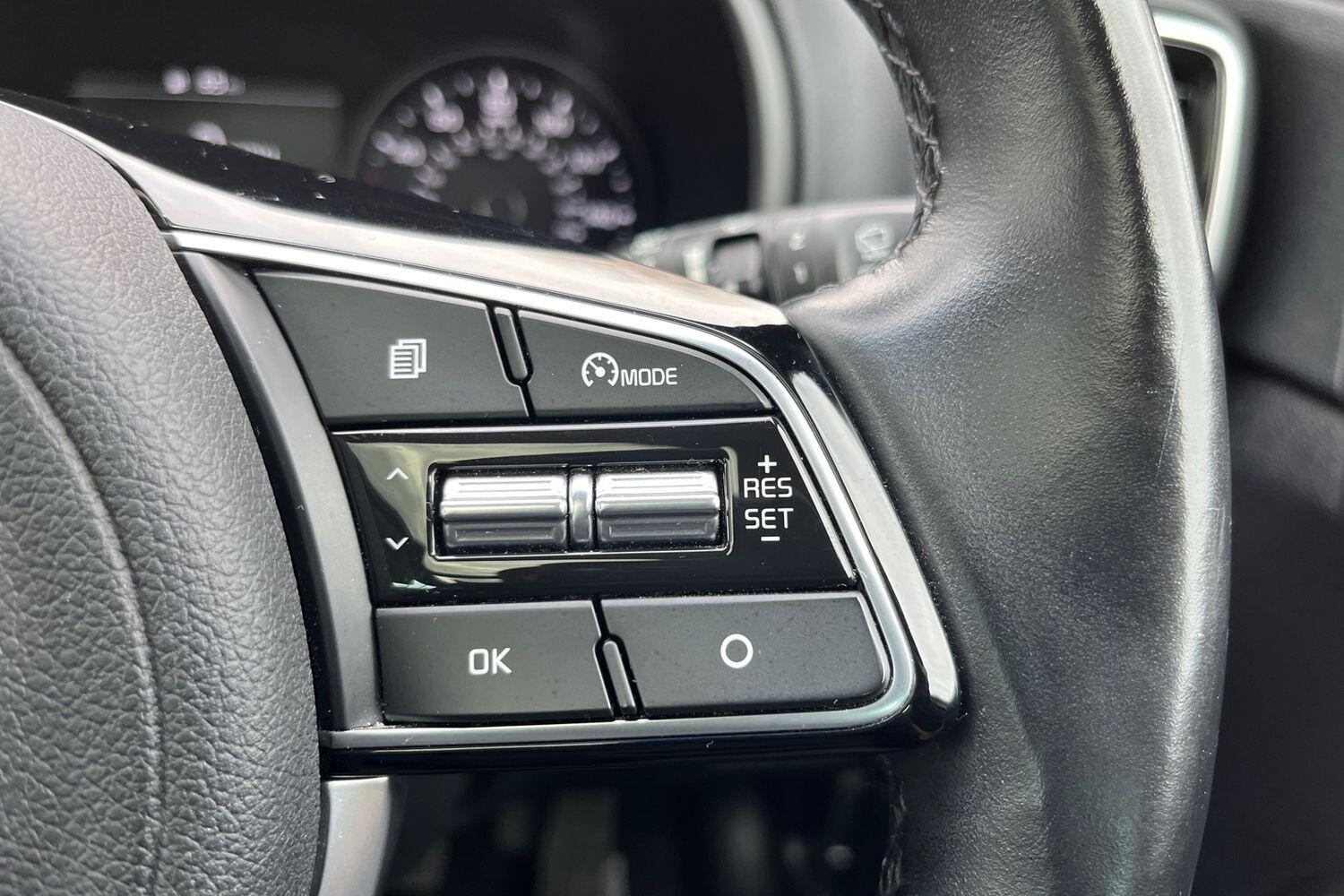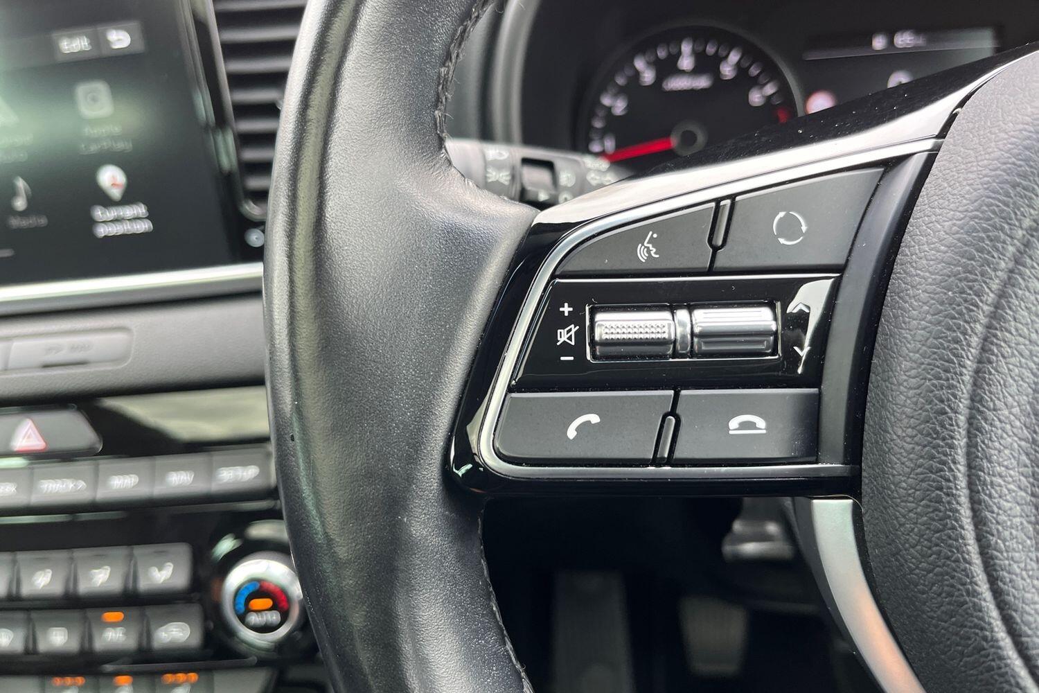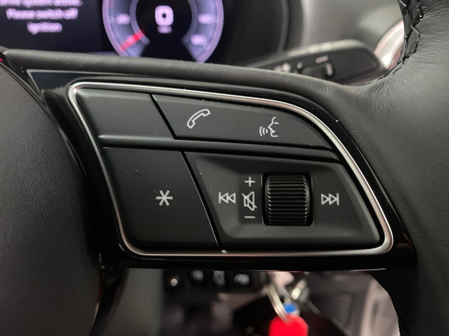 "3 spoke flat bottomed leather steering wheel with red stitching",