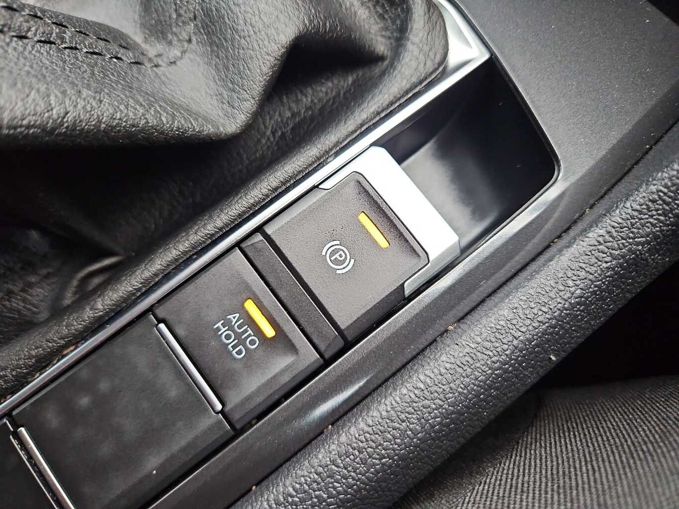 "Cloth upholstery with red stitching",